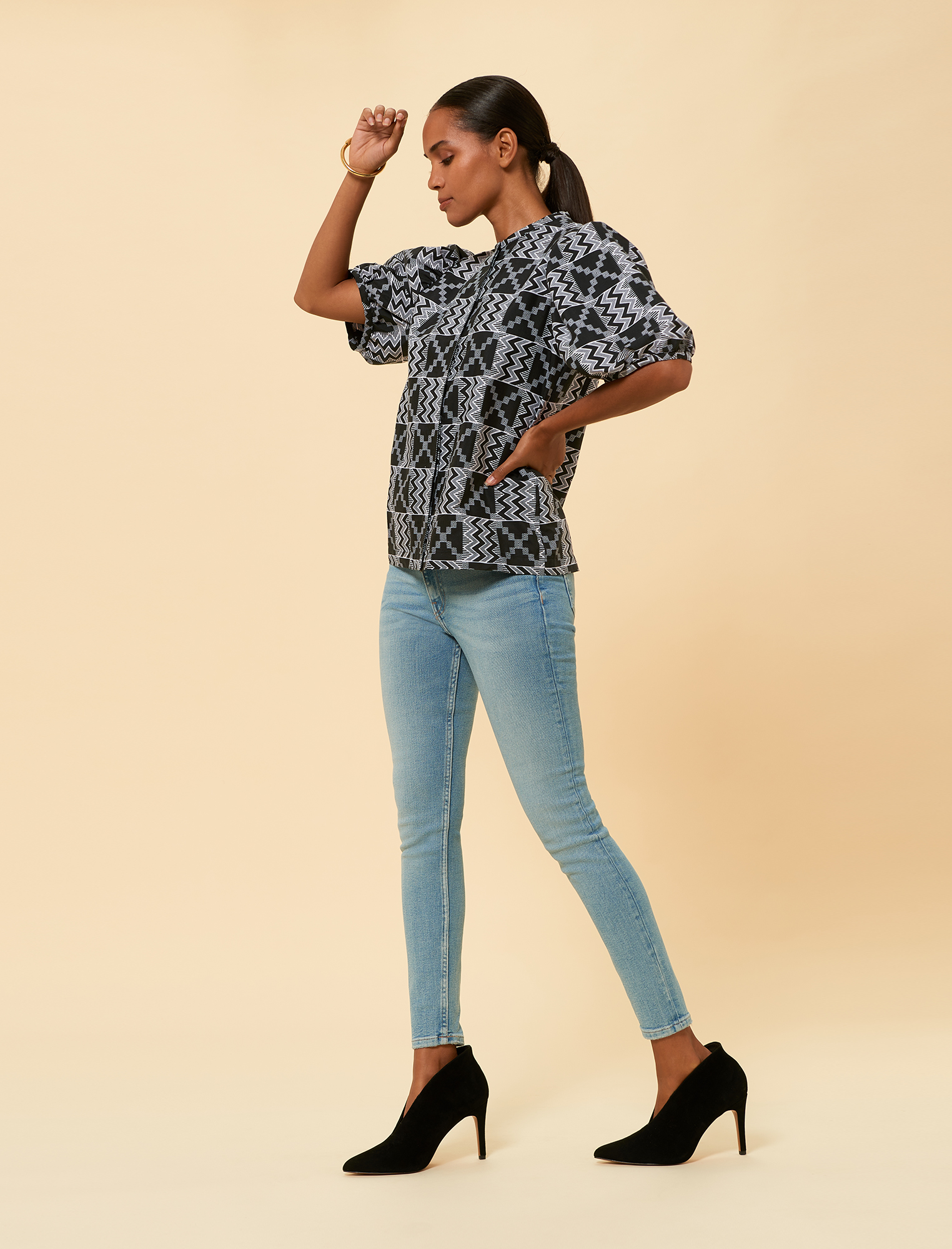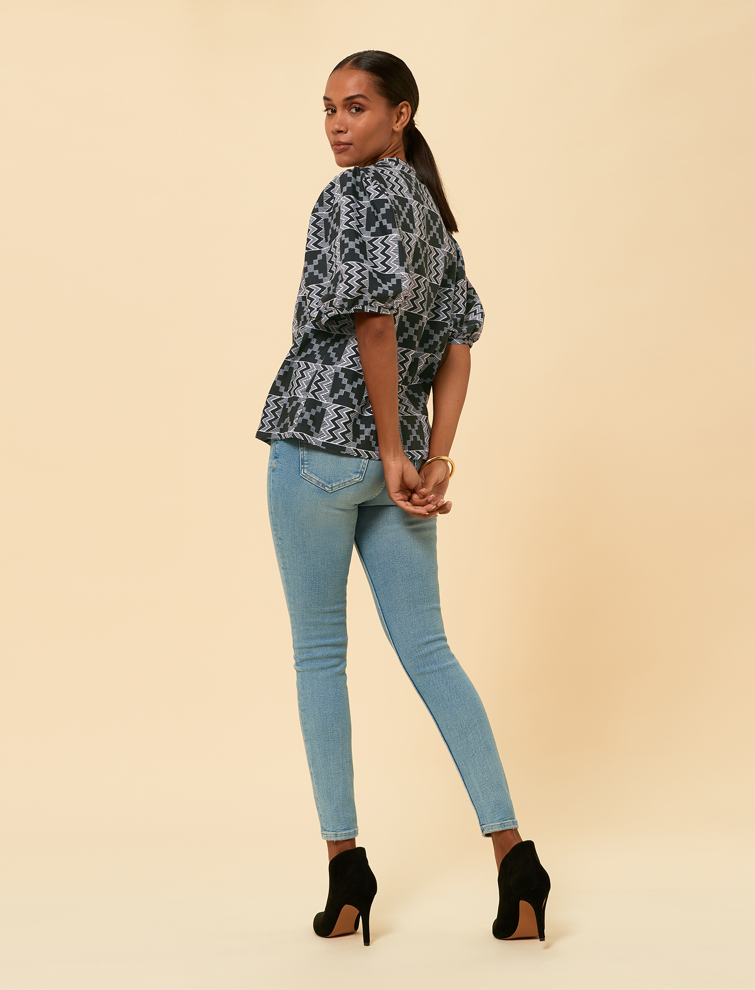 The fabric is a wax print featuring a sophisticated black and white color scheme. It showcases a complex geometric pattern with zigzag and cross motifs, adding depth and visual interest. The lightweight and breathable material ensures comfort, making it perfect for all-day wear.