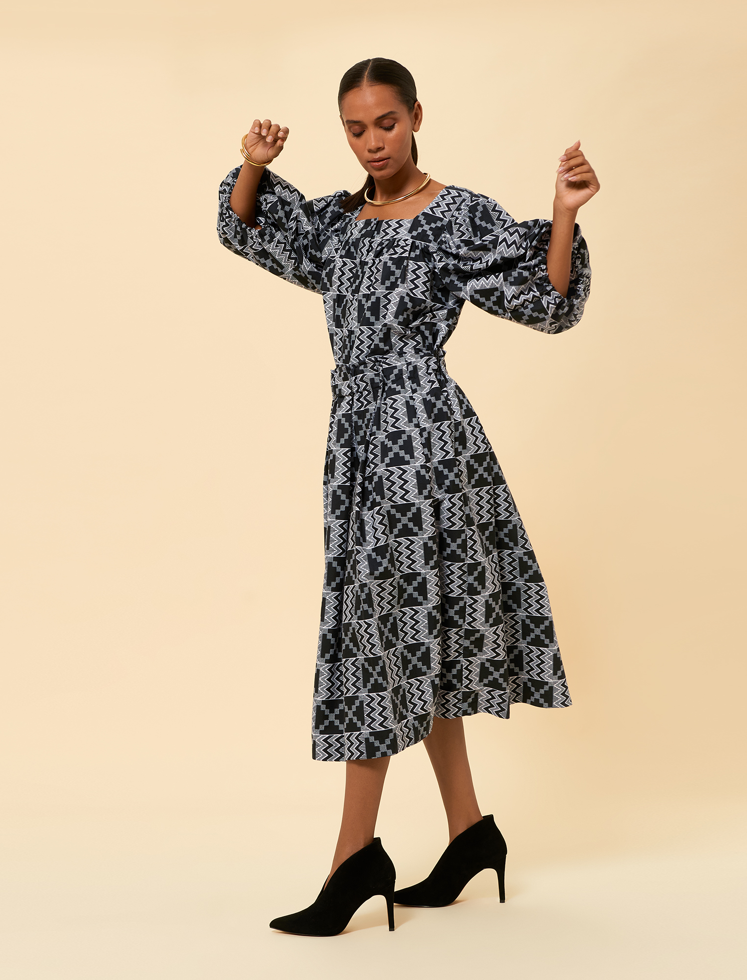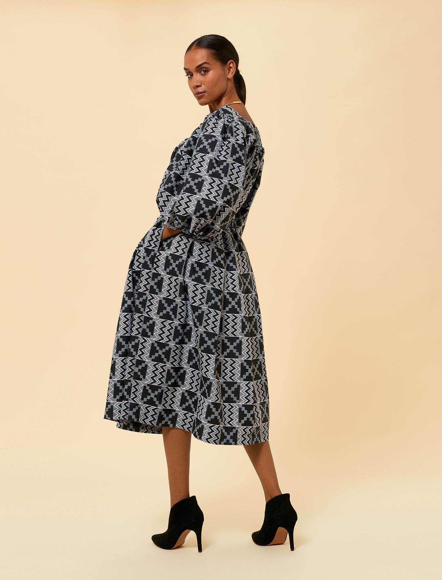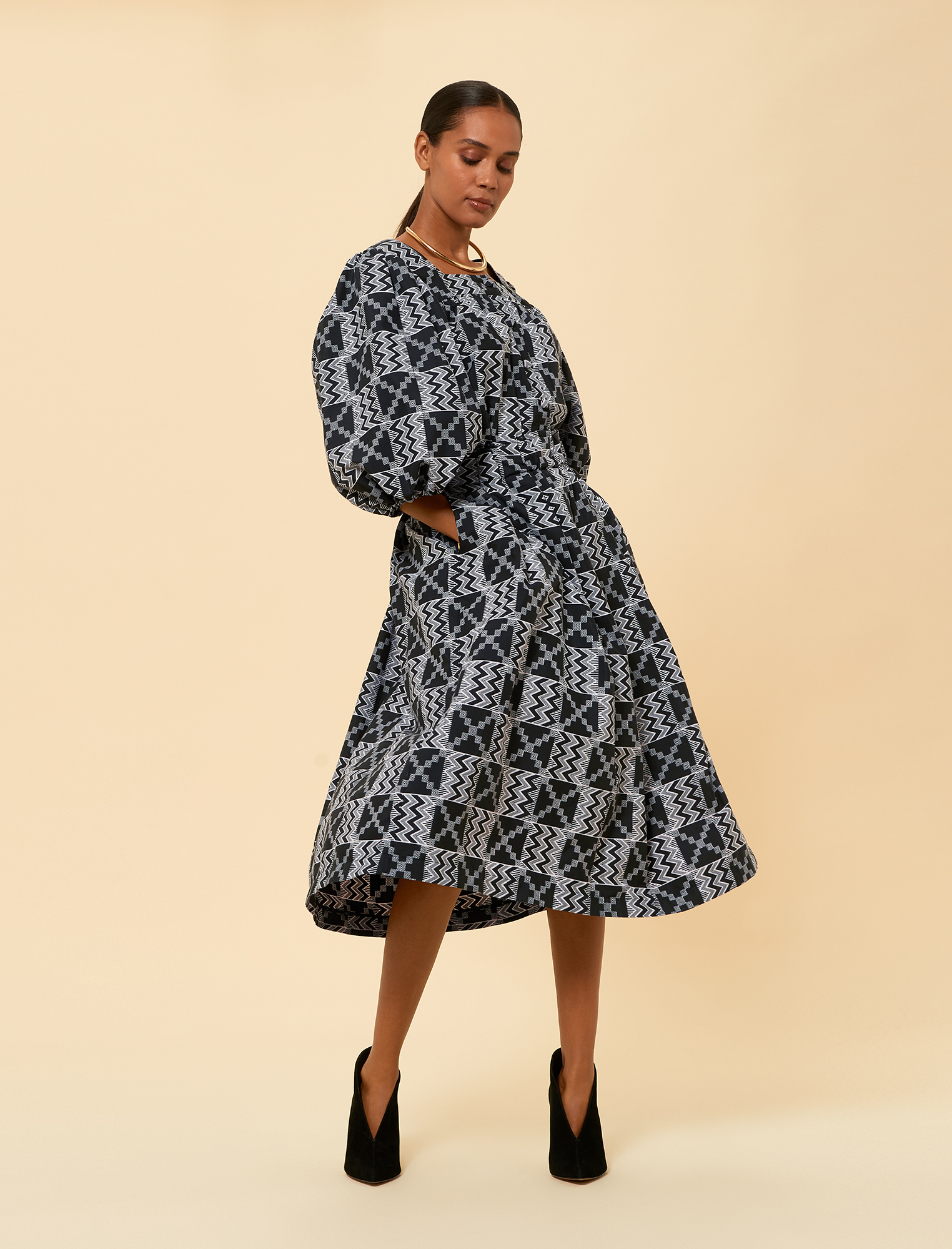 The fabric is a wax print featuring a sophisticated black and white colour scheme. It showcases a complex geometric pattern with zigzag and cross motifs, adding depth and visual interest. The lightweight and breathable material ensures comfort, making it perfect for all-day wear.