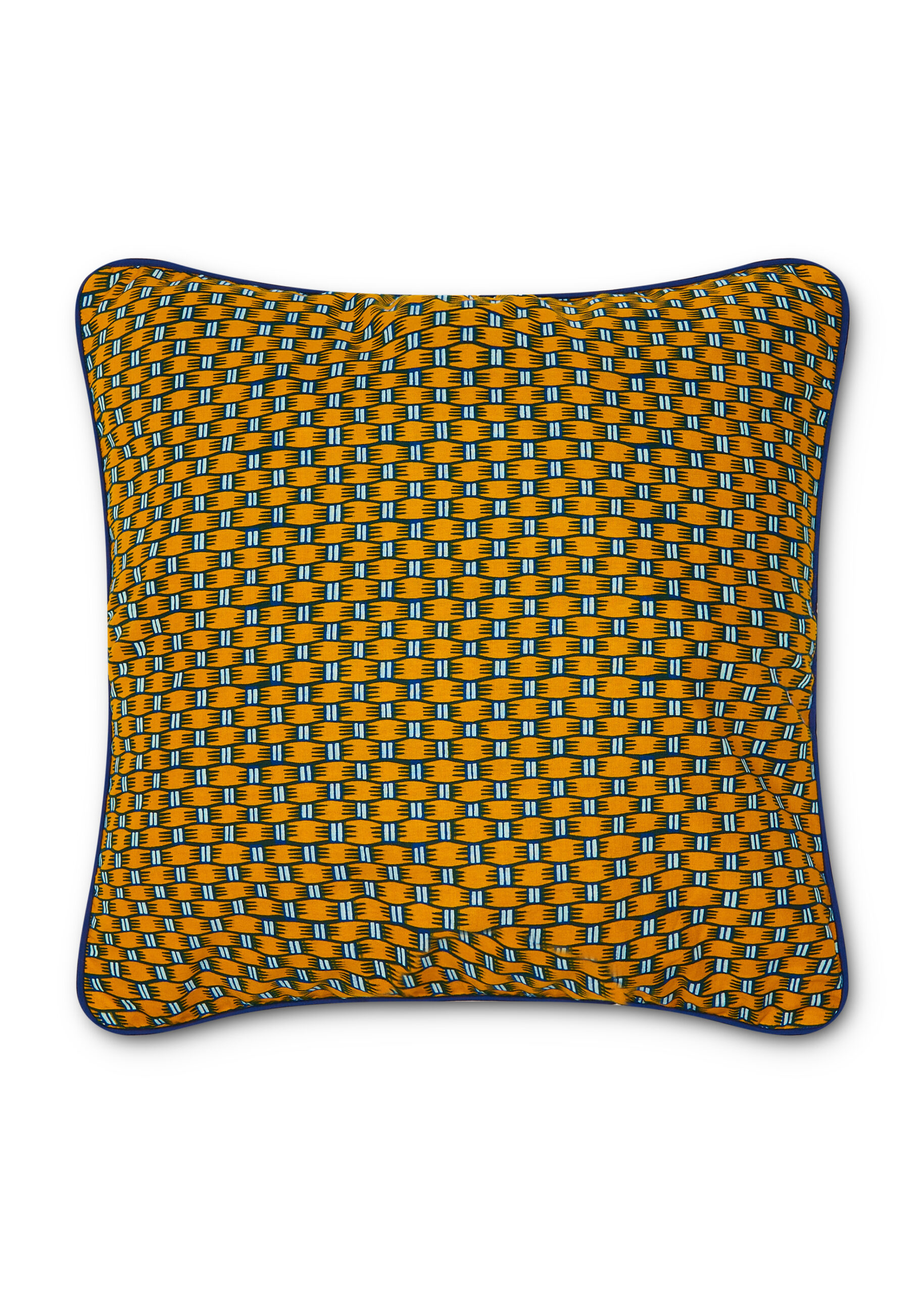 • Print and Colour: A rich mustard yellow background is intricately woven with geometric patterns in black, white, and blue, creating a visually striking and dynamic look.