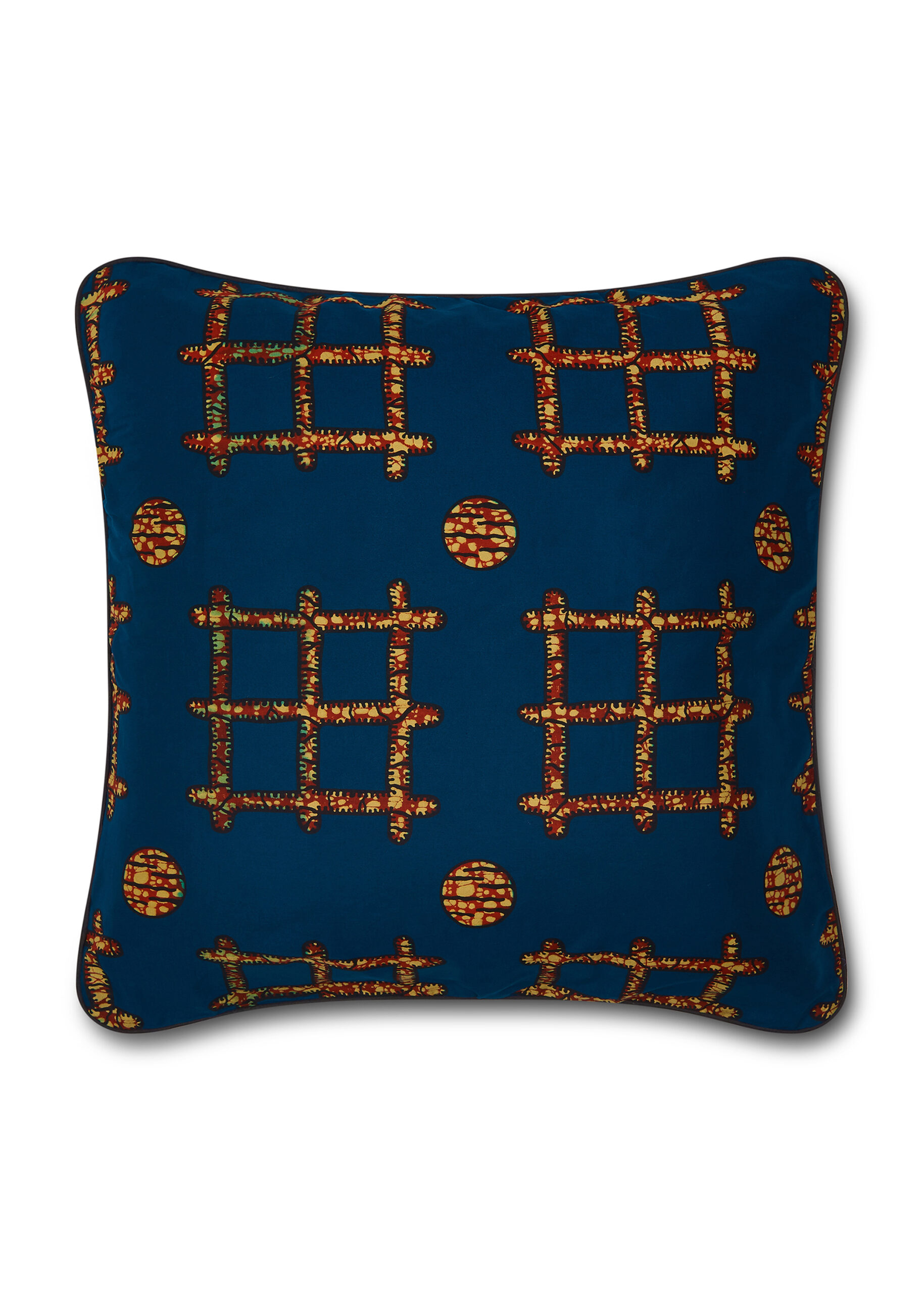 - Print and Colour: A deep navy blue background adorned with a grid pattern in shades of orange and yellow, interspersed with small circular motifs, adds a structured yet lively visual appeal.
