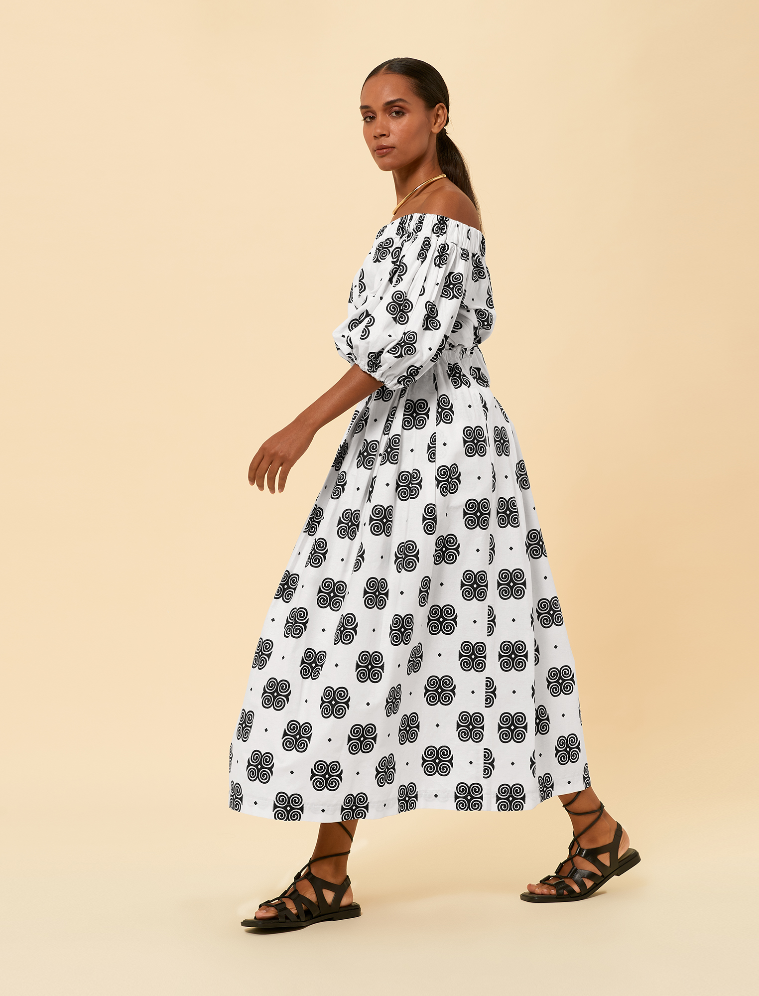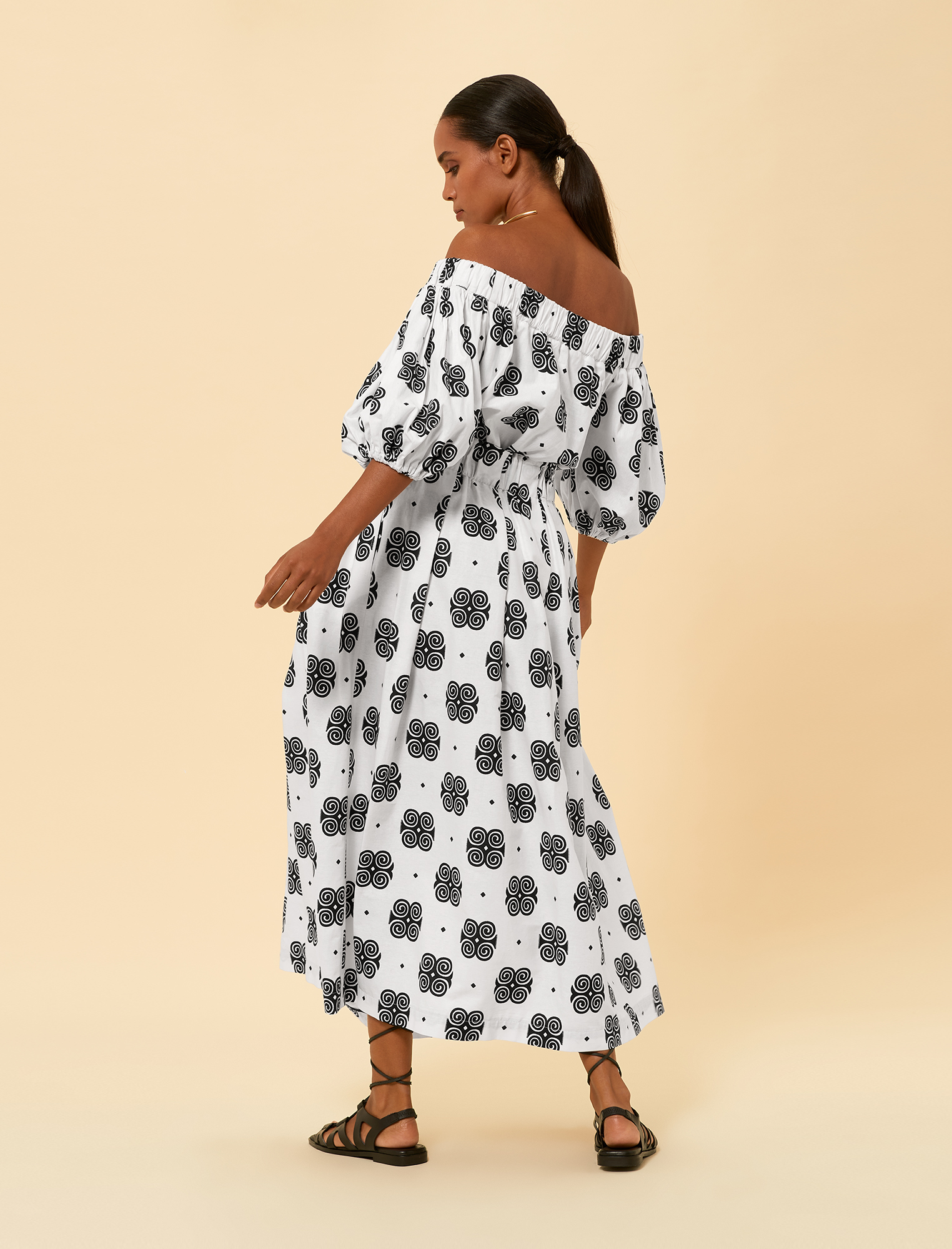 The fabric features a black-and-white colour palette with bold geometric patterns. It showcases intricate black spiral and circular motifs against a crisp white background. The lightweight and breathable material ensures comfort and style
