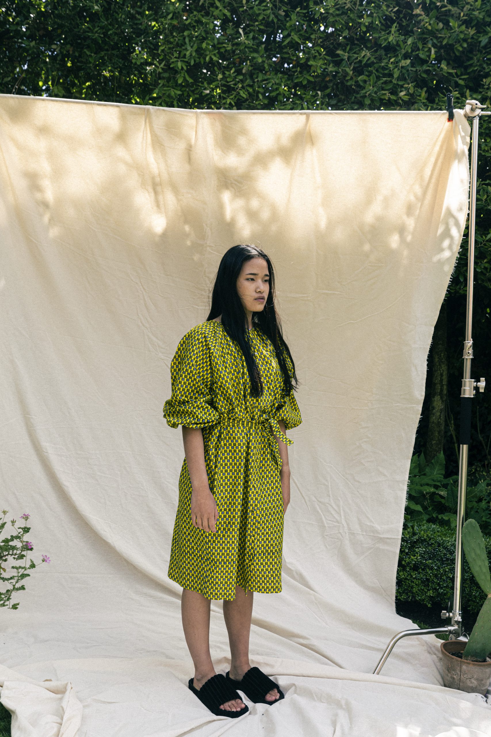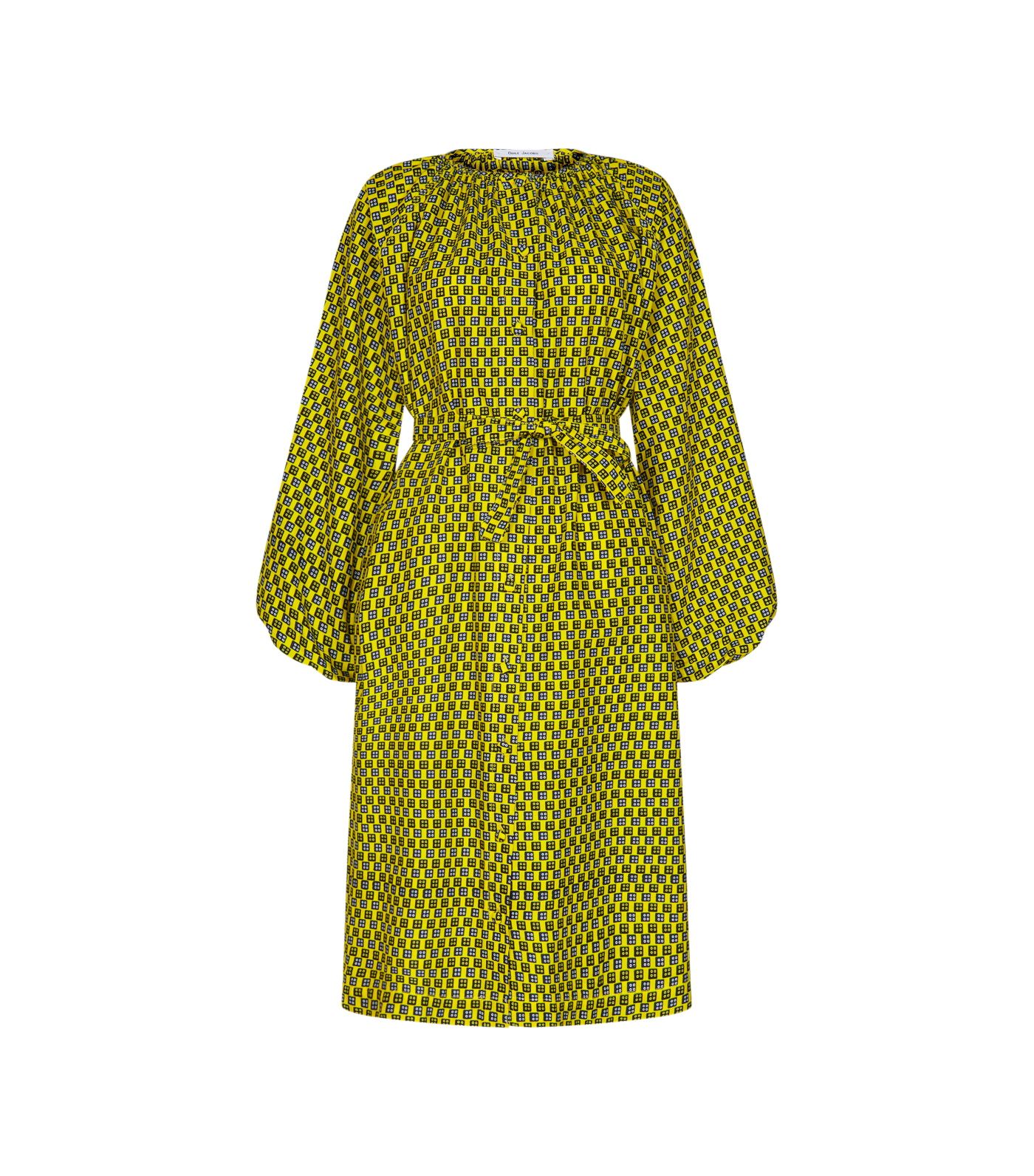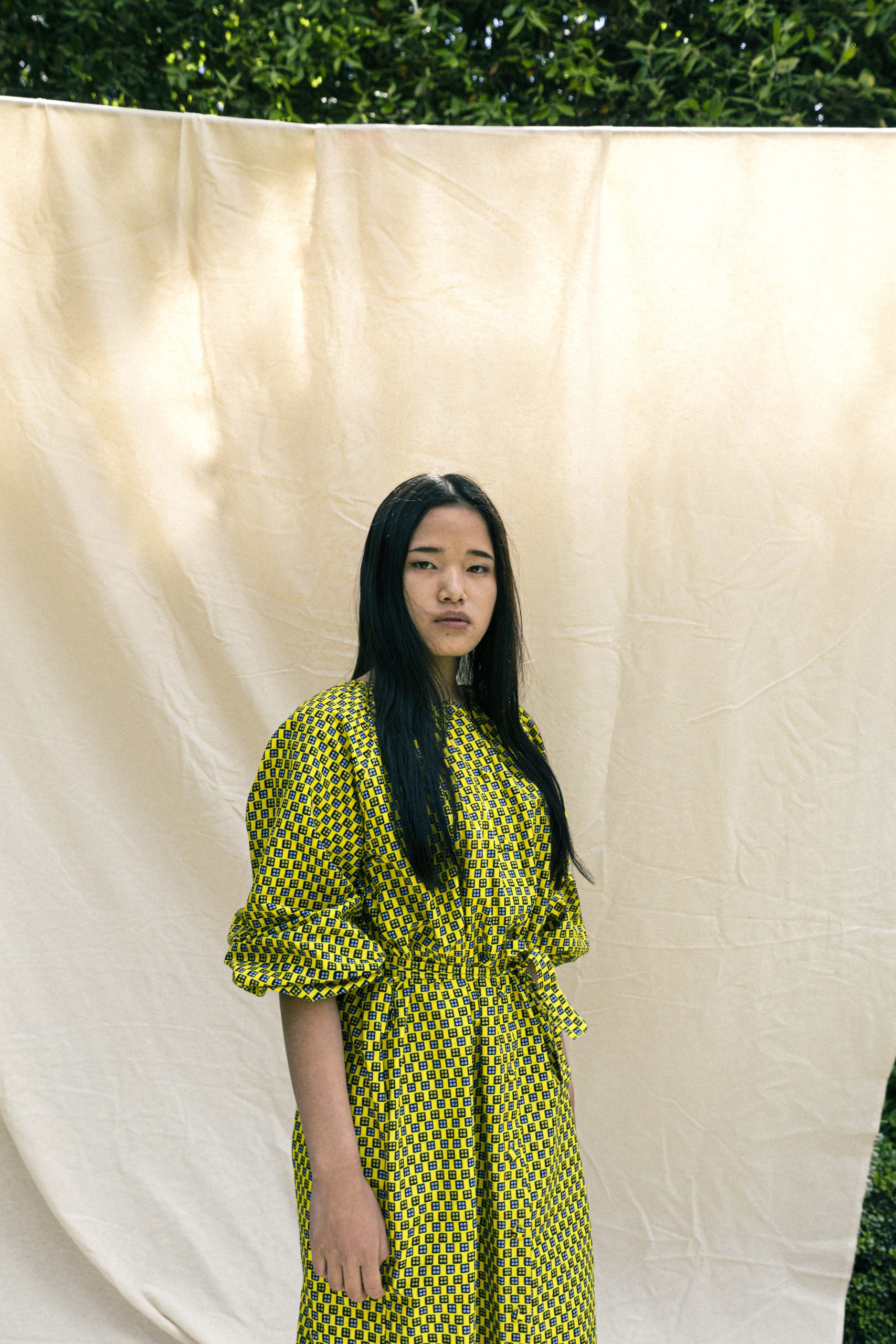This traditional style incorporates billowing sleeves and a midi skirt, with a belt to cinch in the waist for a feminine silhouette. Buttons running from top to bottom create an elegant feature on an otherwise more casual style. Choose this bright yellow fabric with a different take on a checkered pattern, featuring blue and black tiny window shaped squares.