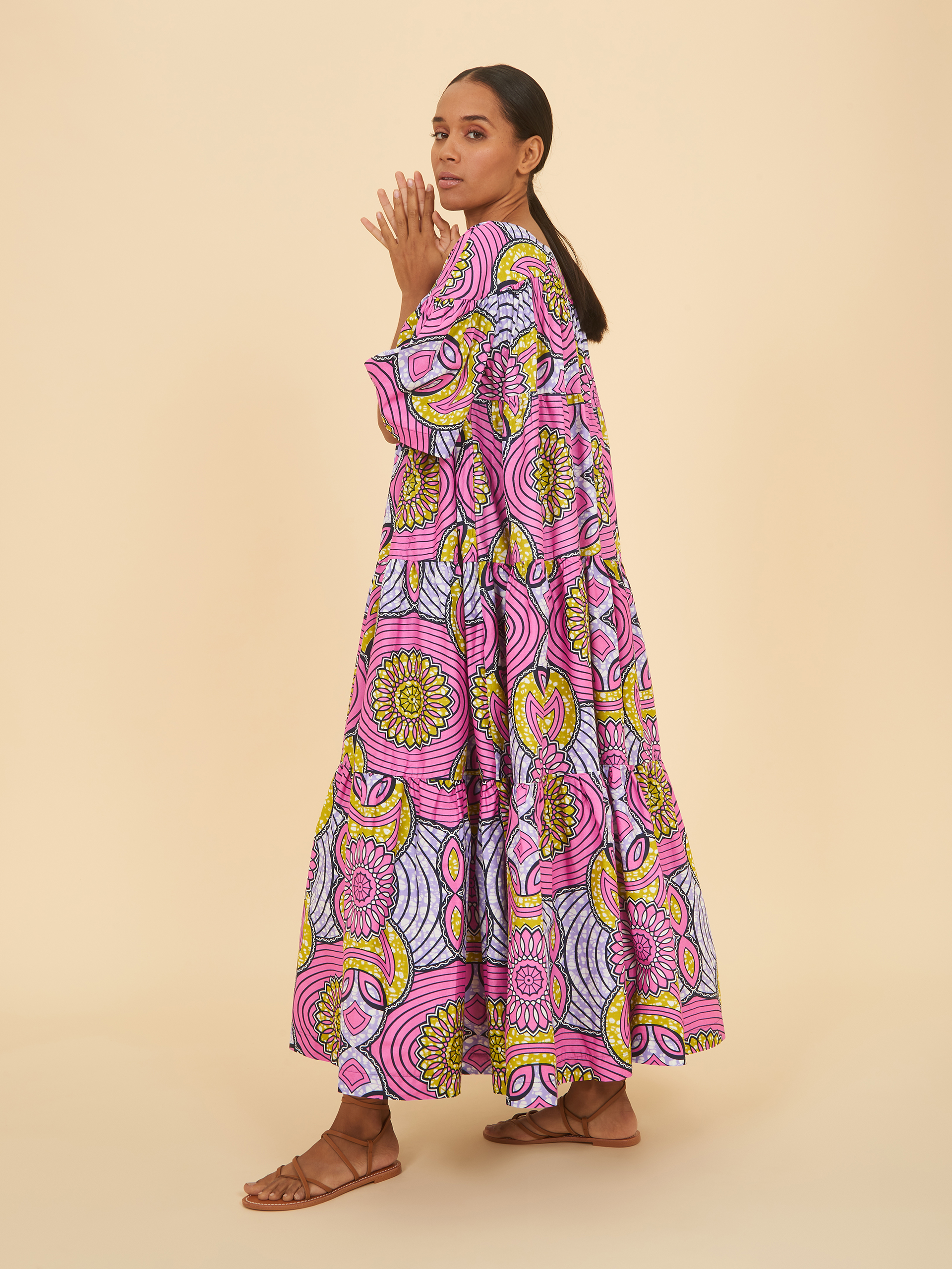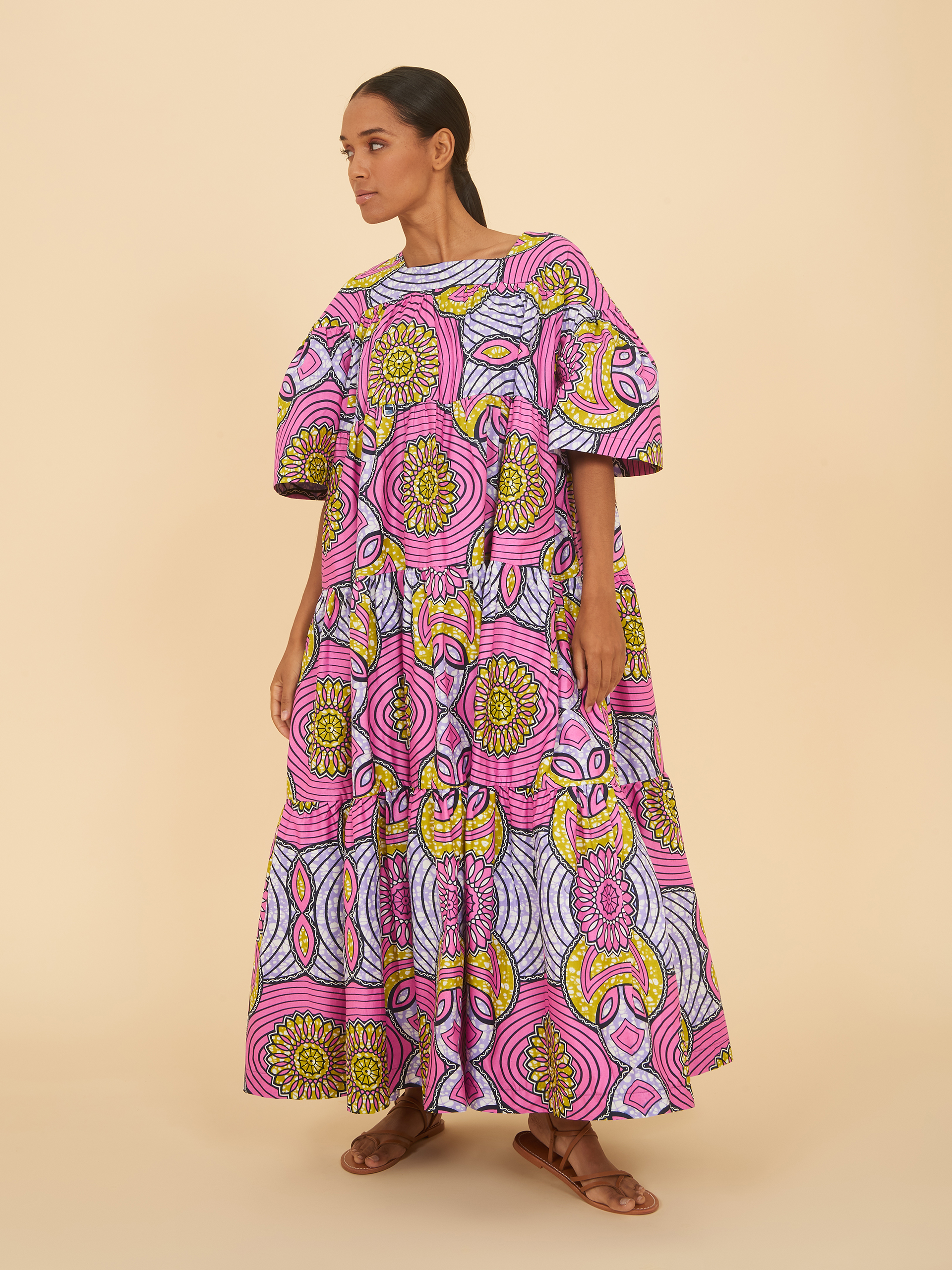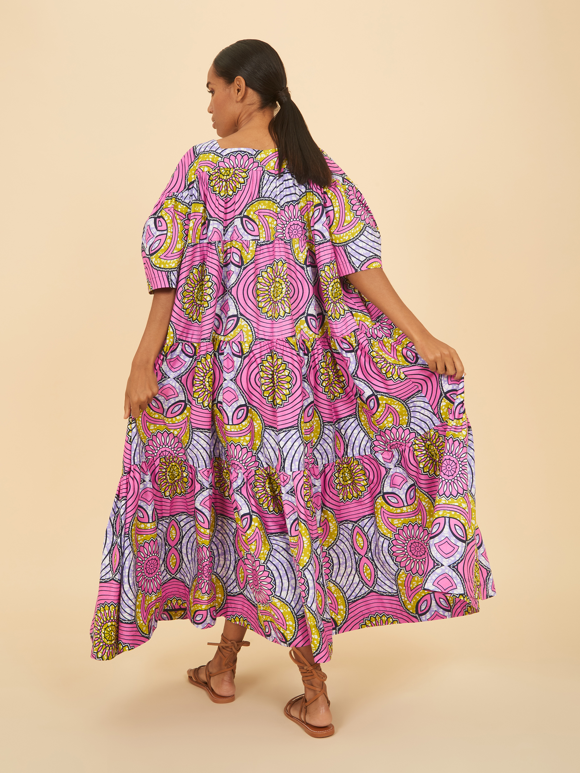 Our tiered flounce dress gives us a wavy, floaty feel with short sleeves and a round neck for a look that can be rocked year-round. This daring pattern pairs pinks, purples and yellows in an eye-catching radial design, made for confident wardrobes.