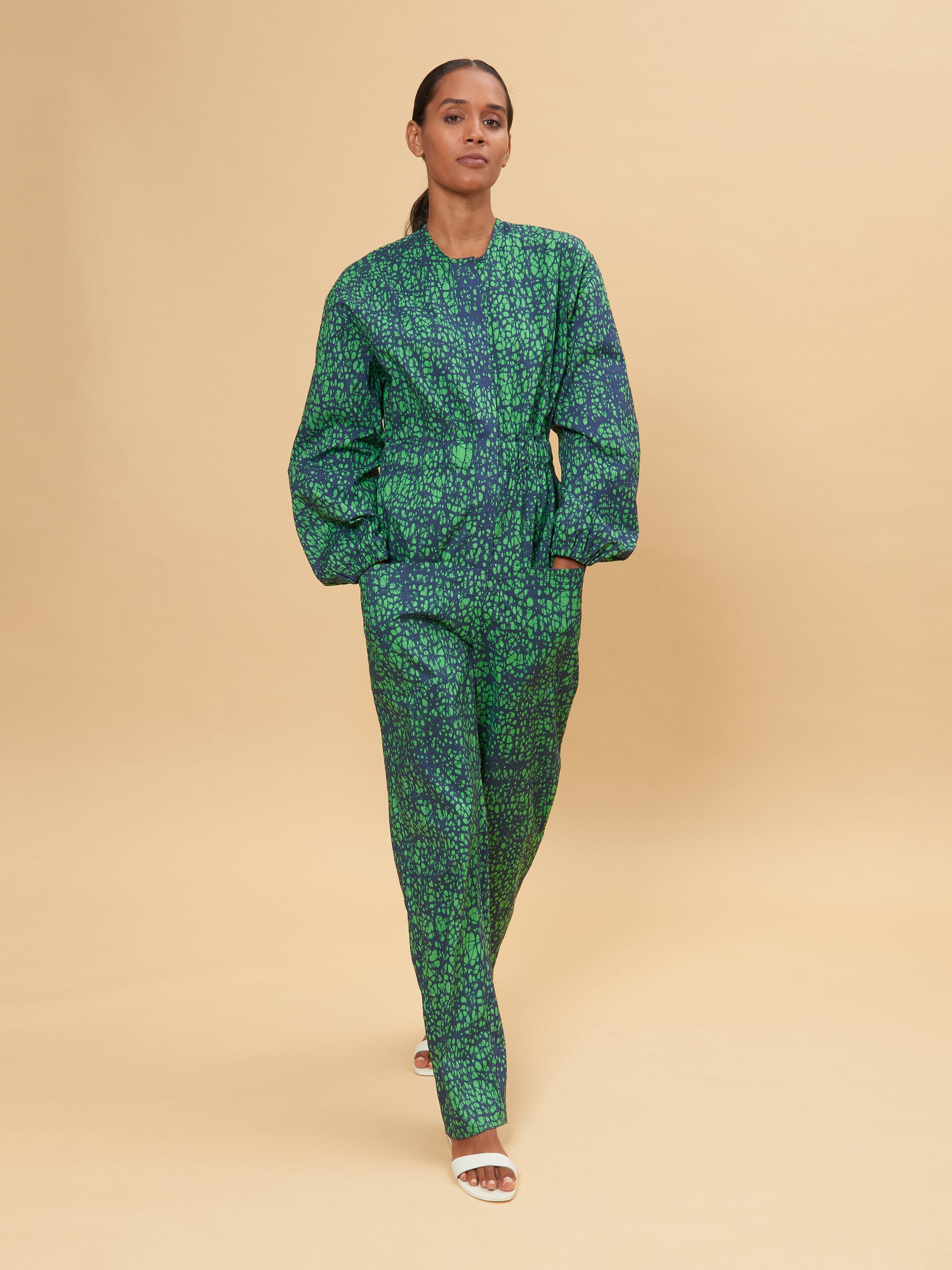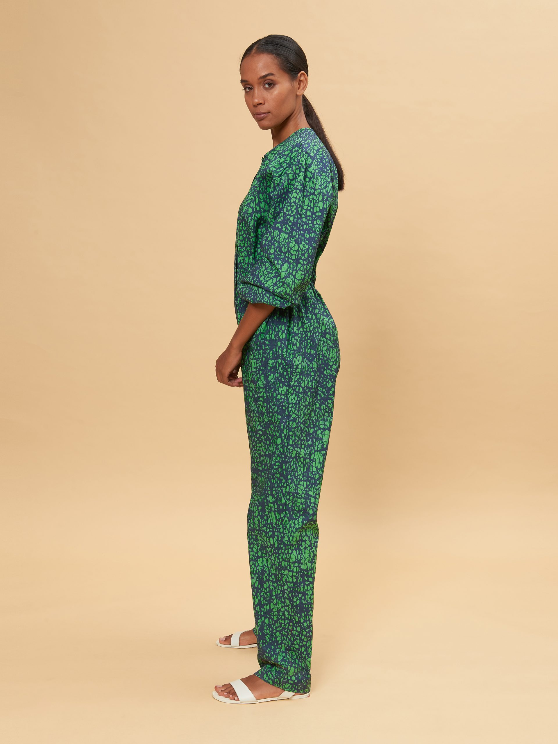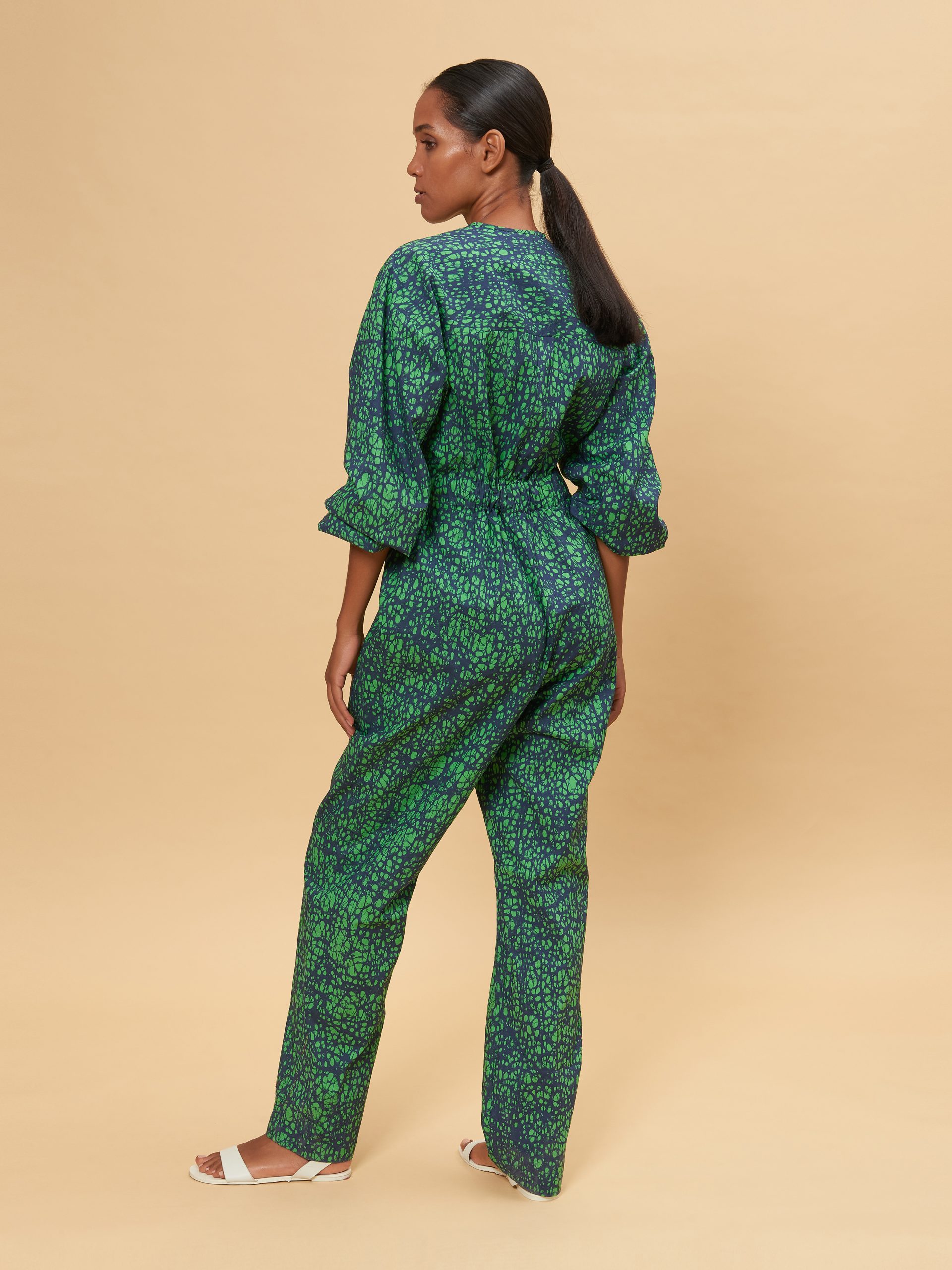 The jumpsuit is a wardrobe staple that everyone needs, especially in the run up to the holiday season. Made from 100% cotton, this fabric features a navy and parakeet green abstract craquelure effect.