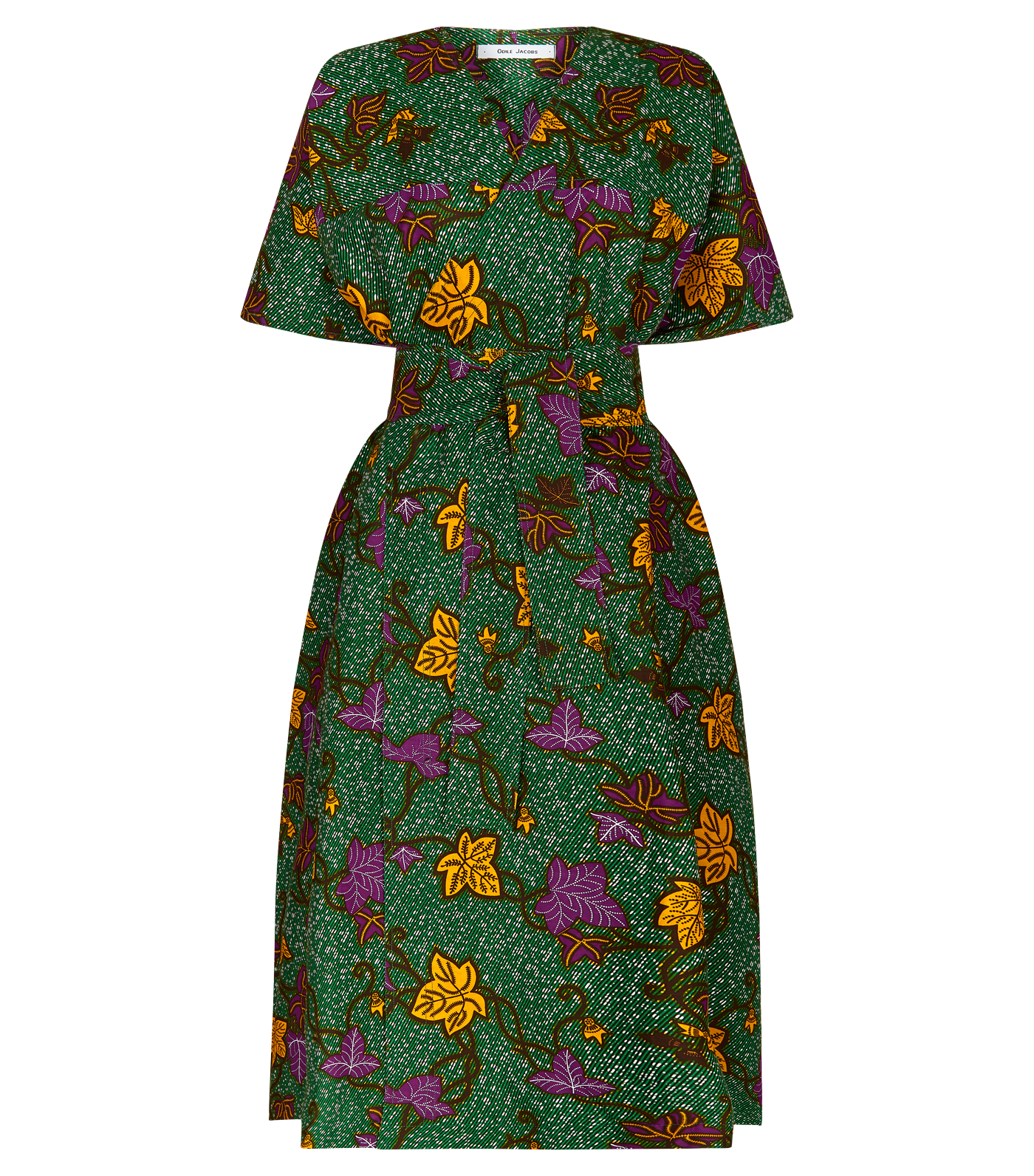 This t-shaped short sleeve dress is a take on the Asian Kimono style. It features a thick front wrapping belt, giving the midi length a corseted waist. This print features a jungle green paired with purple and yellow leaves.
