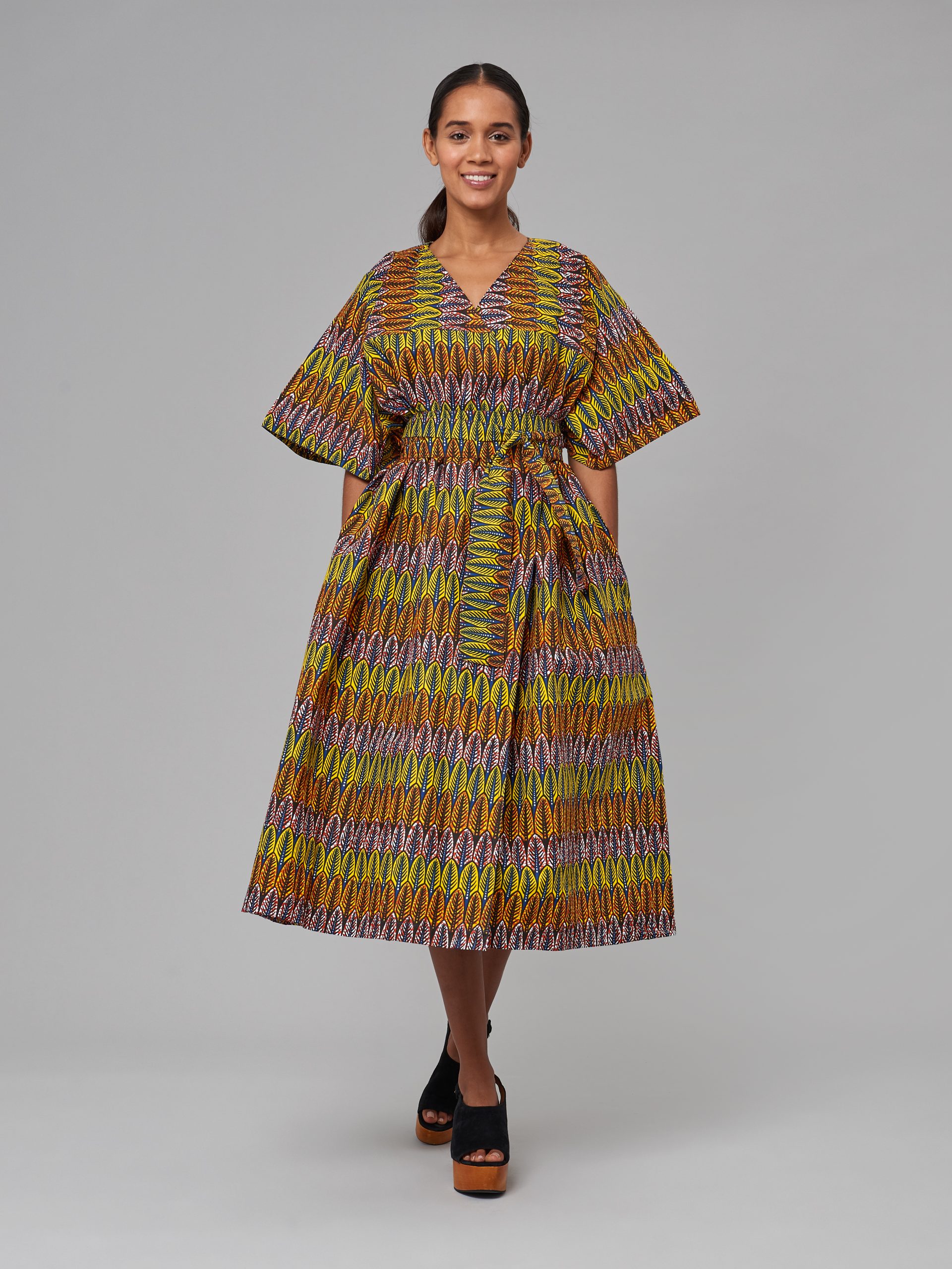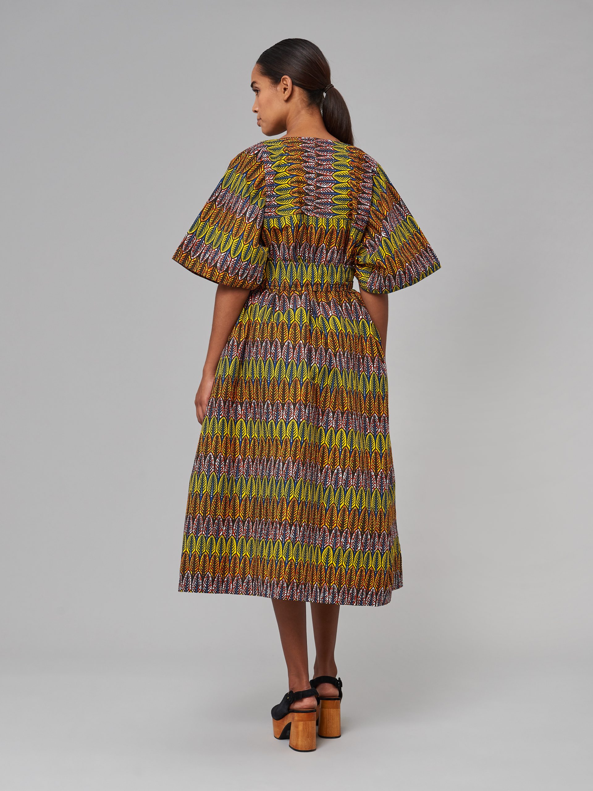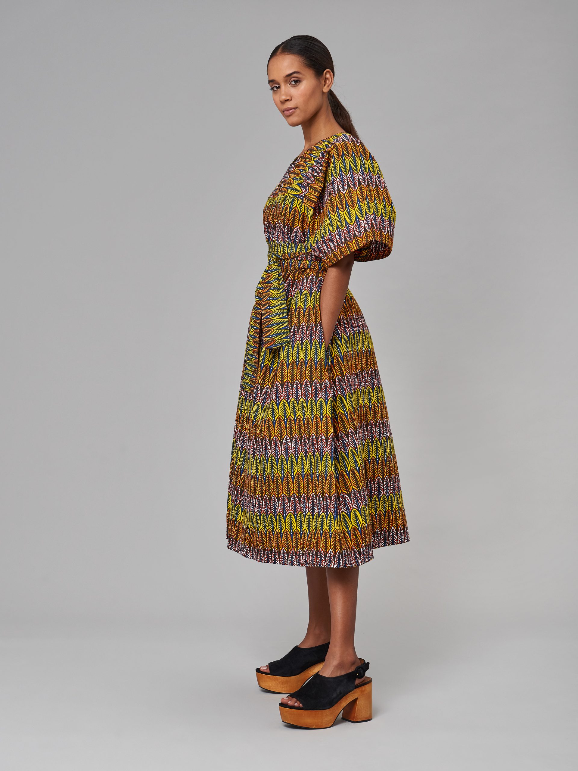 This t-shaped short sleeve dress is a take on the Asian Kimono style. It features a thick front-wrapping belt, giving the midi length a corseted waist. The crimson, ginger and lemon coloured feather pattern runs from top to bottom, giving a different take on a vertical stripe.