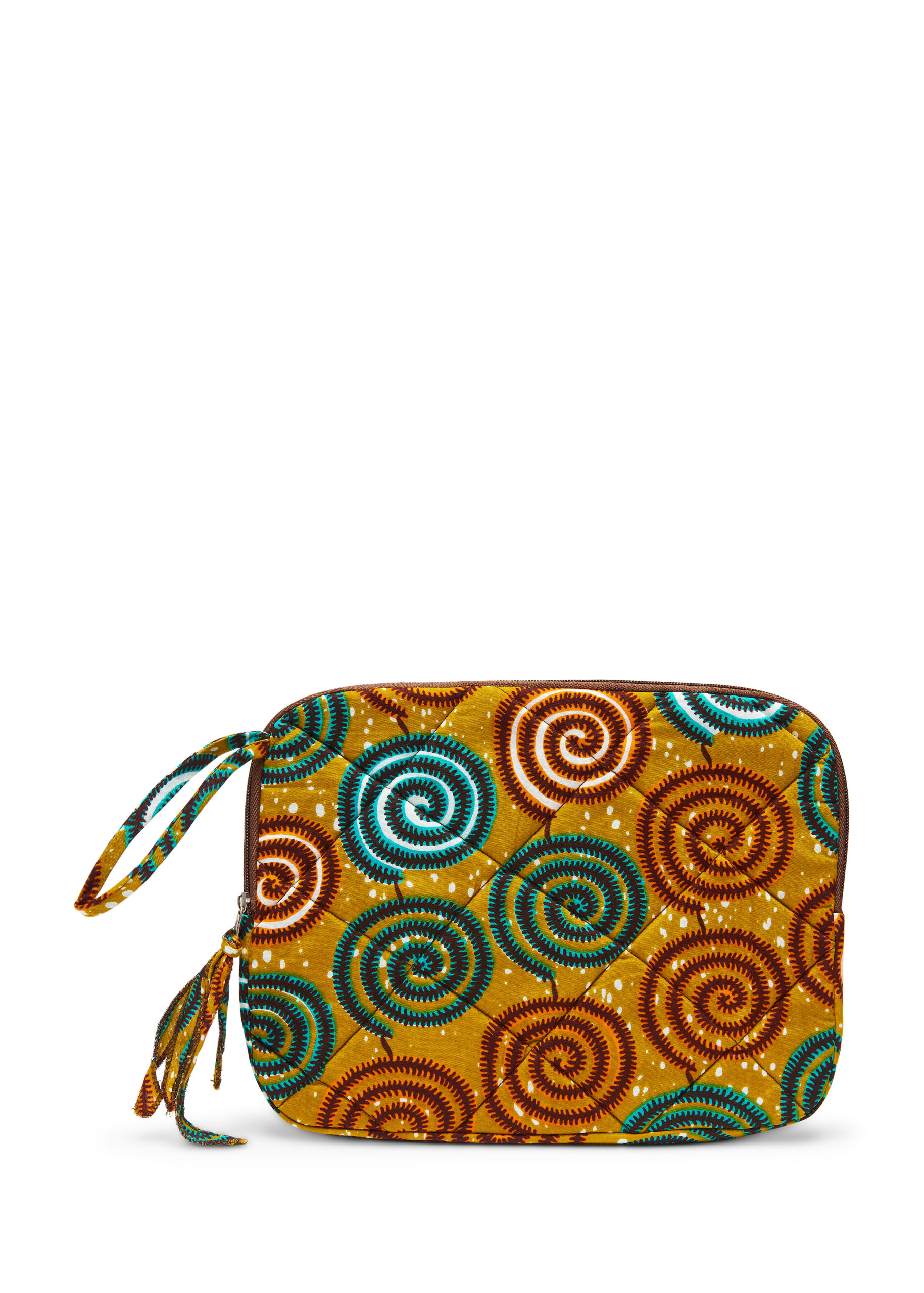 Our vibrant laptop case is designed for those who appreciate a blend of style and functionality. The exterior showcases a dynamic pattern of bold motifs, offering a visually striking look. The quilted design not only adds texture but also provides enhanced protection for your device.