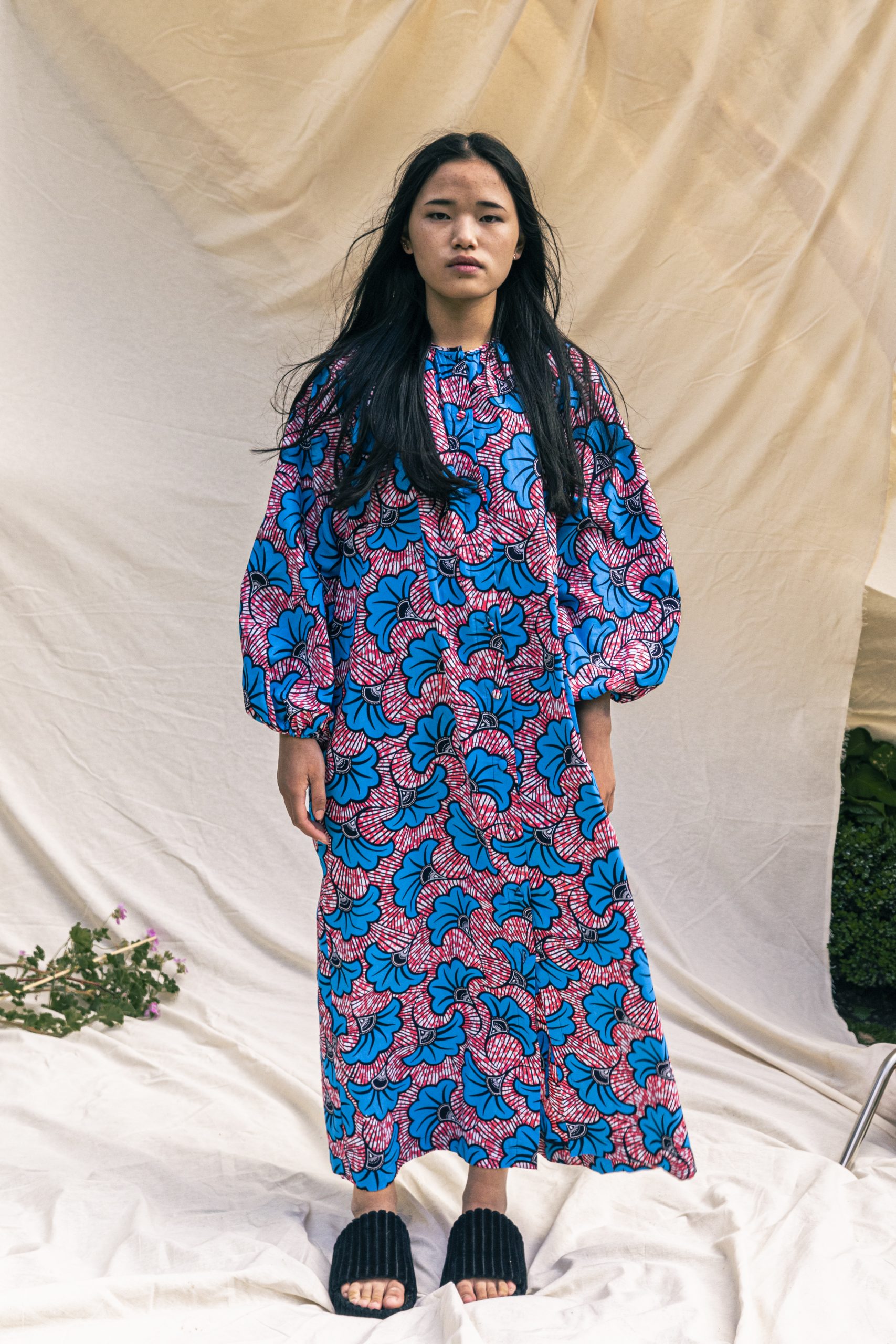 This traditional style incorporates billowing sleeves and a maxi skirt, with a belt to cinch in the waist for a feminine silhouette. Buttons running from top to bottom create an elegant feature on an otherwise more casual style. The dodger blue flower-like pattern grows into striped dark red swirls, giving the dress a vibrant and feminine look.