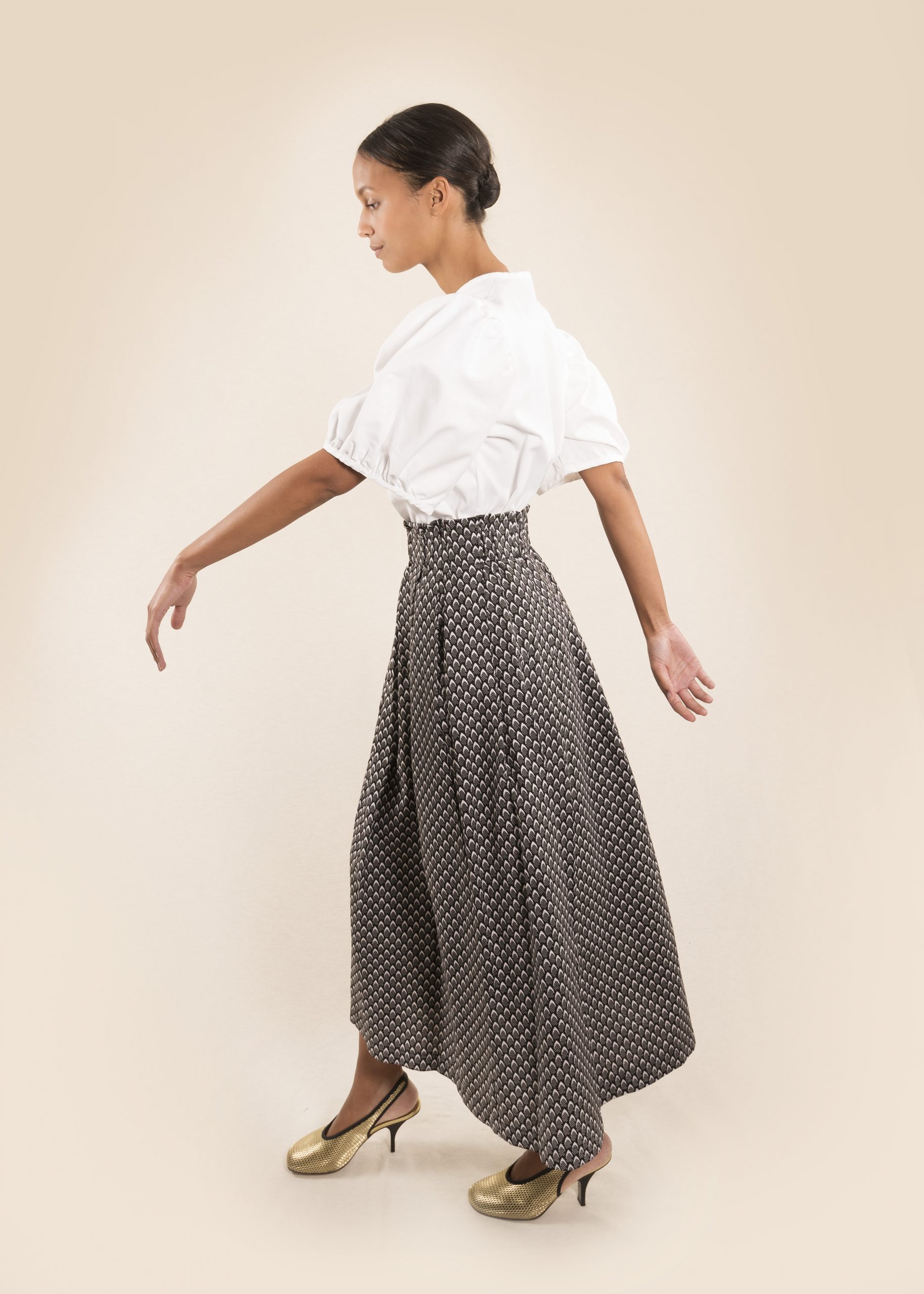 This maxi skirt creates a chic silhouette and can be paired with a plain t-shirt as a statement piece or a clashing print as a celebration of boldness. Choose a more muted fabric like this one for a smart office look, with its classic grey and white colour scheme. It could also be pared with a bright colour or contrasting pattern for a more daring look.