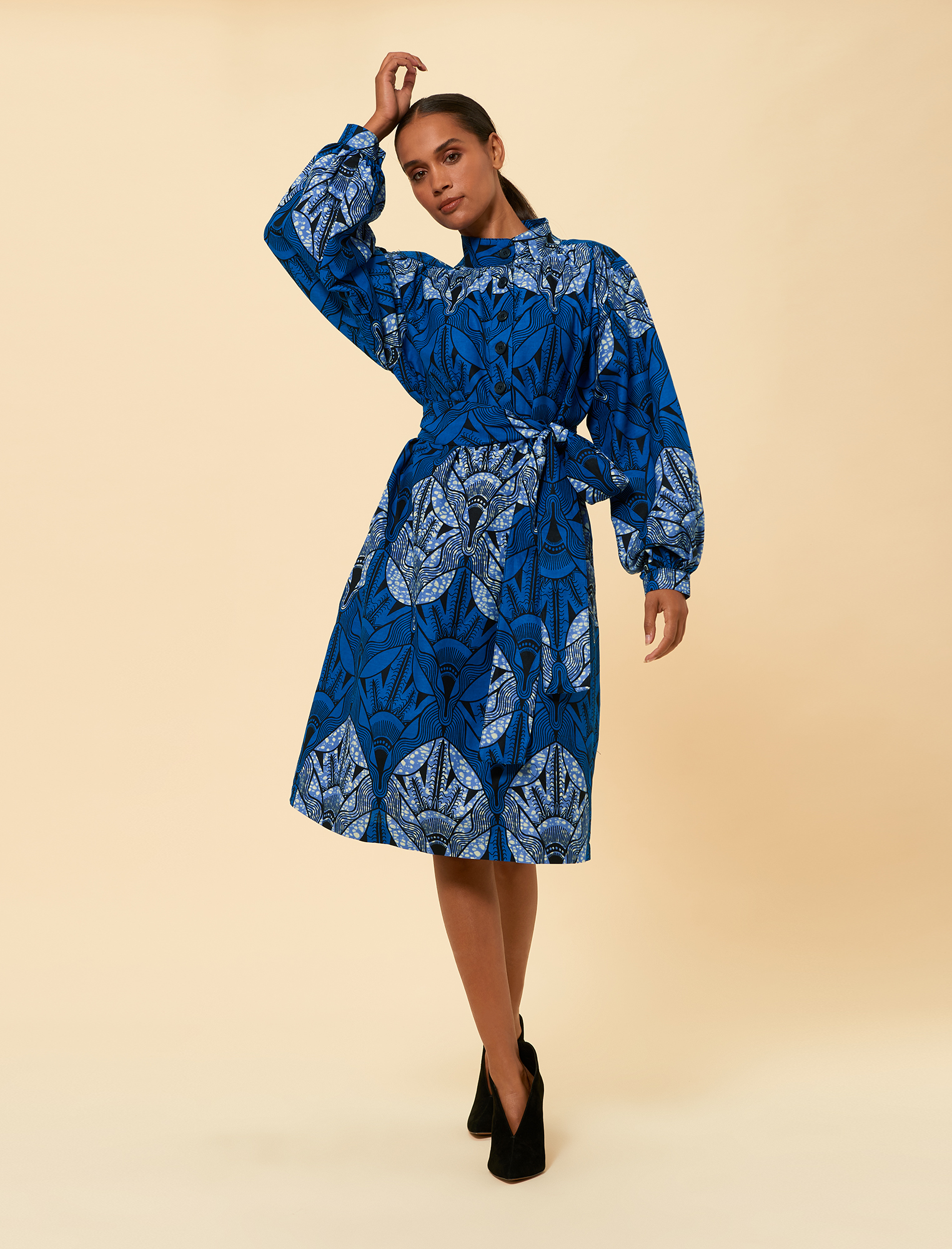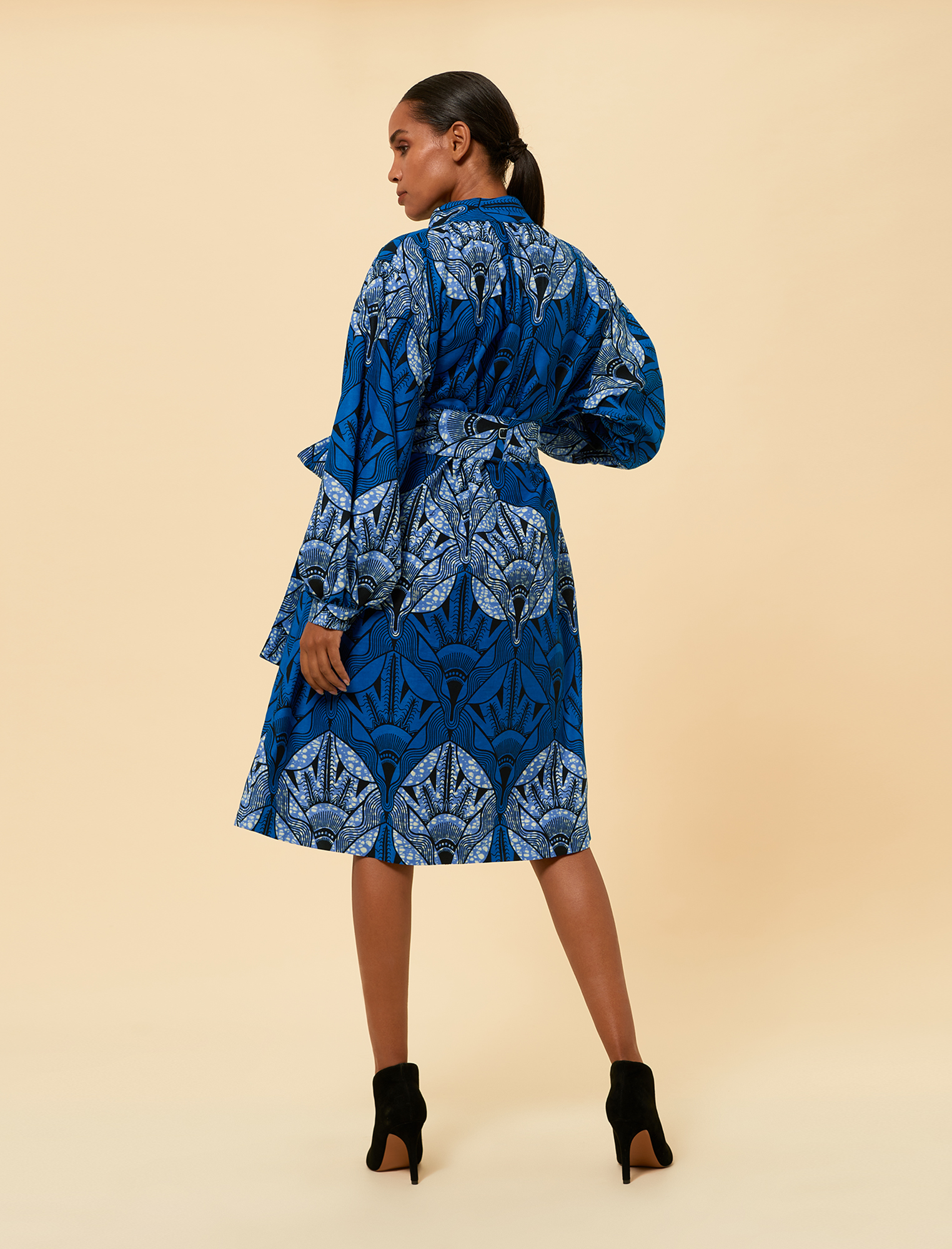 Set against a rich blue background, this wax print fabric features intricate silver and black motifs. The bold, nature-inspired patterns create a striking and dynamic design. Lightweight and breathable, this fabric ensures comfort while adding a touch of sophistication to any outfit.