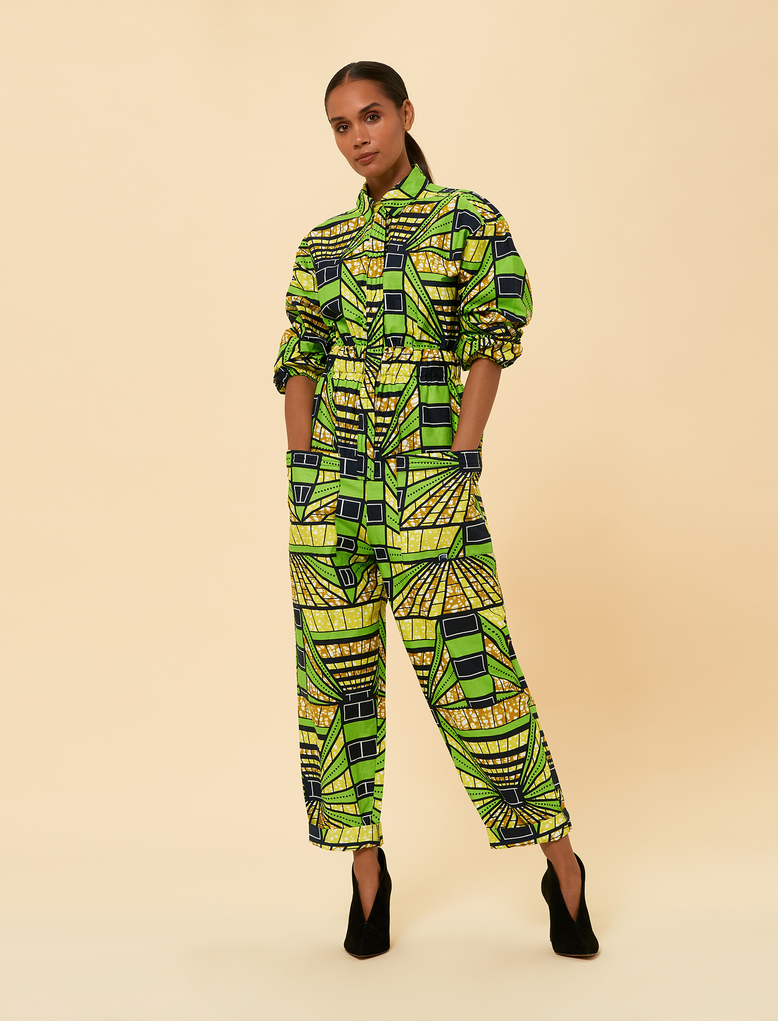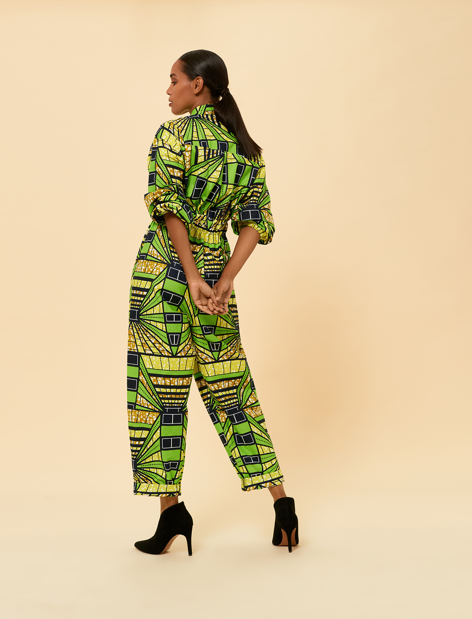 Highlighted by a vivid green background, this wax print fabric features a striking geometric pattern. The design incorporates bold black, yellow, and white elements with intricate details, creating a visually dynamic and modern aesthetic. The lightweight and breathable material ensures comfort while adding a touch of sophistication.