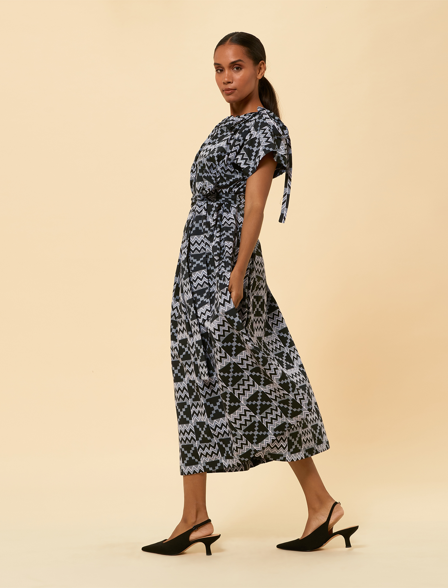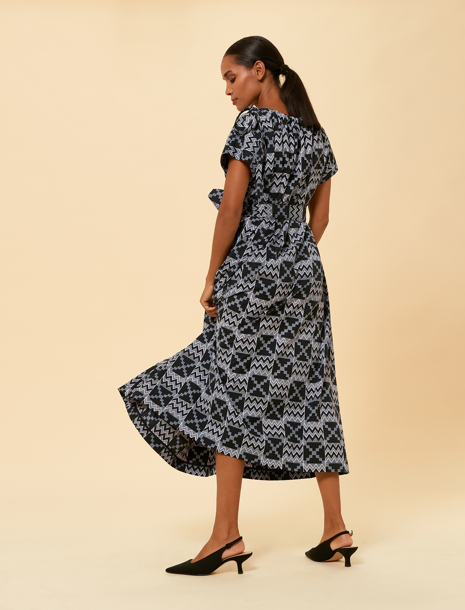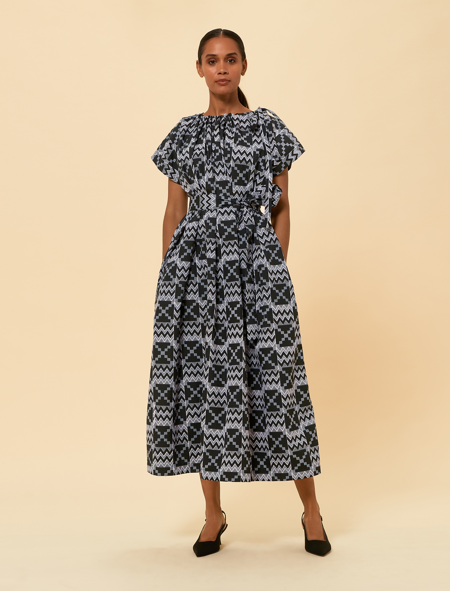 The fabric is a wax print featuring a sophisticated black and white colour scheme. It showcases a complex geometric pattern with zigzag and cross motifs, adding depth and visual interest. The lightweight and breathable material ensures comfort, making it perfect for all-day wear.