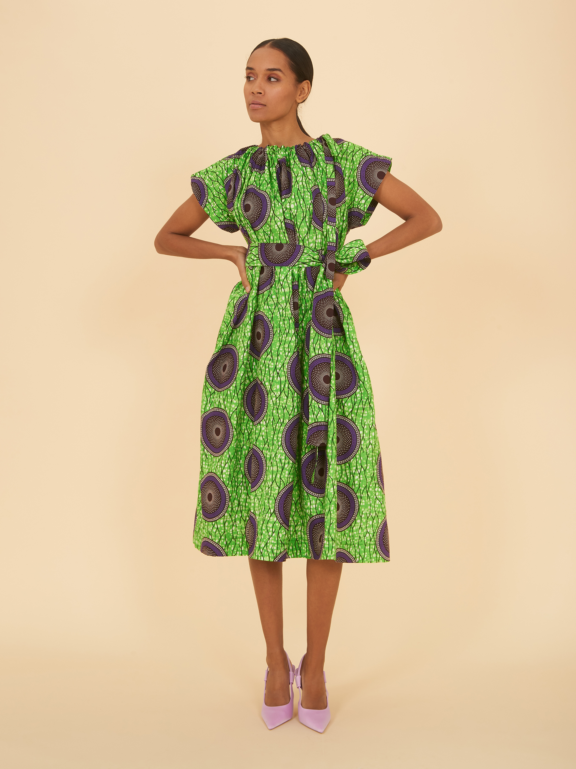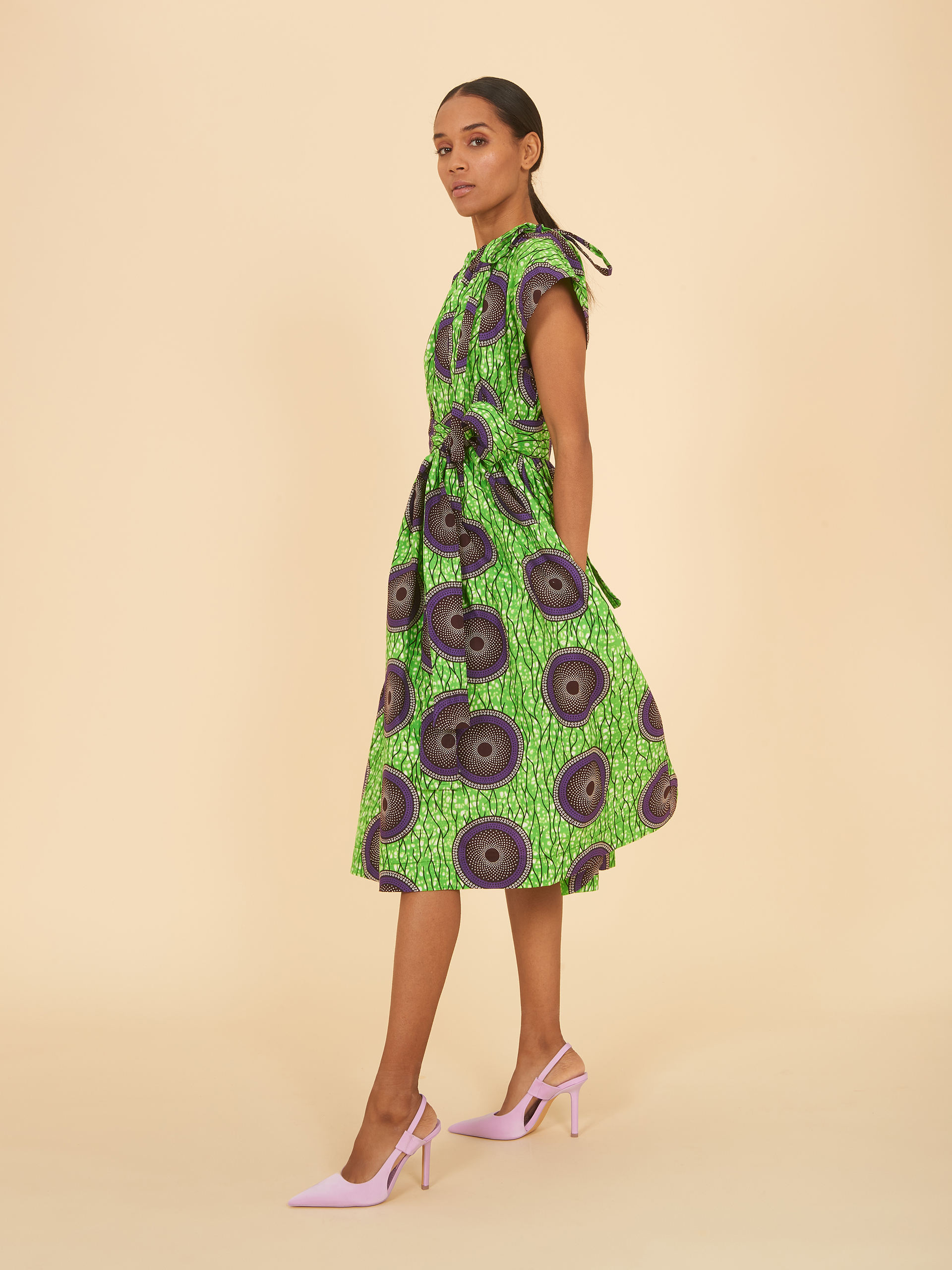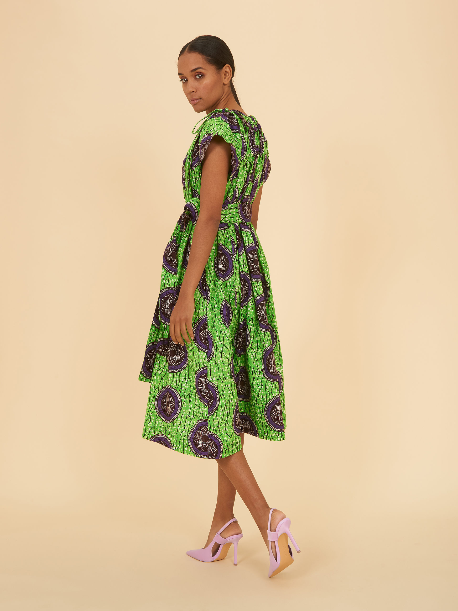 Neck Tie Dress (Short) in Bright Green and Purple Pattern