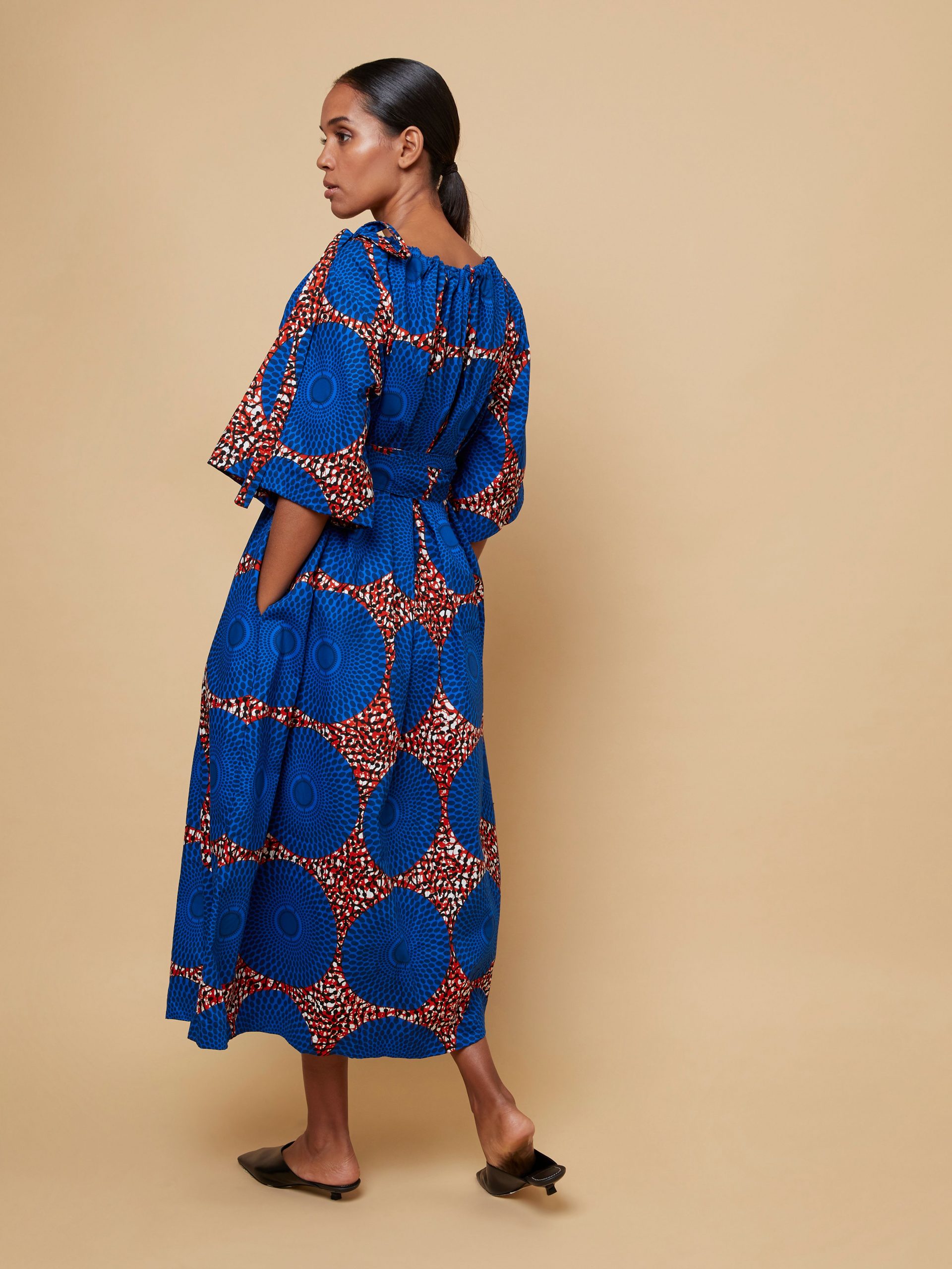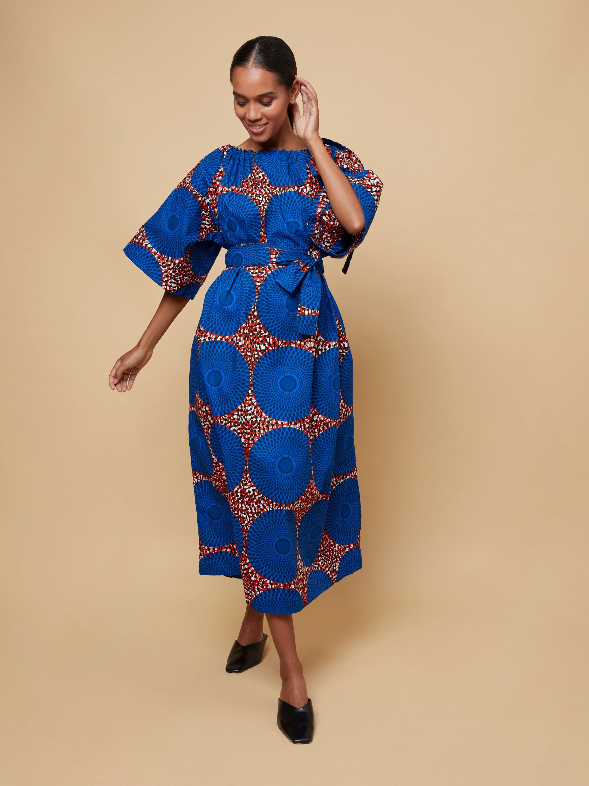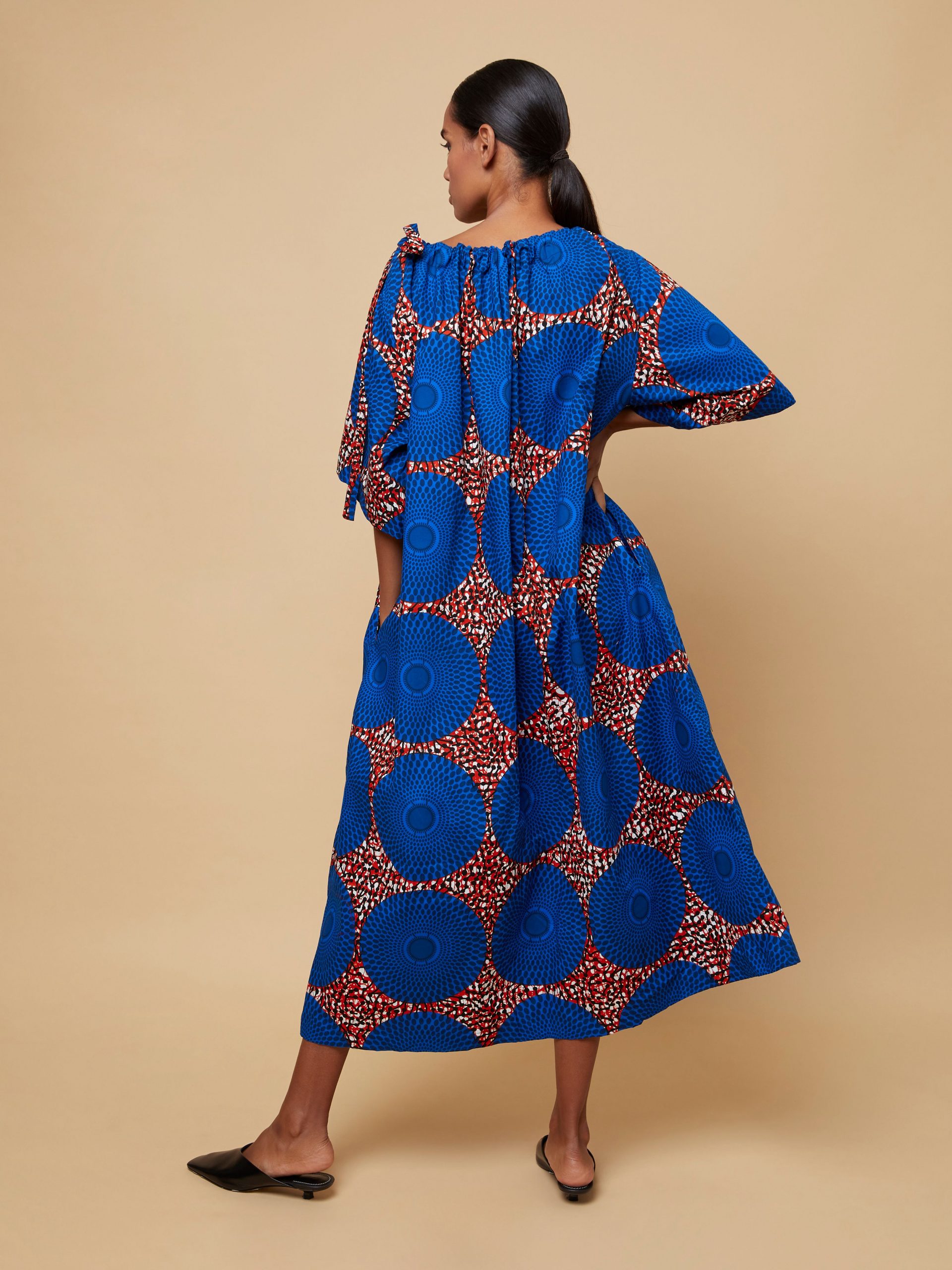 This short sleeve smock dress features a long skirt with pockets and built-in belt that pulls in the waist. The ruched neckline fans out over the chest and can be lostened or tightened using a pully strap on the shoulder adding an extra detail to the dress. Large, royal blue patterned polka dots decorate a busy orange background, for a festive, spirited style to liven up any ensemble.