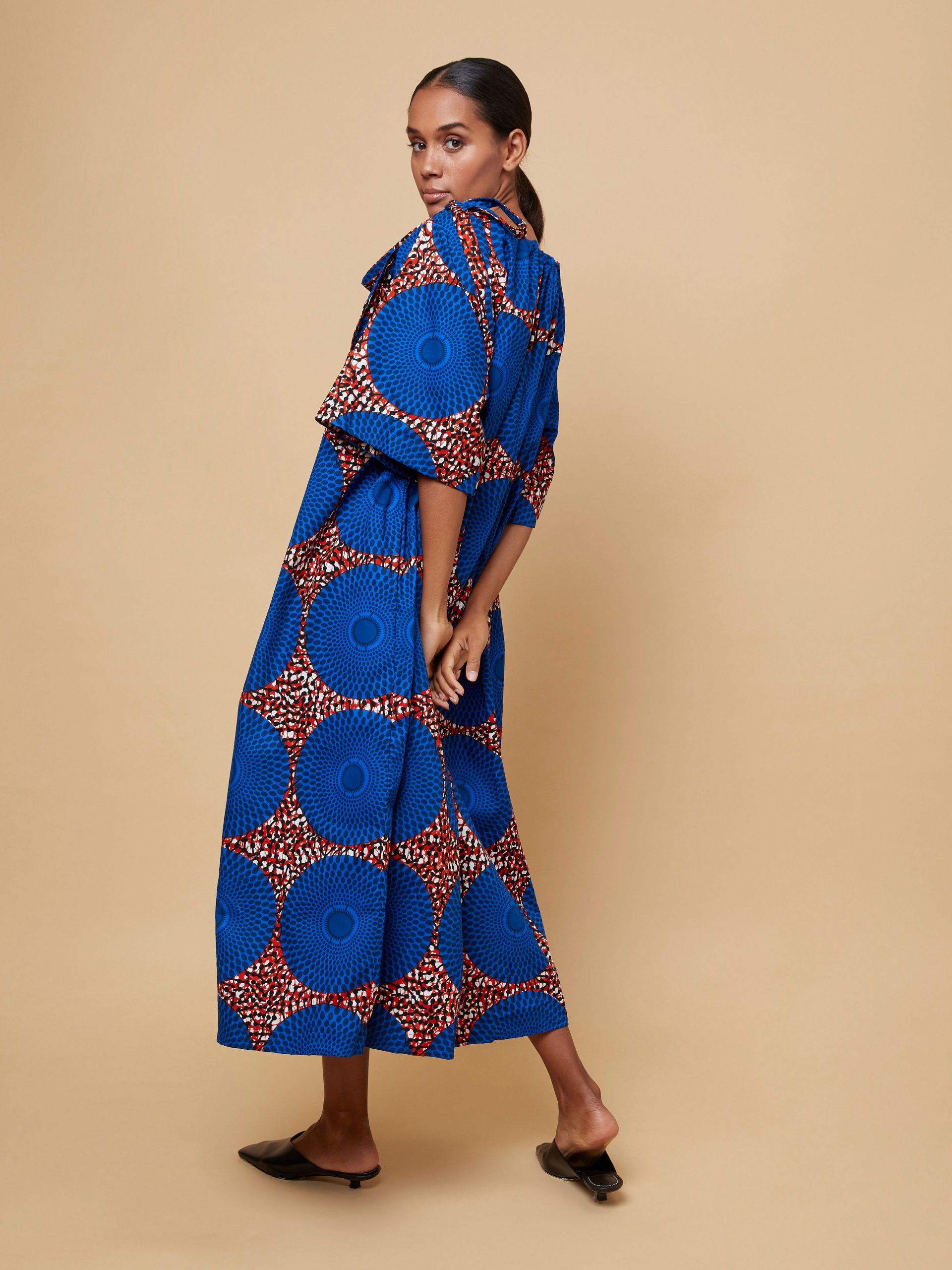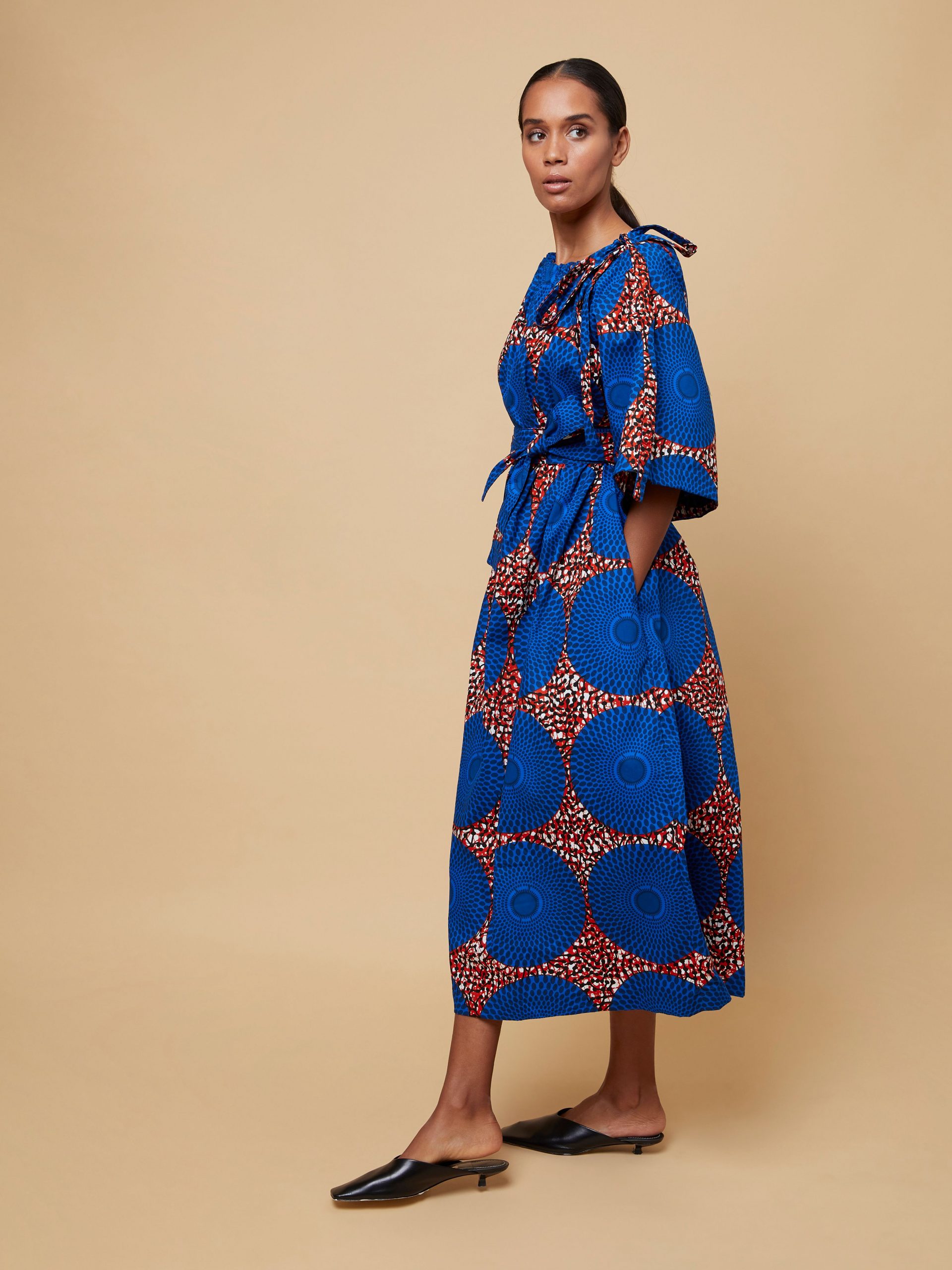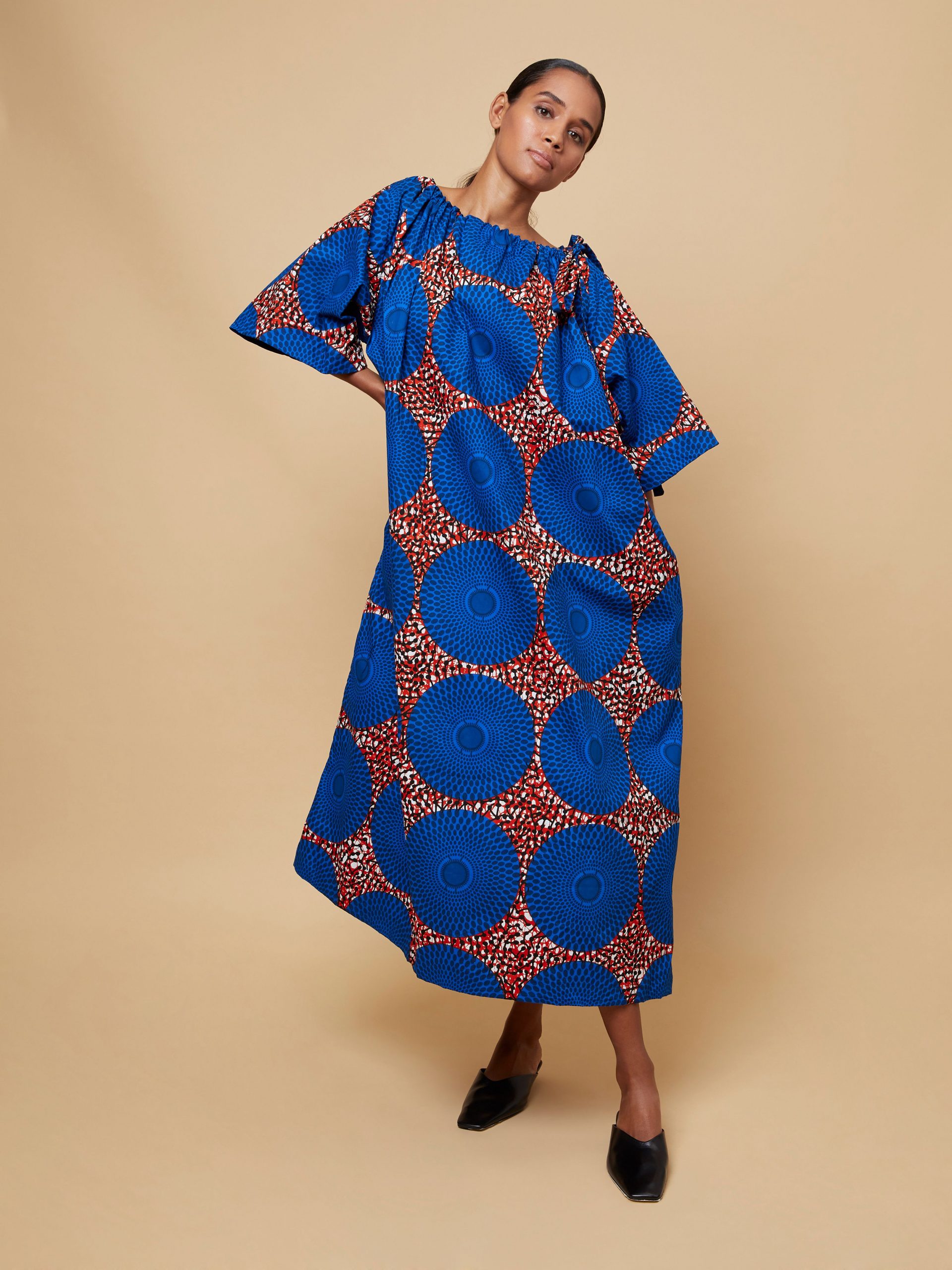 This short sleeve smock dress features a long skirt with pockets and built-in belt that pulls in the waist. The ruched neckline fans out over the chest and can be lostened or tightened using a pully strap on the shoulder adding an extra detail to the dress. Large, royal blue patterned polka dots decorate a busy orange background, for a festive, spirited style to liven up any ensemble.