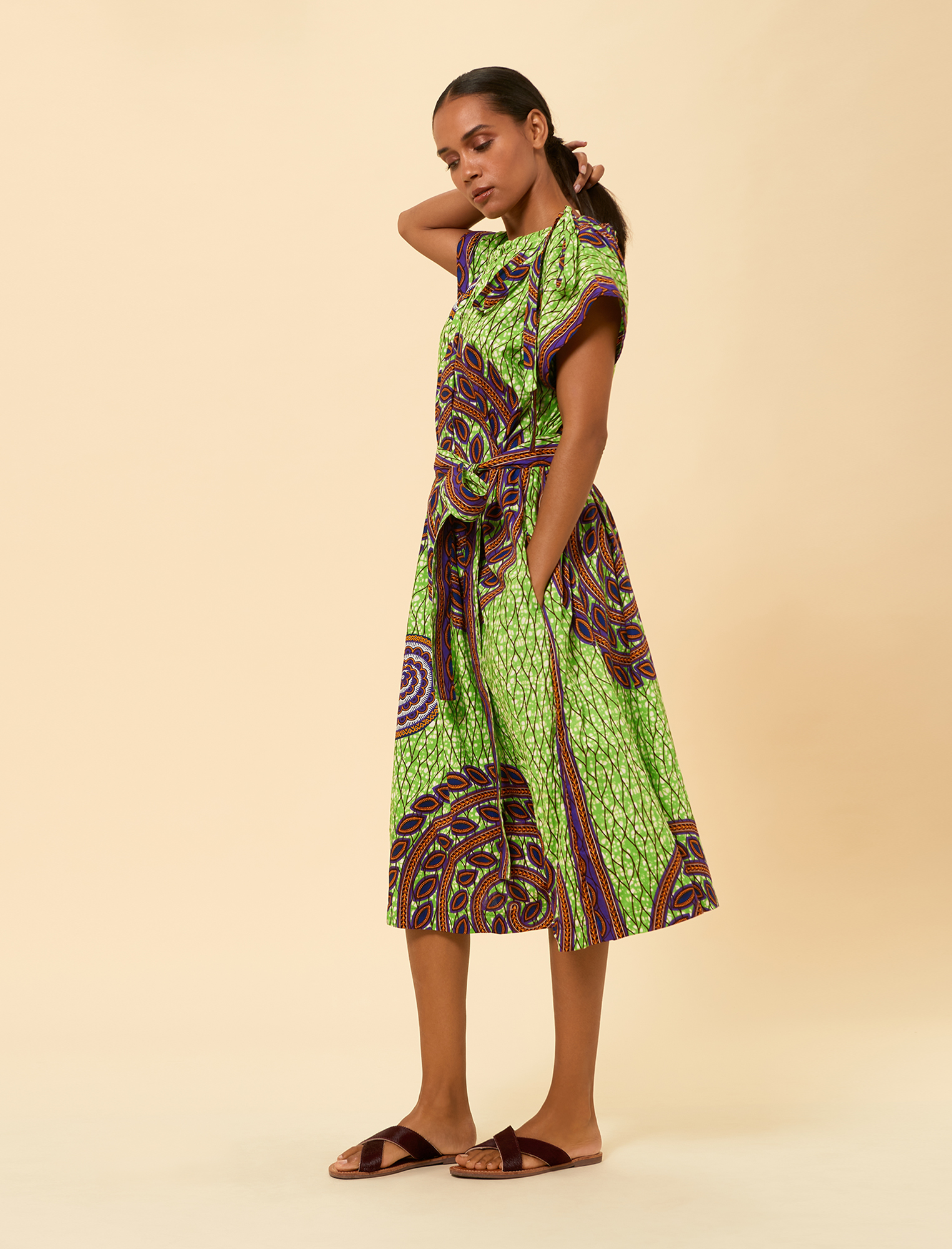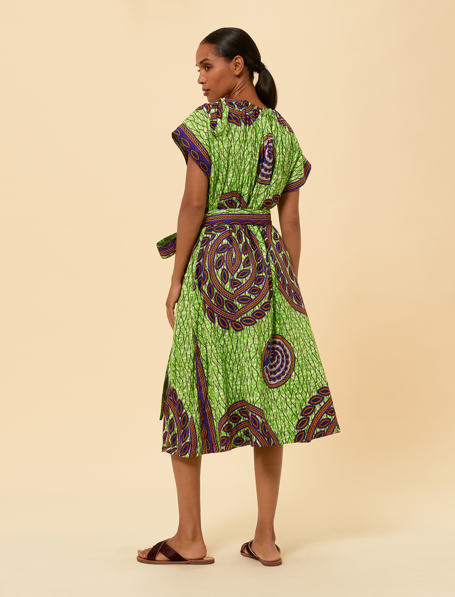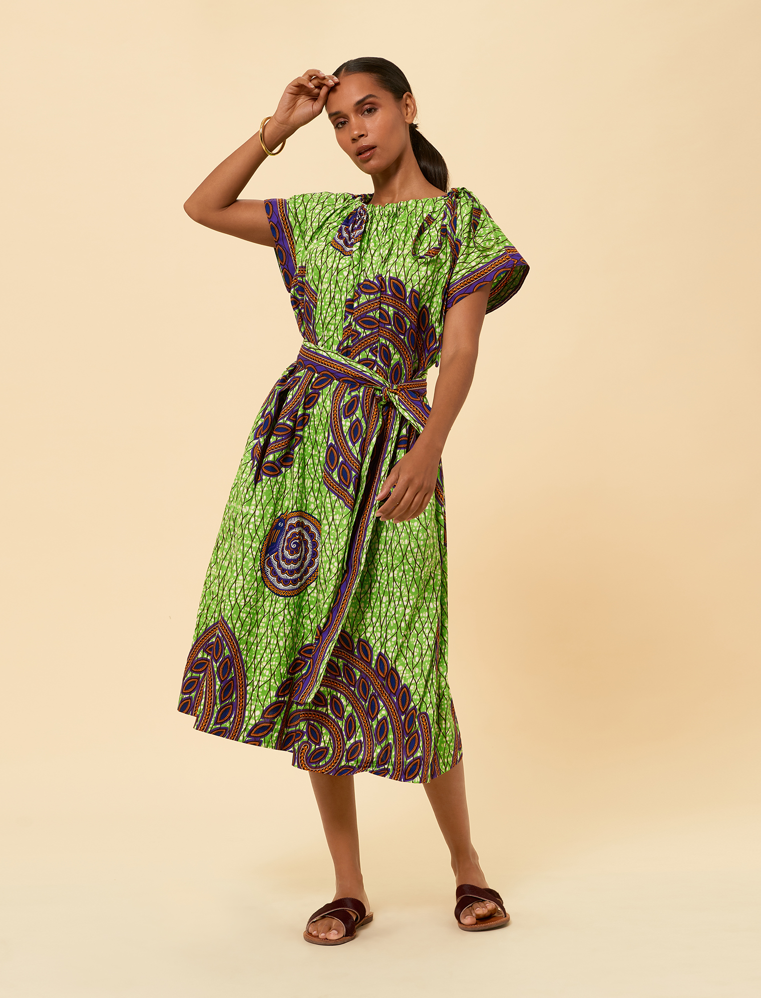 With a vibrant green background and bold spiral motifs, this wax print fabric is both eye-catching and unique. The intricate designs feature rich purple, orange, and black accents, enhanced by detailed geometric patterns.
