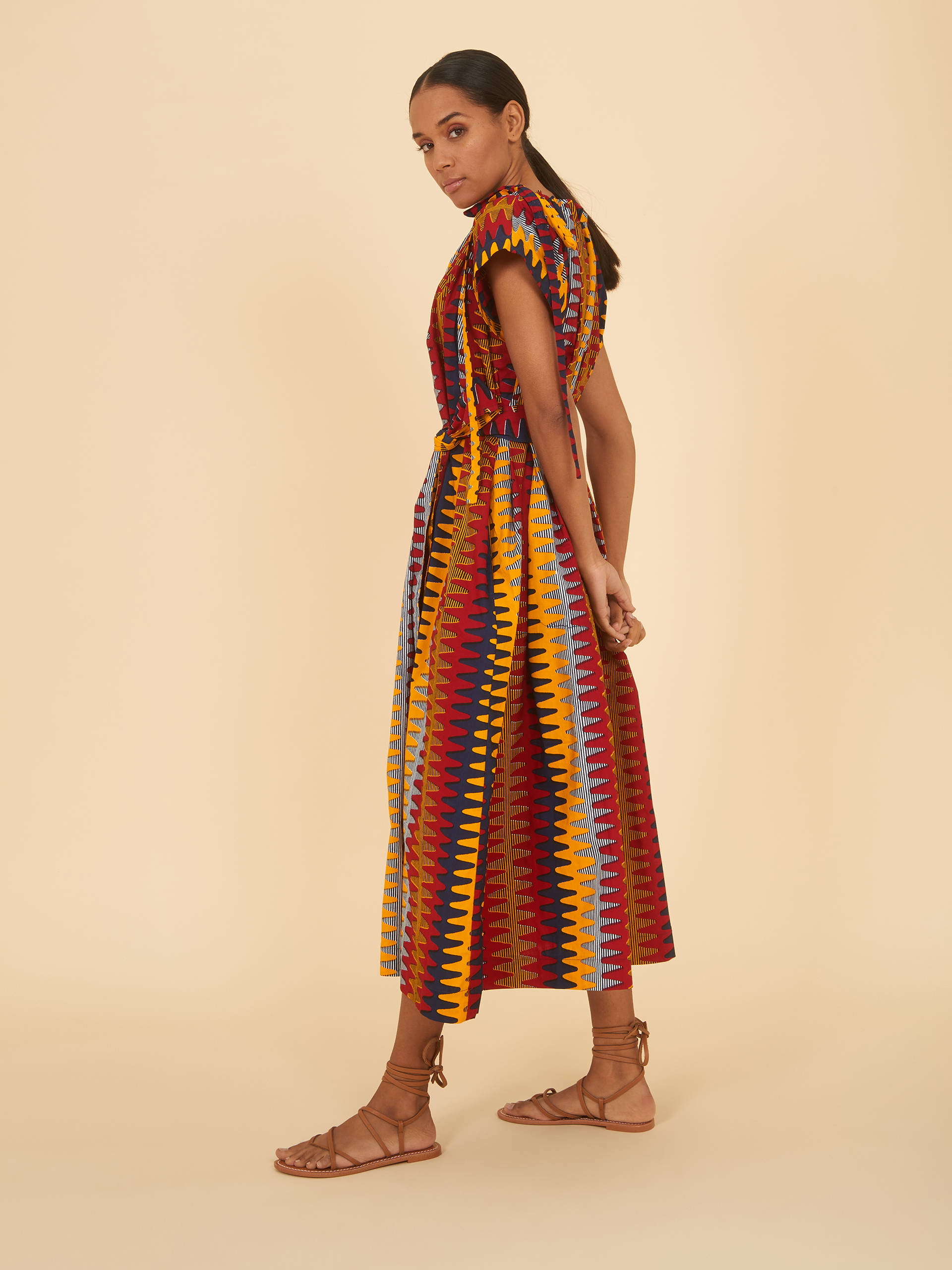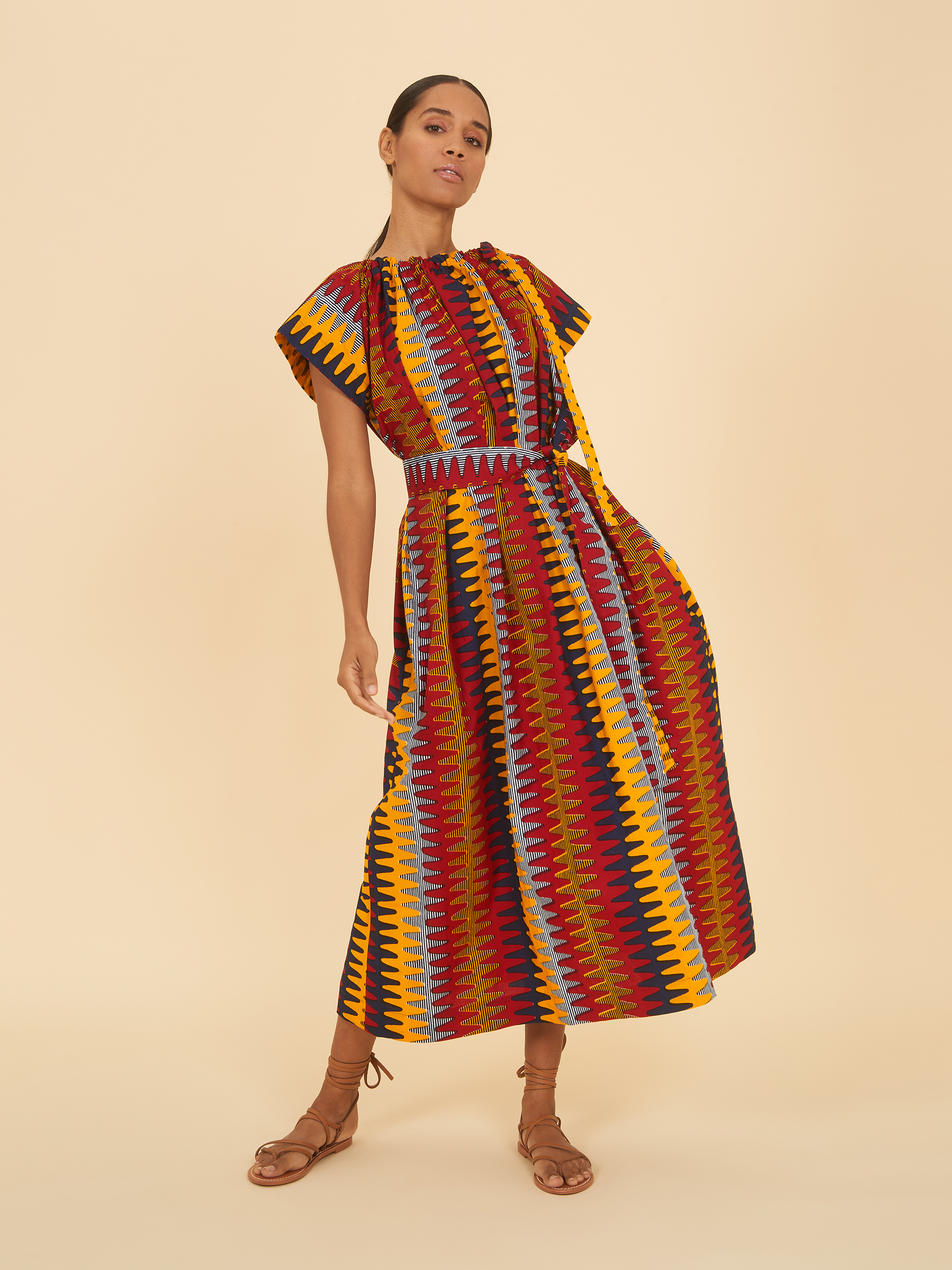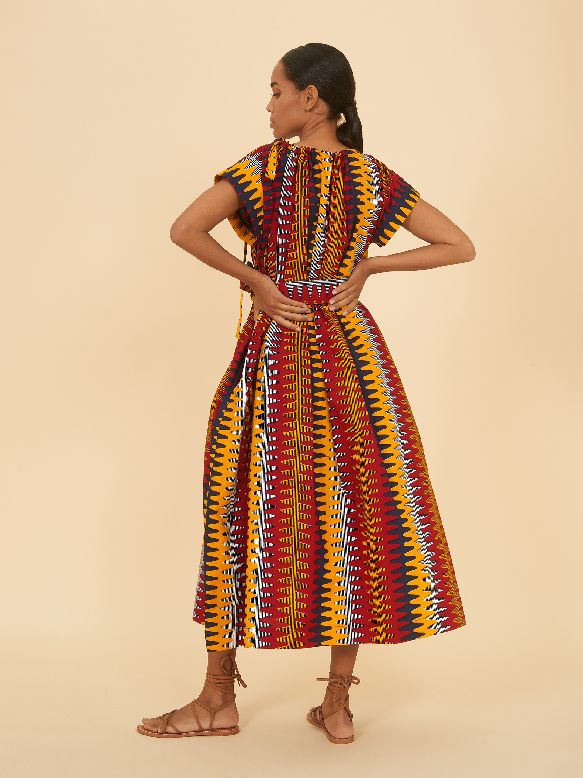 This short sleeve dress features an ankle length skirt and built-in belt that pulls in the waist. The ruched neckline fans out over the chest, for added texture. A timeless pattern featuring cherry red and golden yellow squiggles layered on a contrasting striped background, made for empowering occasions.