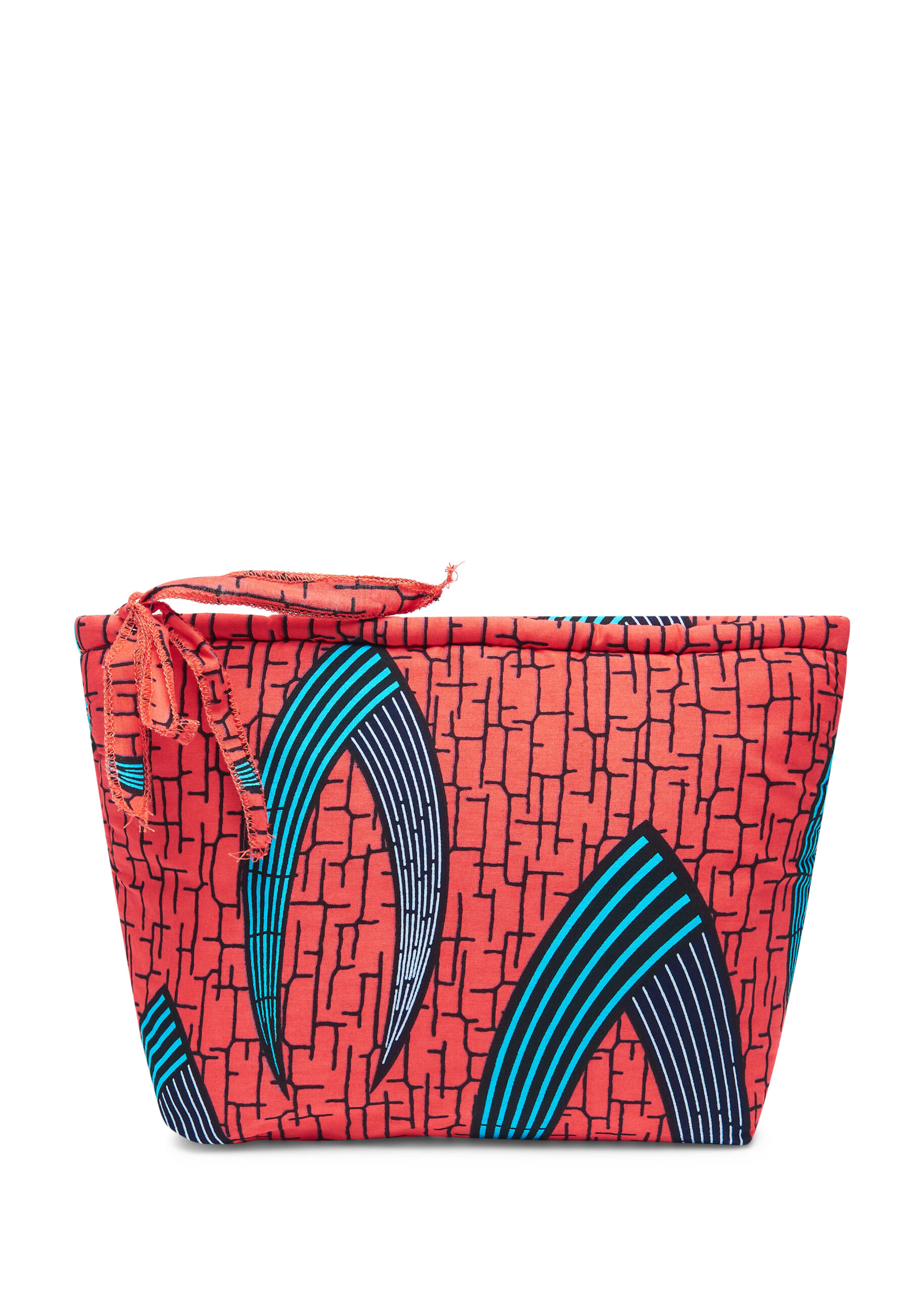 - Print and Colour: The exterior showcases a vibrant design featuring a coral background with striking blue and black geometric arcs. This dynamic pattern adds a contemporary and artistic flair to the bag.