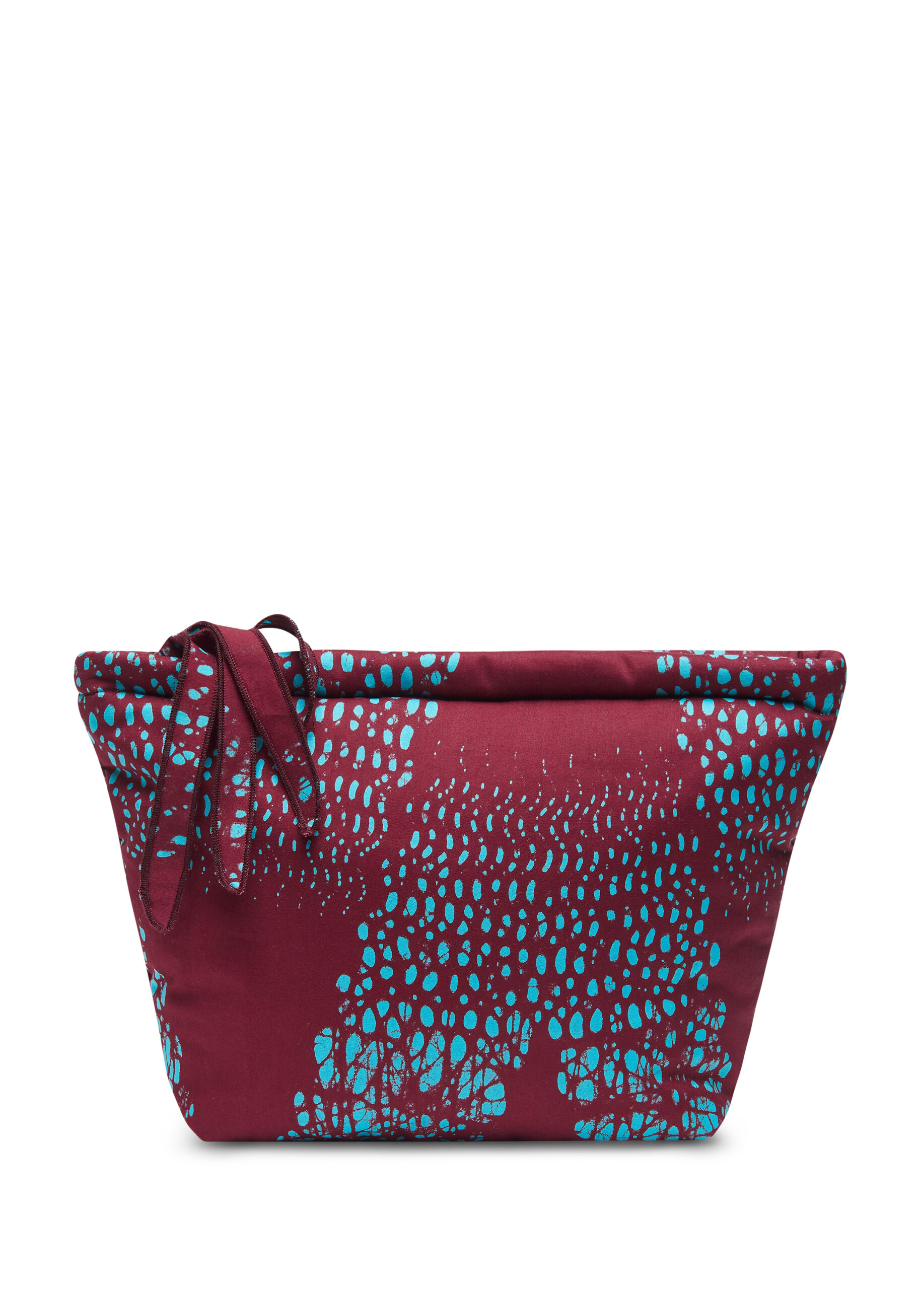 - Print and Colour: The exterior features a striking pattern of turquoise speckles against a deep maroon background, adding a dynamic and artistic flair to the bag.