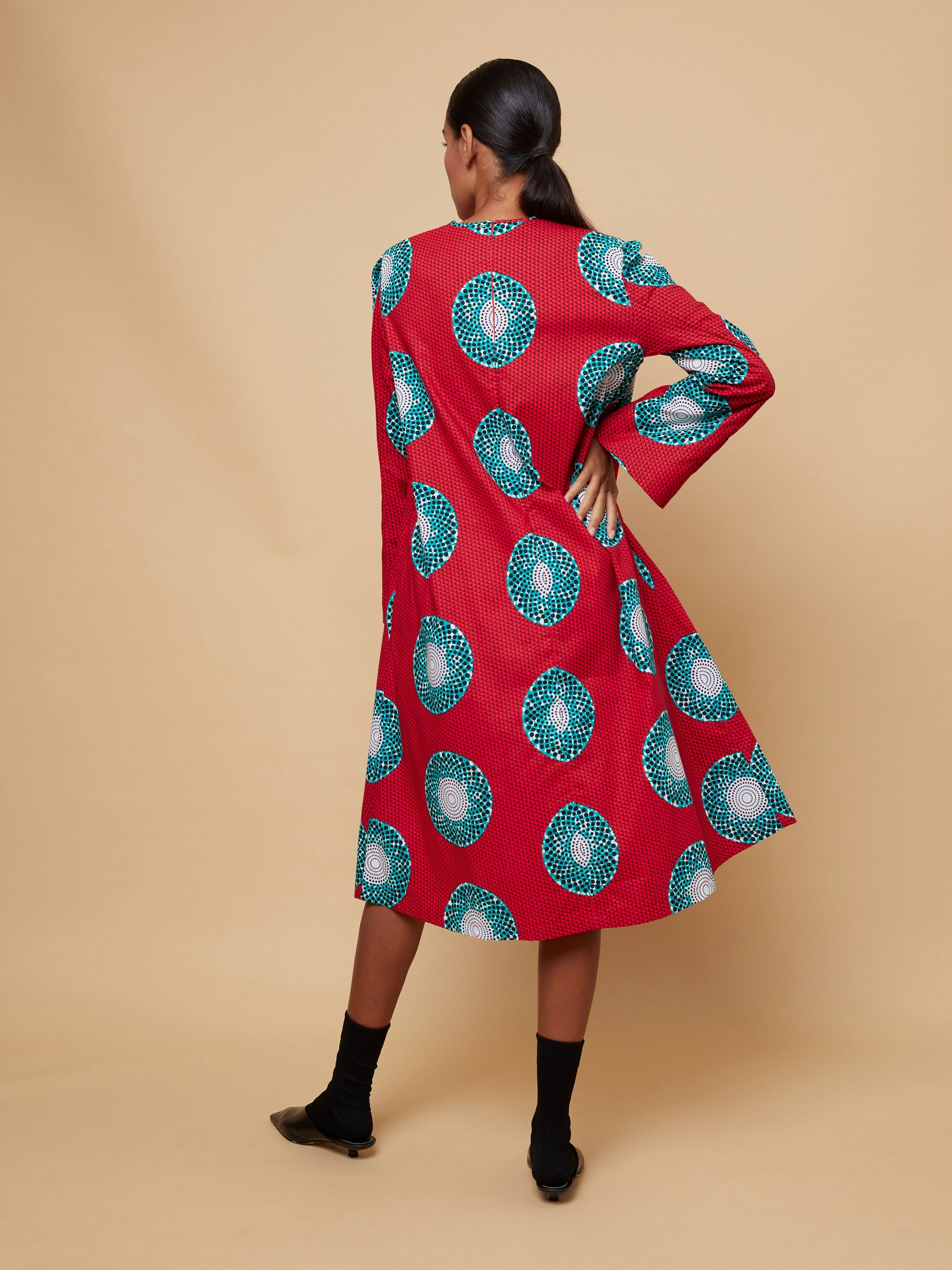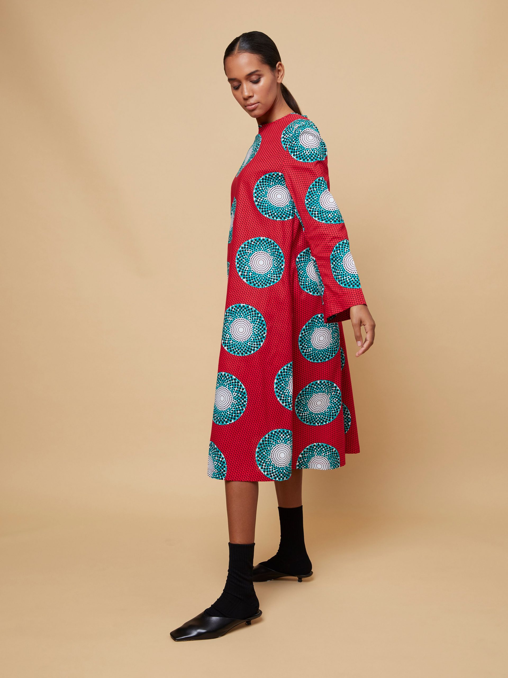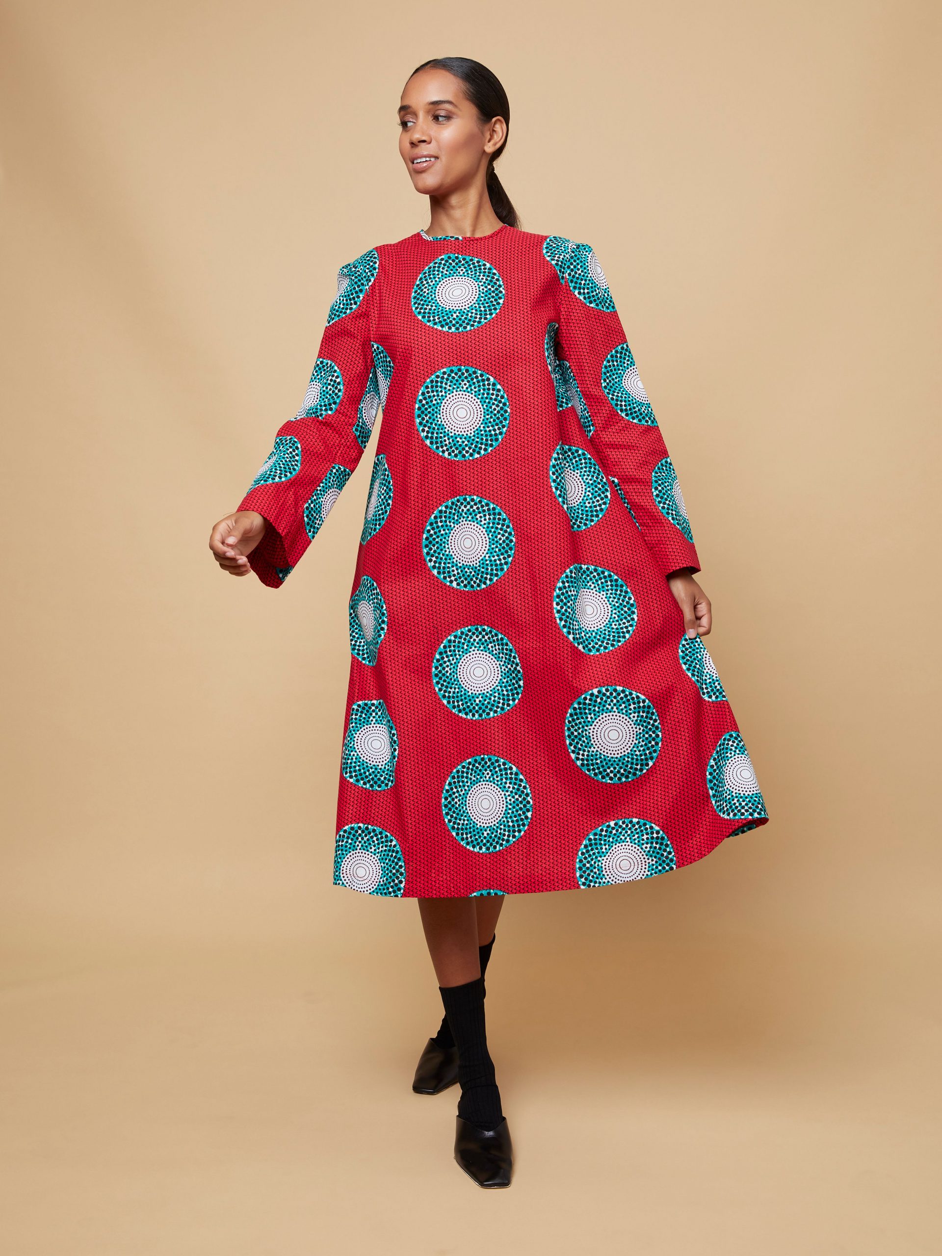 The smock, midi dress has a loose fit for a simple yet stylish look with a zipper at the back to close in the round neckline and make the dress more fitted around the chest before it billows out past the knee. The slightly slimmer, open cuff sleeve makes for a sleek silhouette.