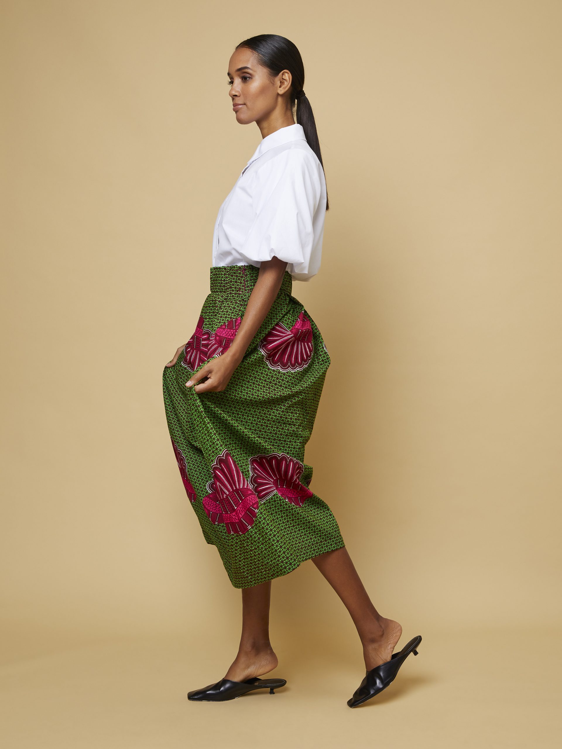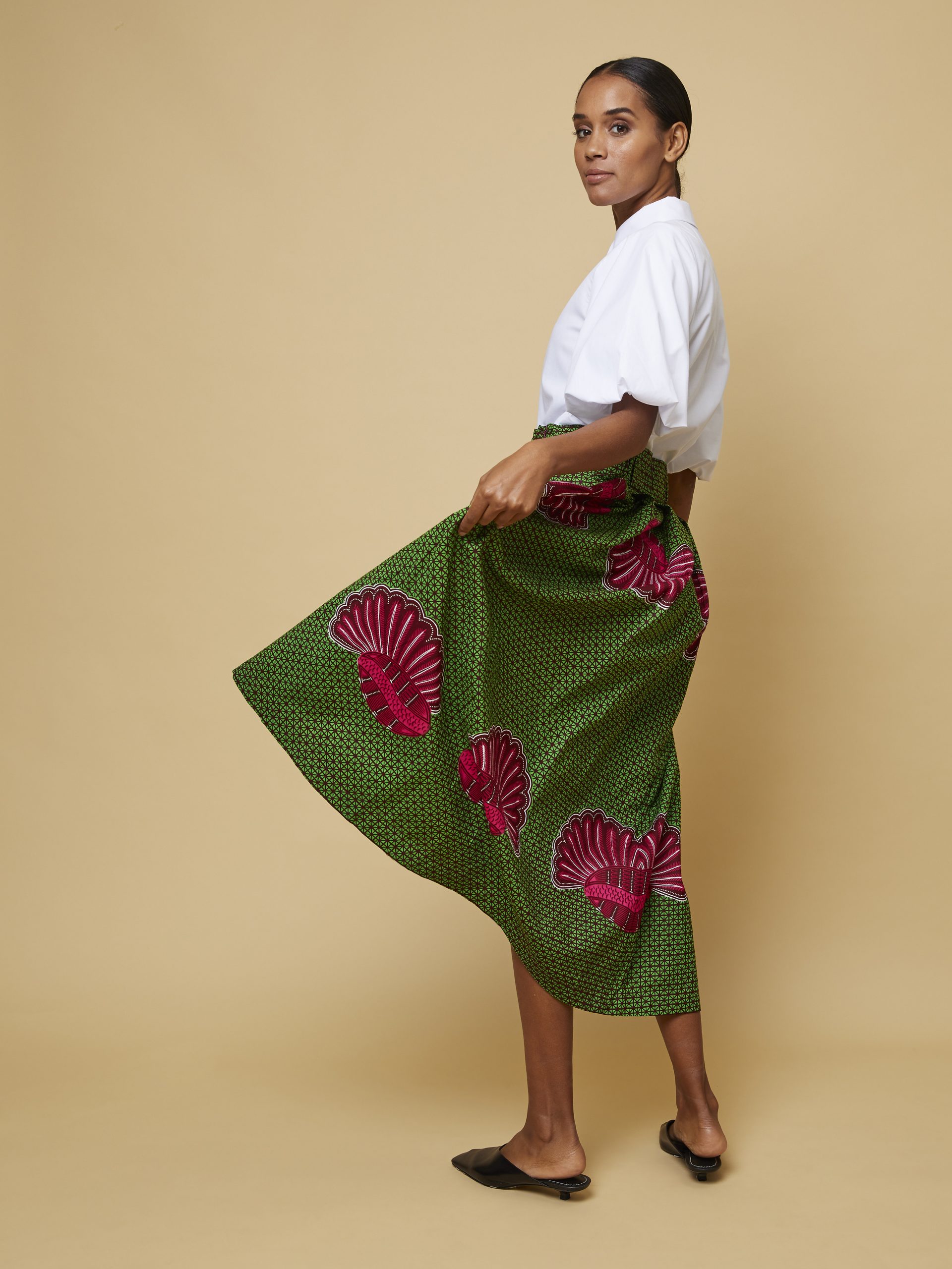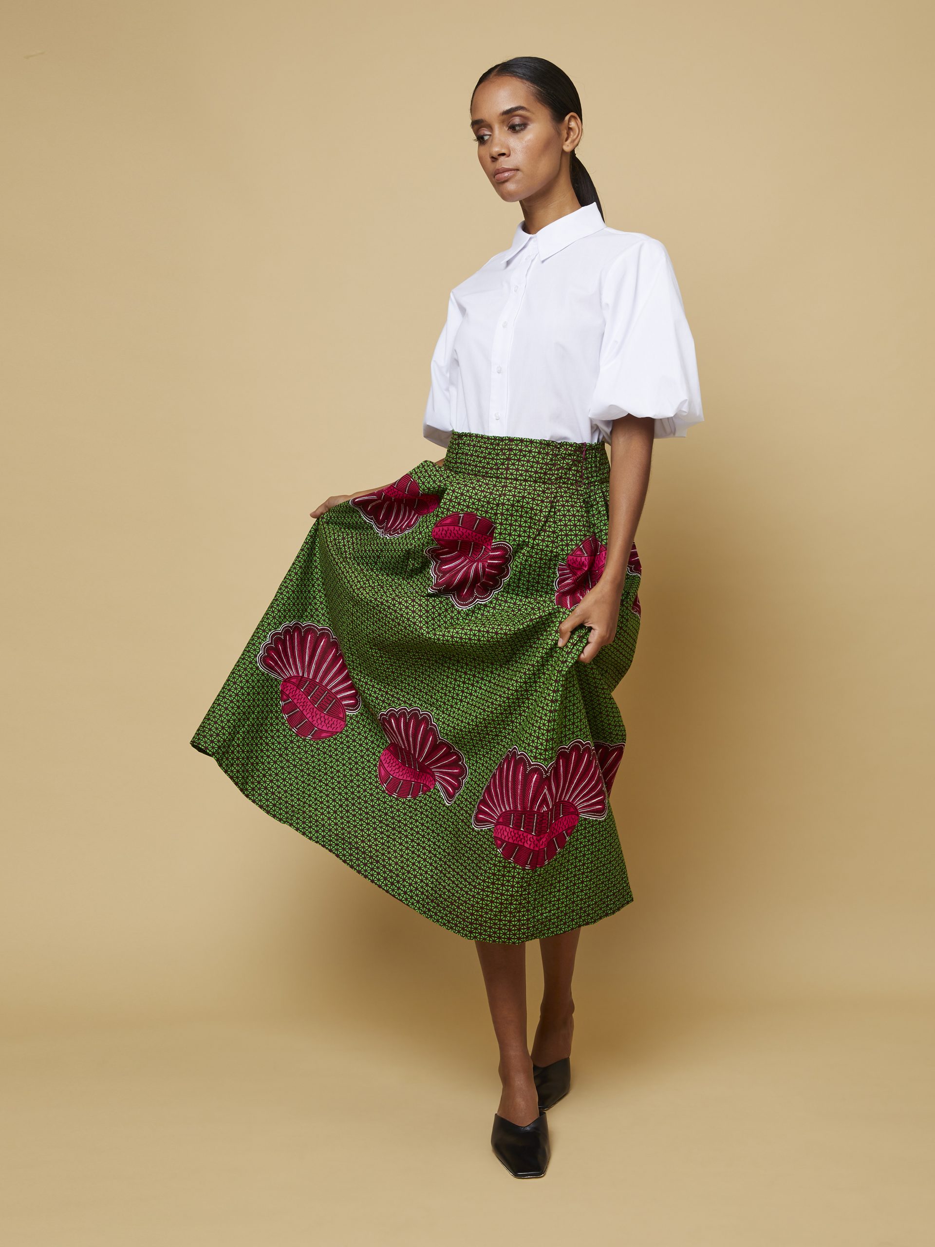This maxi skirt creates a chic silhouette and can be paired with a plain t-shirt as a statement piece or a clashing print as a celebration of boldness. This cage-like pattern in Kelly green gives the fabric an immediate fun and retro look. Patterned with stylistic floral accents, the fabric is given a softer, ditsy style.