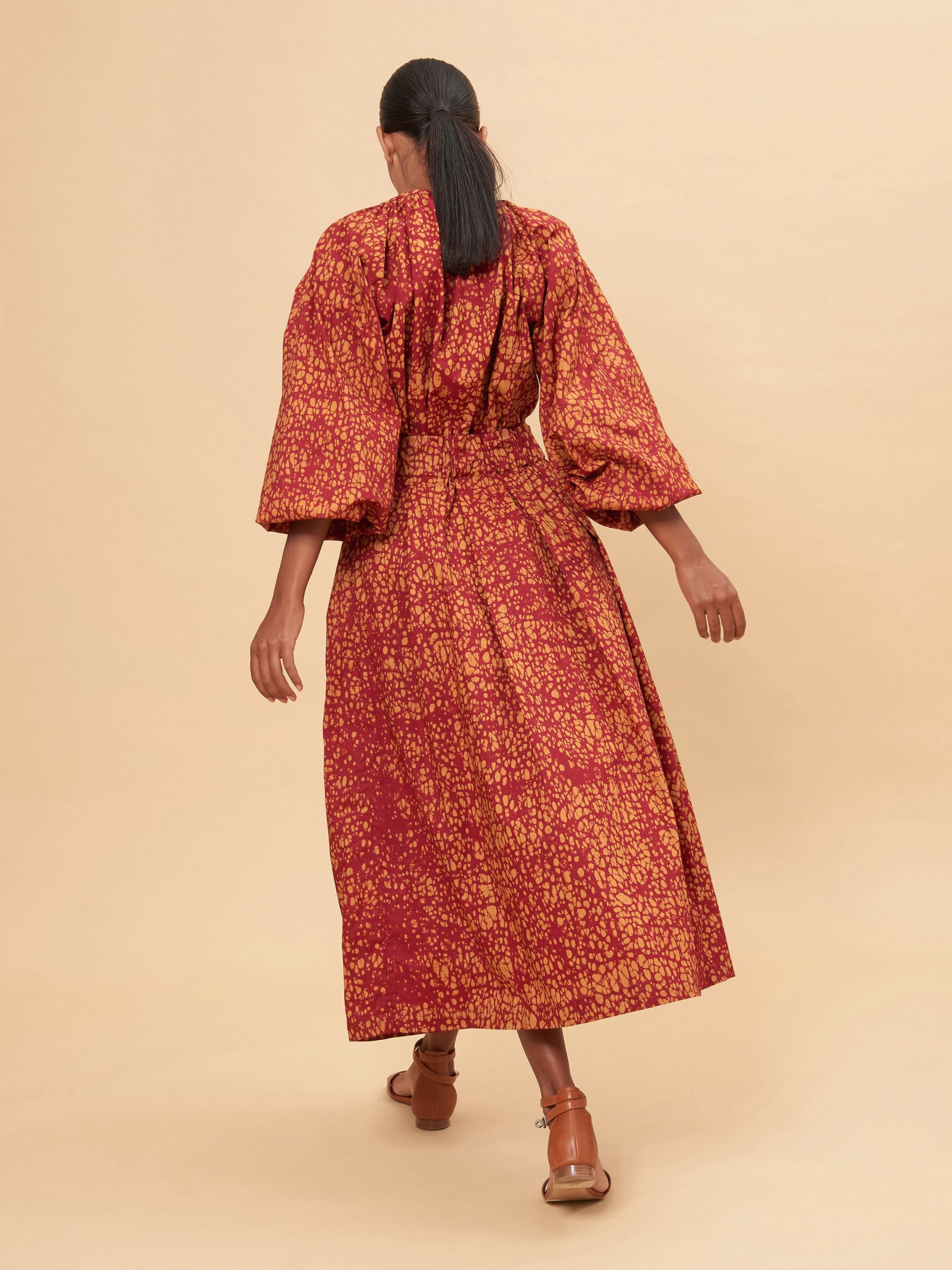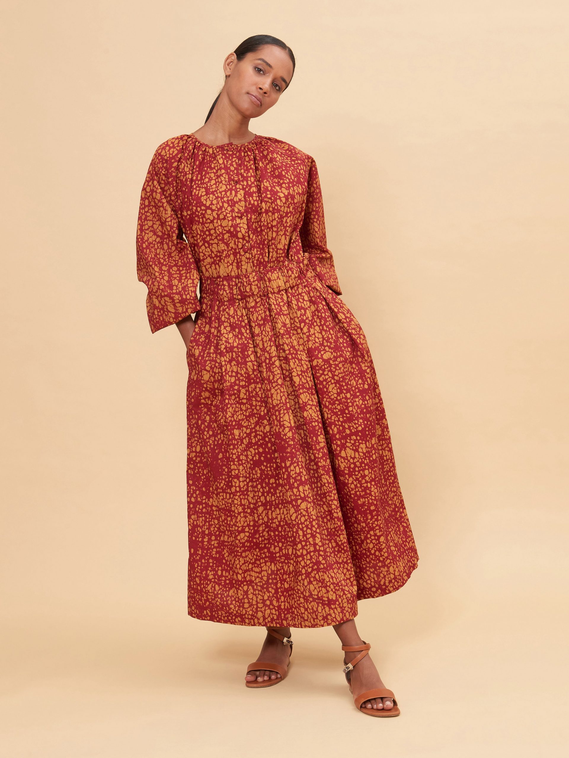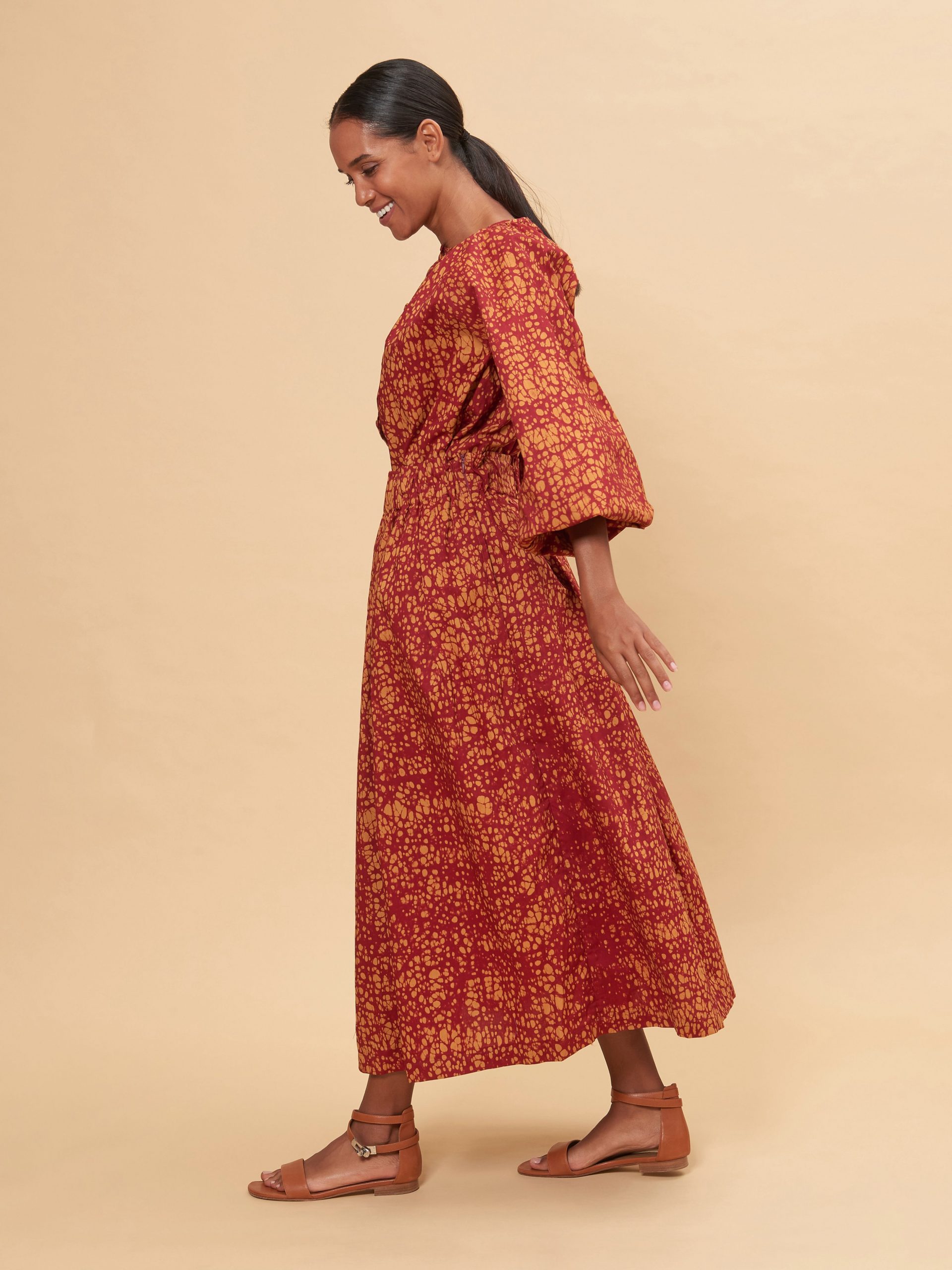 This maxi skirt creates a chic silhouette and can be paired with a plain t-shirt as a statement piece or a clashing print as a celebration of boldness. Made from 100% cotton, this fabric features a bold and uplifting craquelure effect pattern in orange and burgundy.