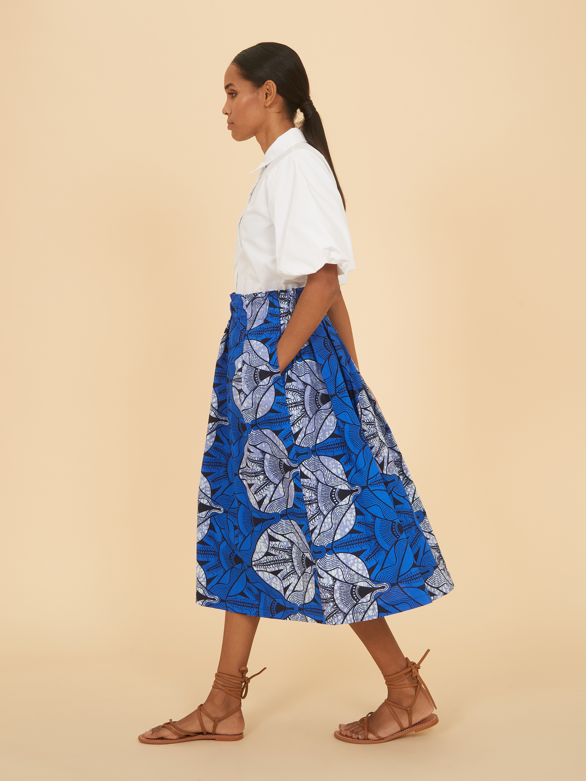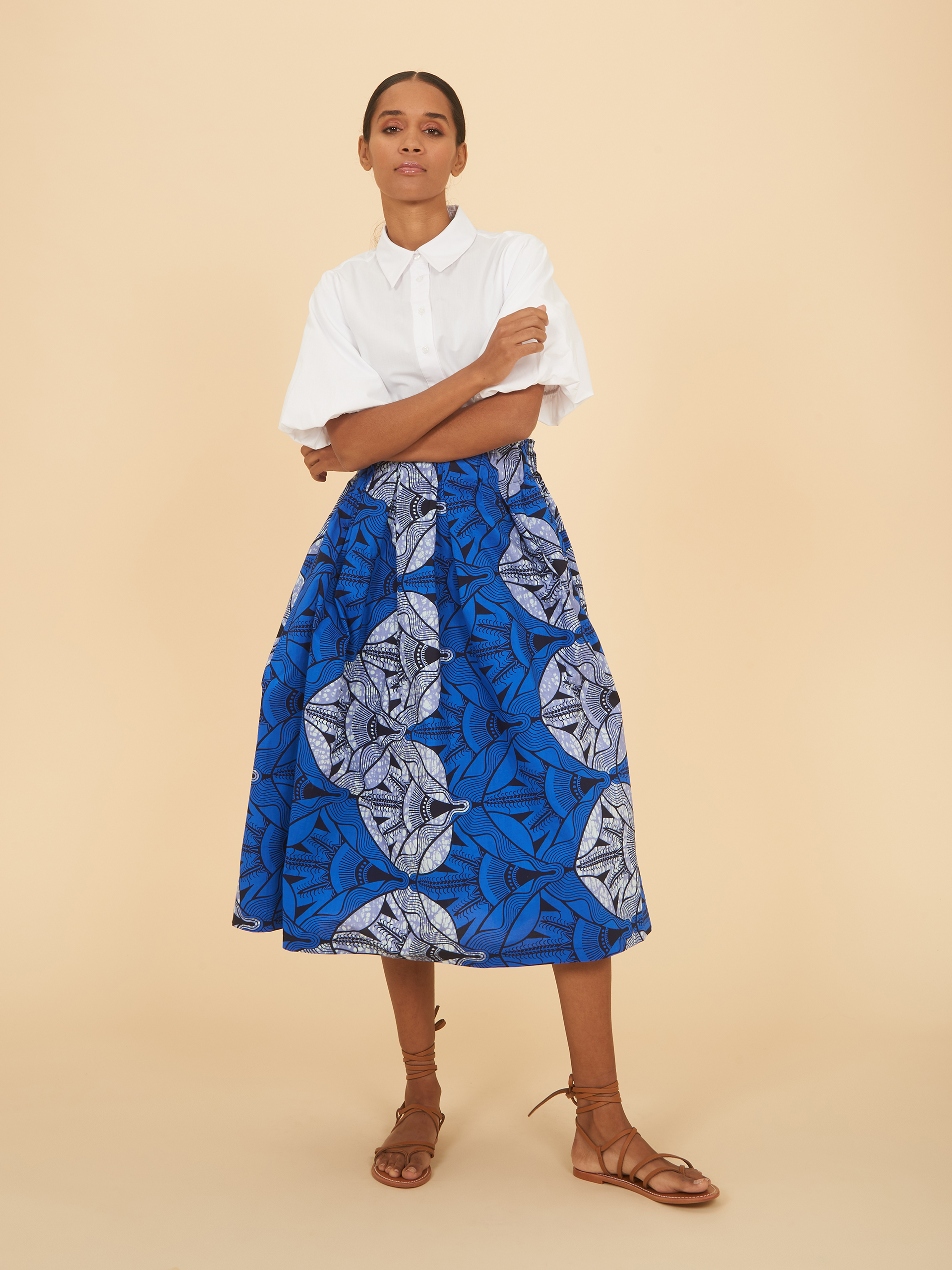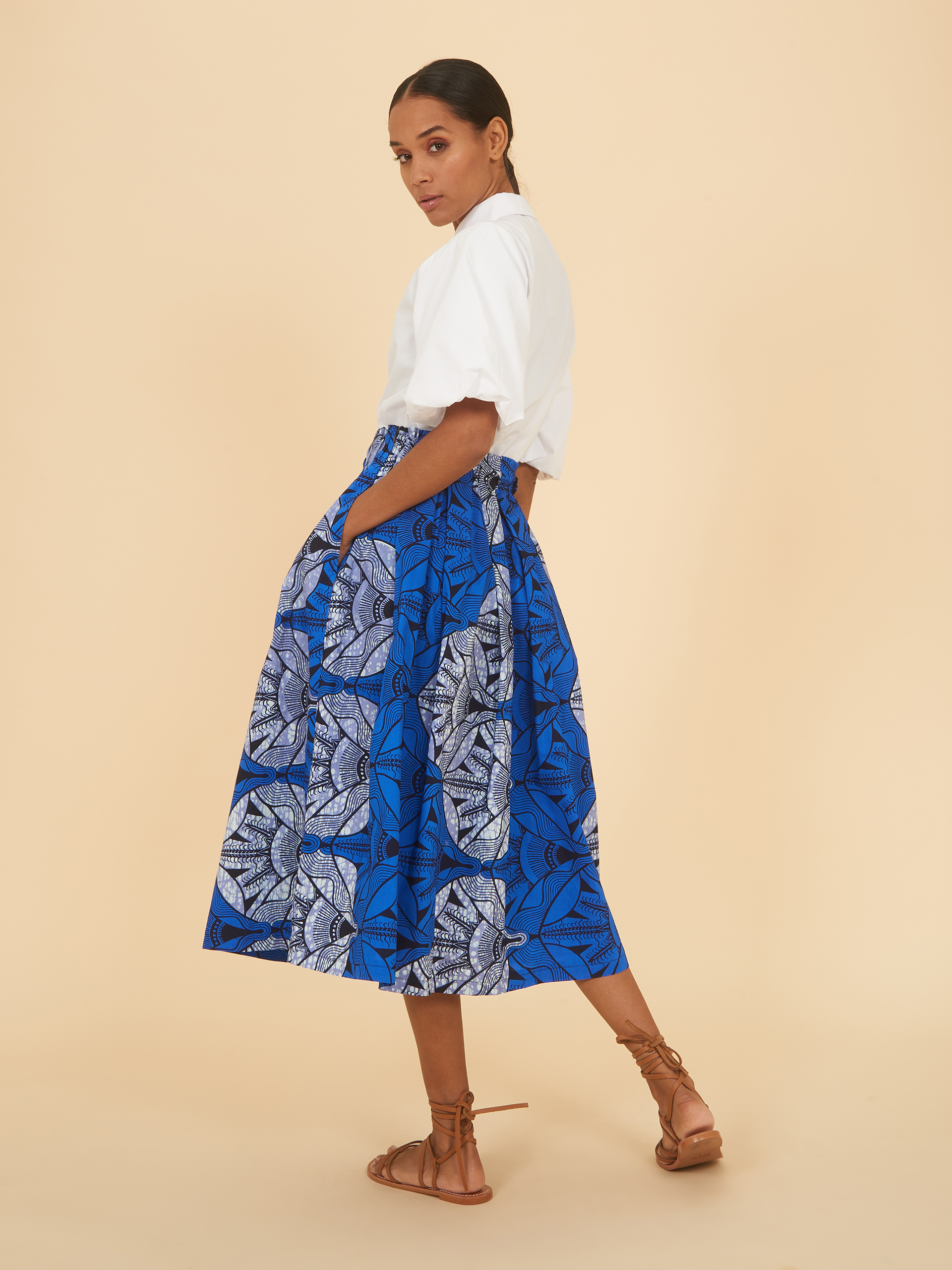 This midi skirt creates a chic silhouette and can be paired with a plain t-shirt as a statement piece or a clashing print as a celebration of boldness. Printed with an understated traditional design in a solid and speckled series of blues, this refined pattern effortlessly elevates style.