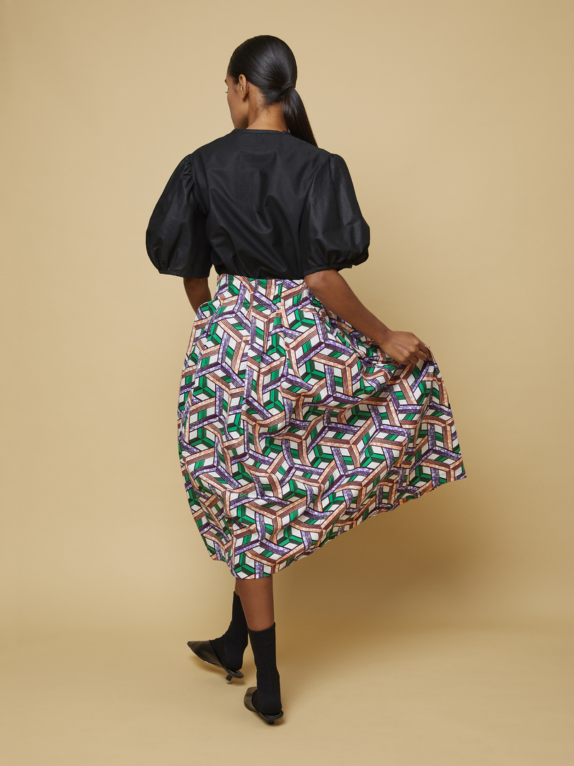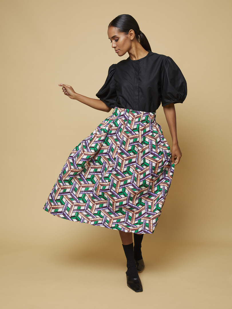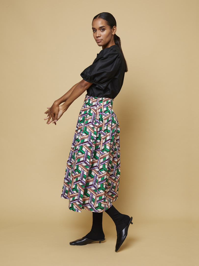 This midi skirt creates a chic silhouette with a high waist and pleats. It can be paired with a plain t-shirt as a statement piece or a clashing print as a celebration of boldness. This geometric pattern is an engineering event with contrasting colours of peach, lilac and emerald green. The bars, shaded with scarlet lines, create a strong statement for a structural style.