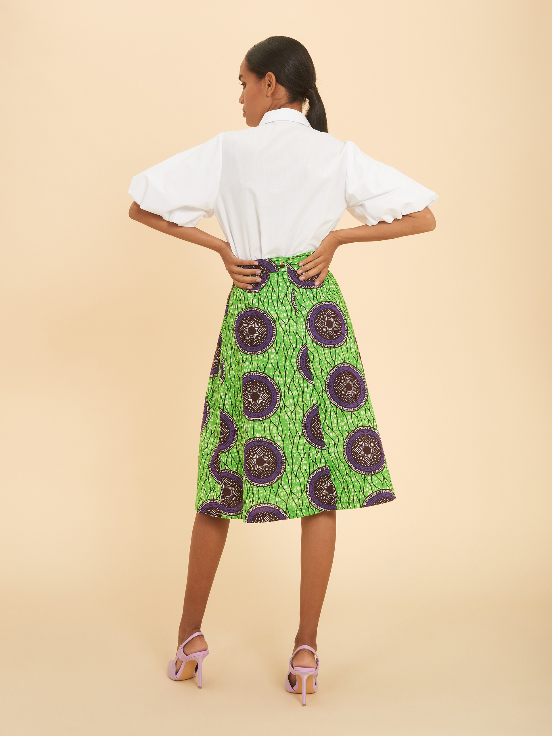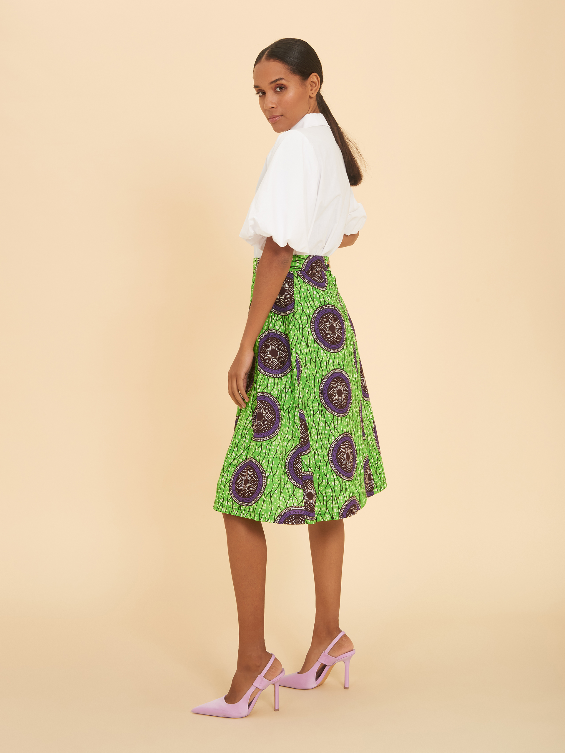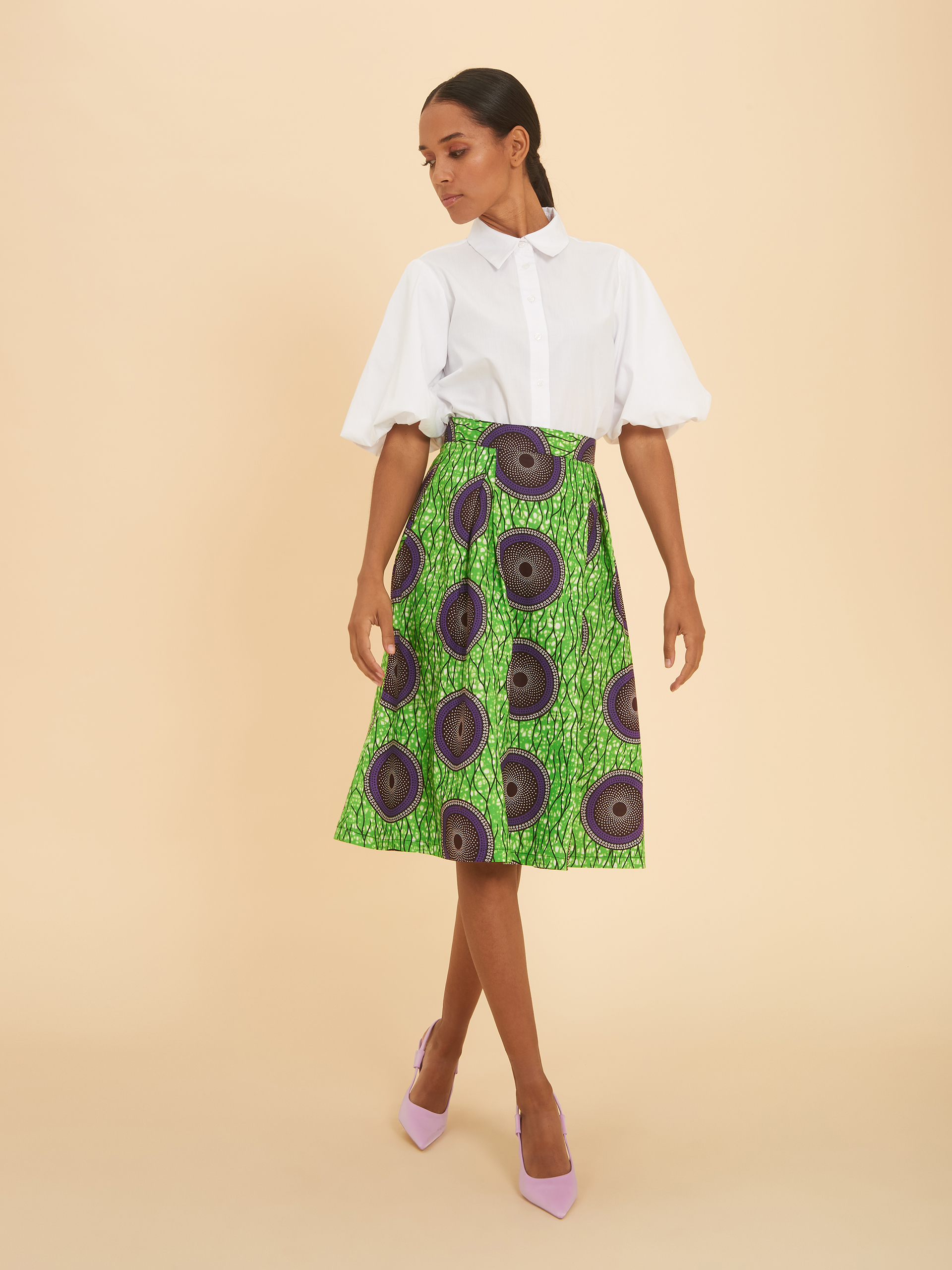This above the ankle skirt creates a chic silhouette and can be paired with a plain t-shirt as a statement piece or a clashing print as a celebration of boldness. This bright and adventurous pattern explores its shapes in a playful colourway.