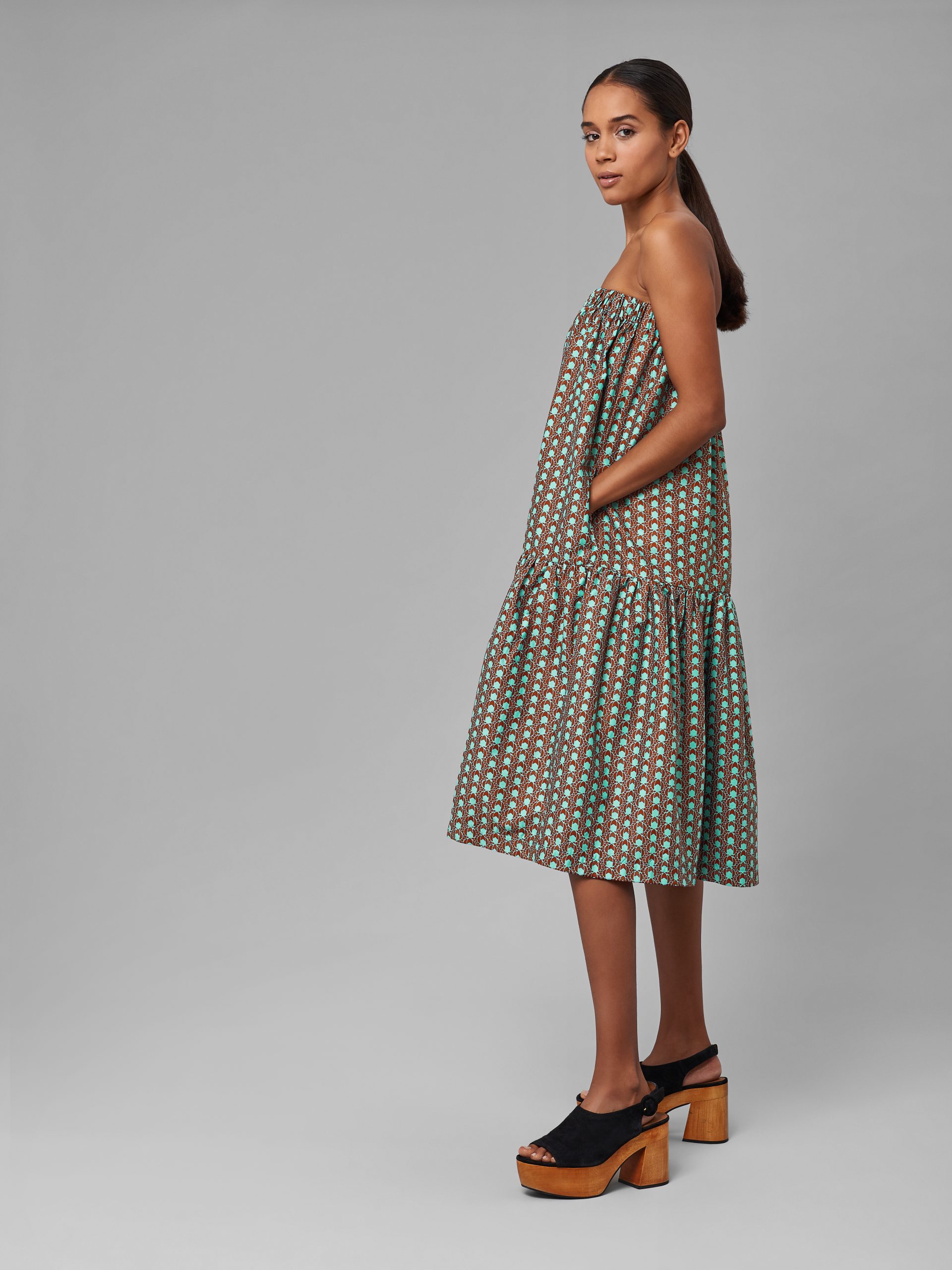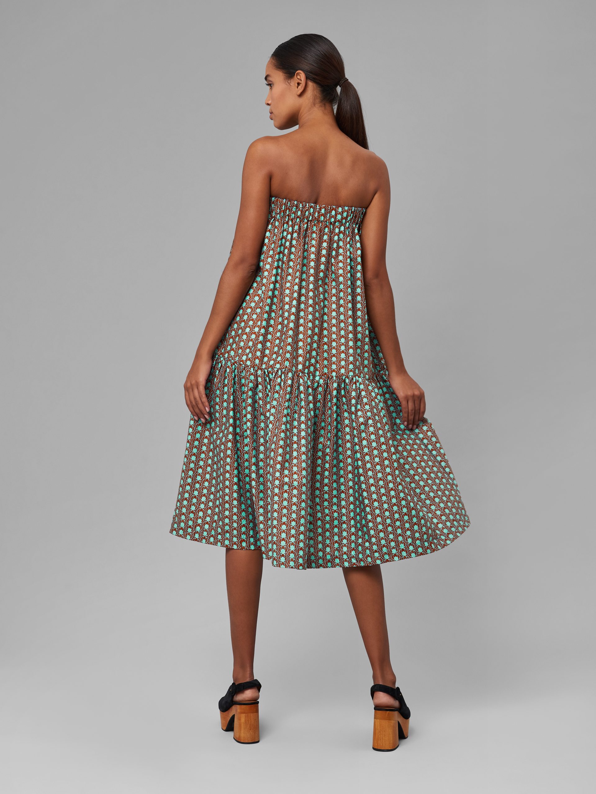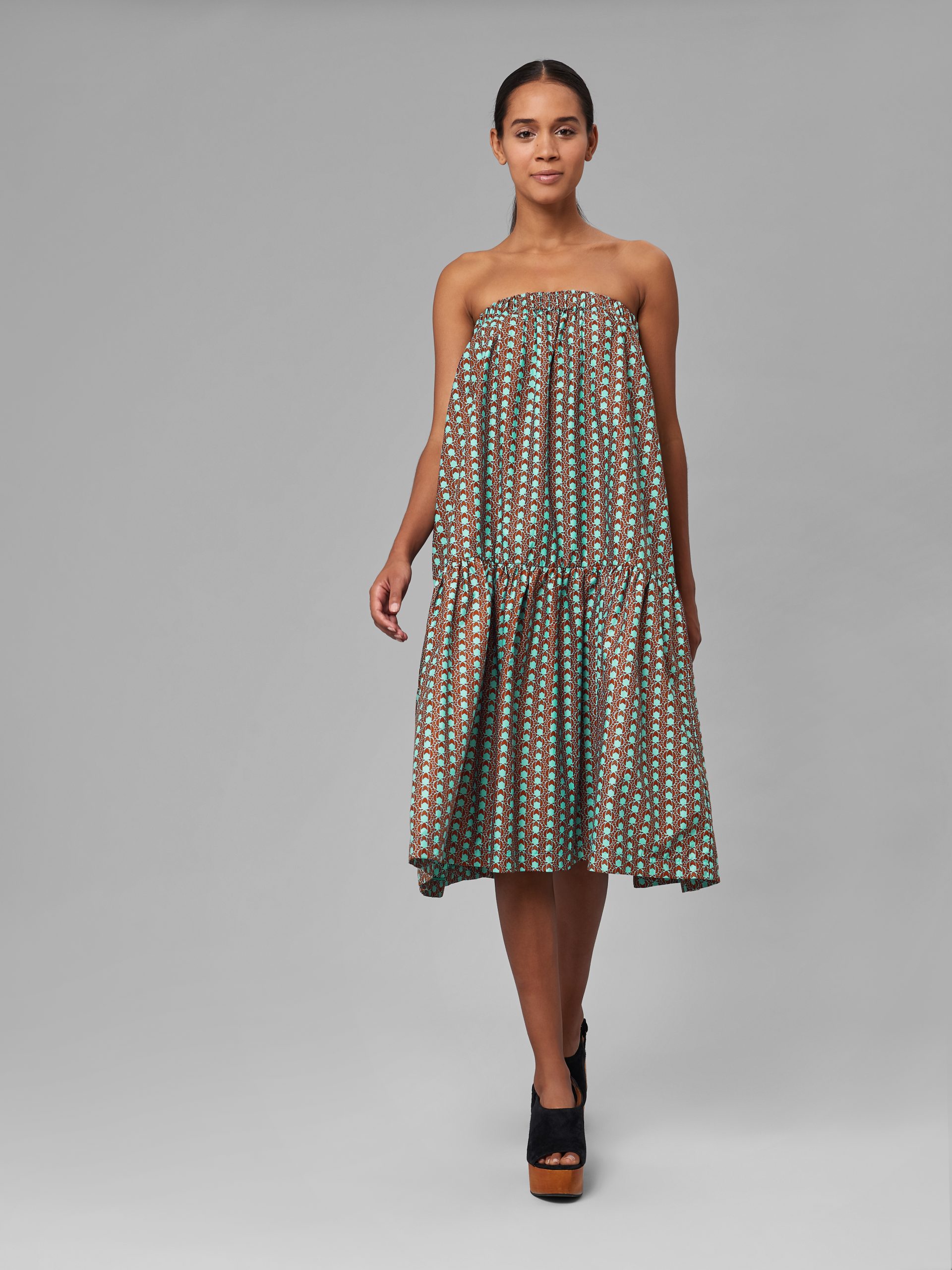 This flouncy strapless dress is a must in every summer wardrobe and can be paired with a blazer or long coat on a cool summer night. This fabric has a brown backdrop with a turquoise pattern, creating a simple yet vivacious and fun look.