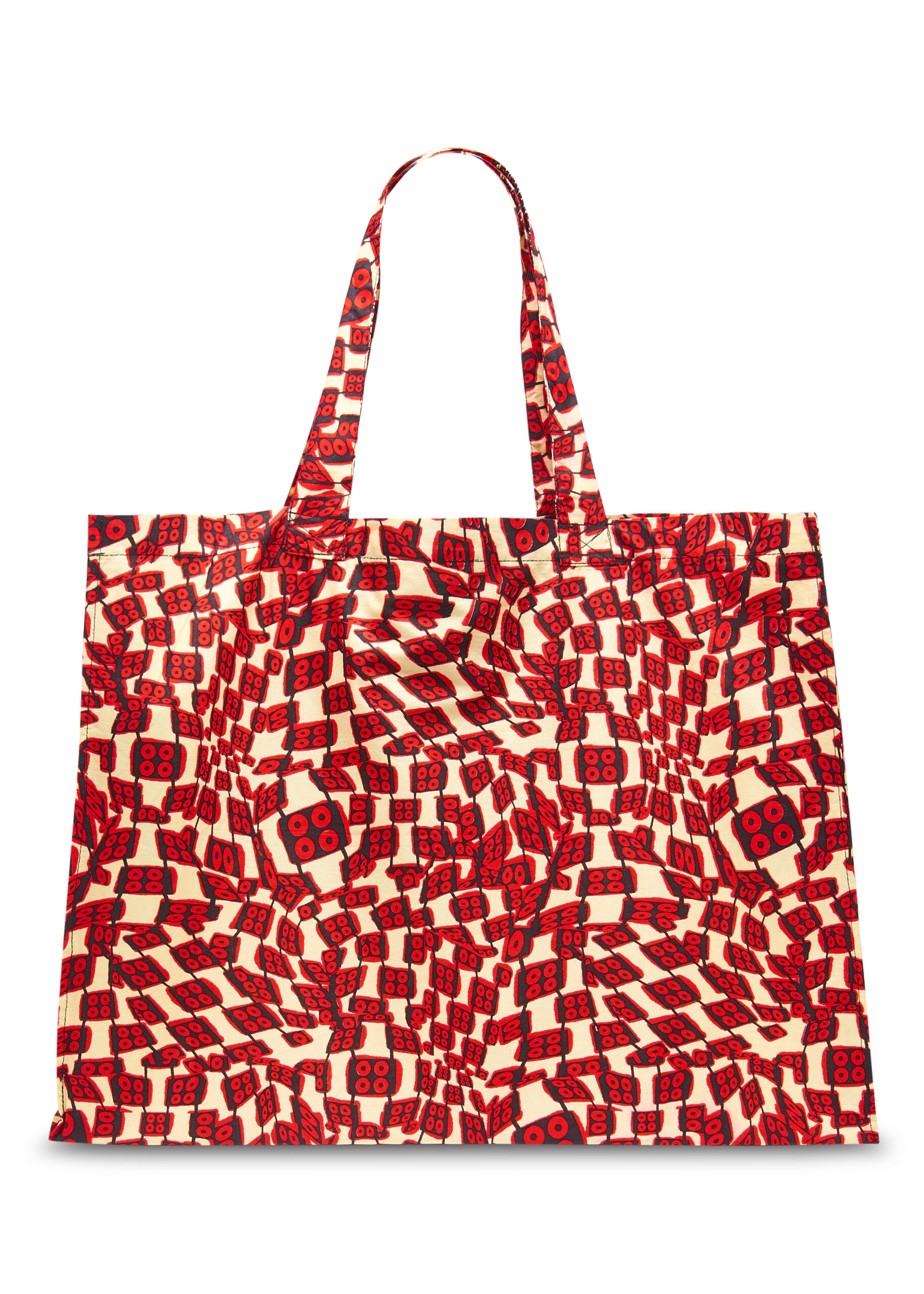 - Print and Colour: The exterior features a vibrant pattern of red geometric shapes interspersed with white, creating a bold and dynamic look that adds a touch of artistic flair to the bag.