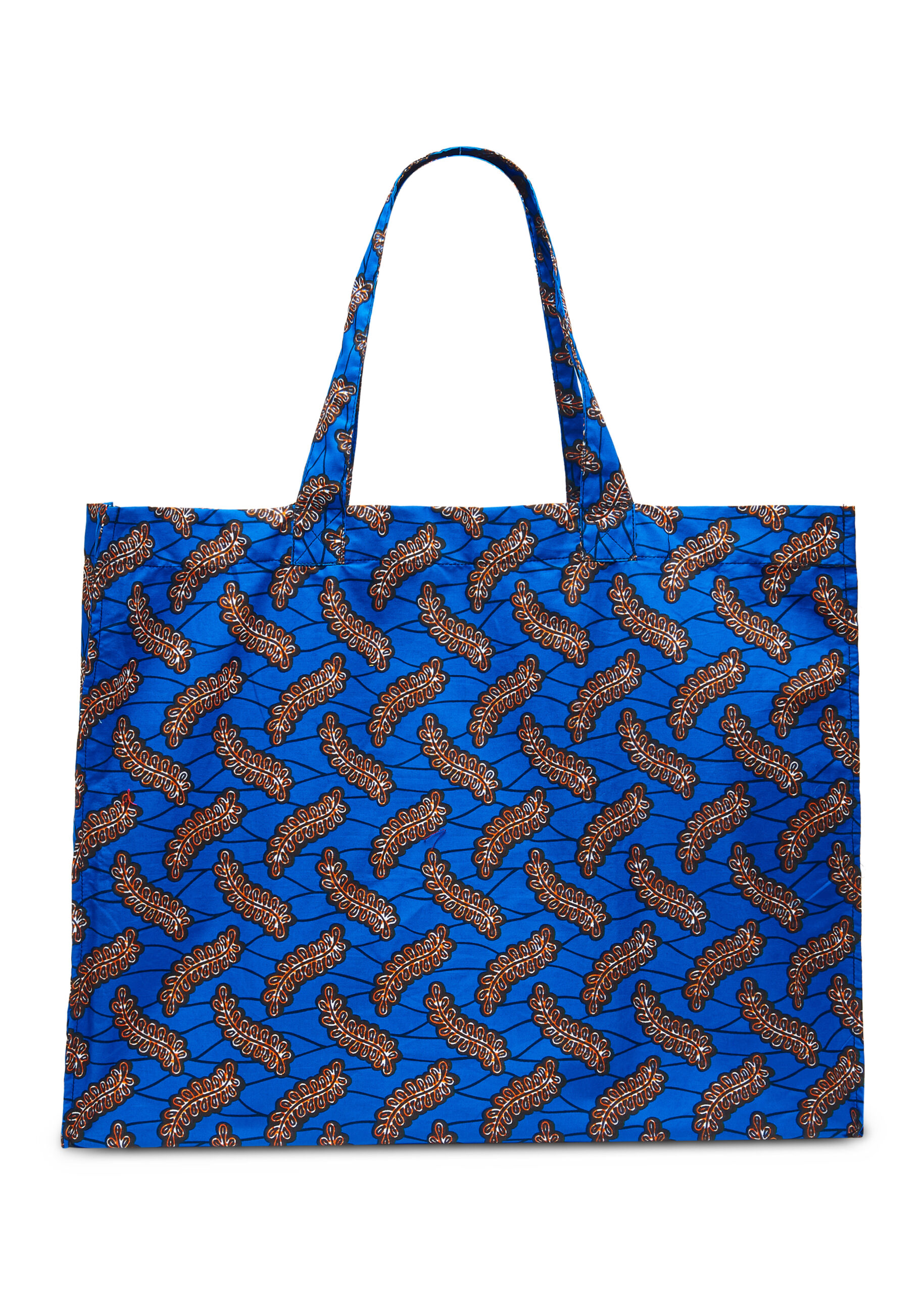 - Print and Colour: The exterior showcases a rich blue background adorned with intricate brown and orange floral motifs, adding a sophisticated and artistic touch to the bag.