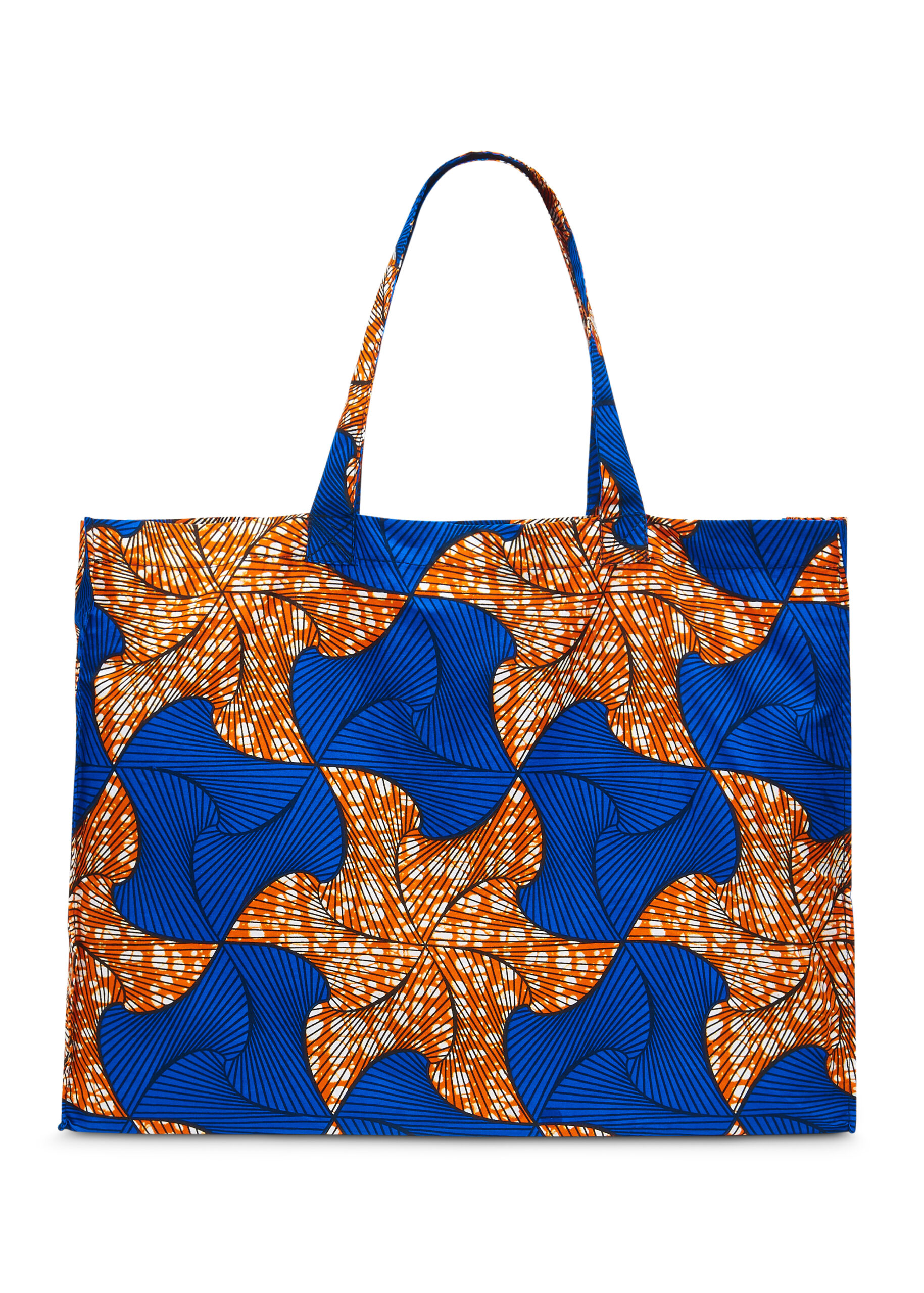 - Print and Colour: The exterior displays a bold and vibrant pattern with alternating blue and orange fan-like shapes. This dynamic design creates a striking visual effect, adding a touch of artistic flair to the bag.