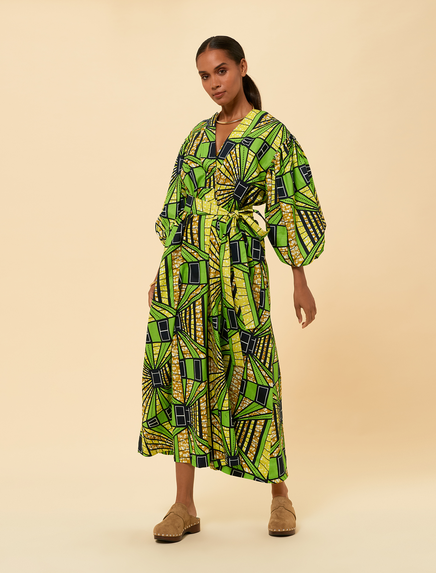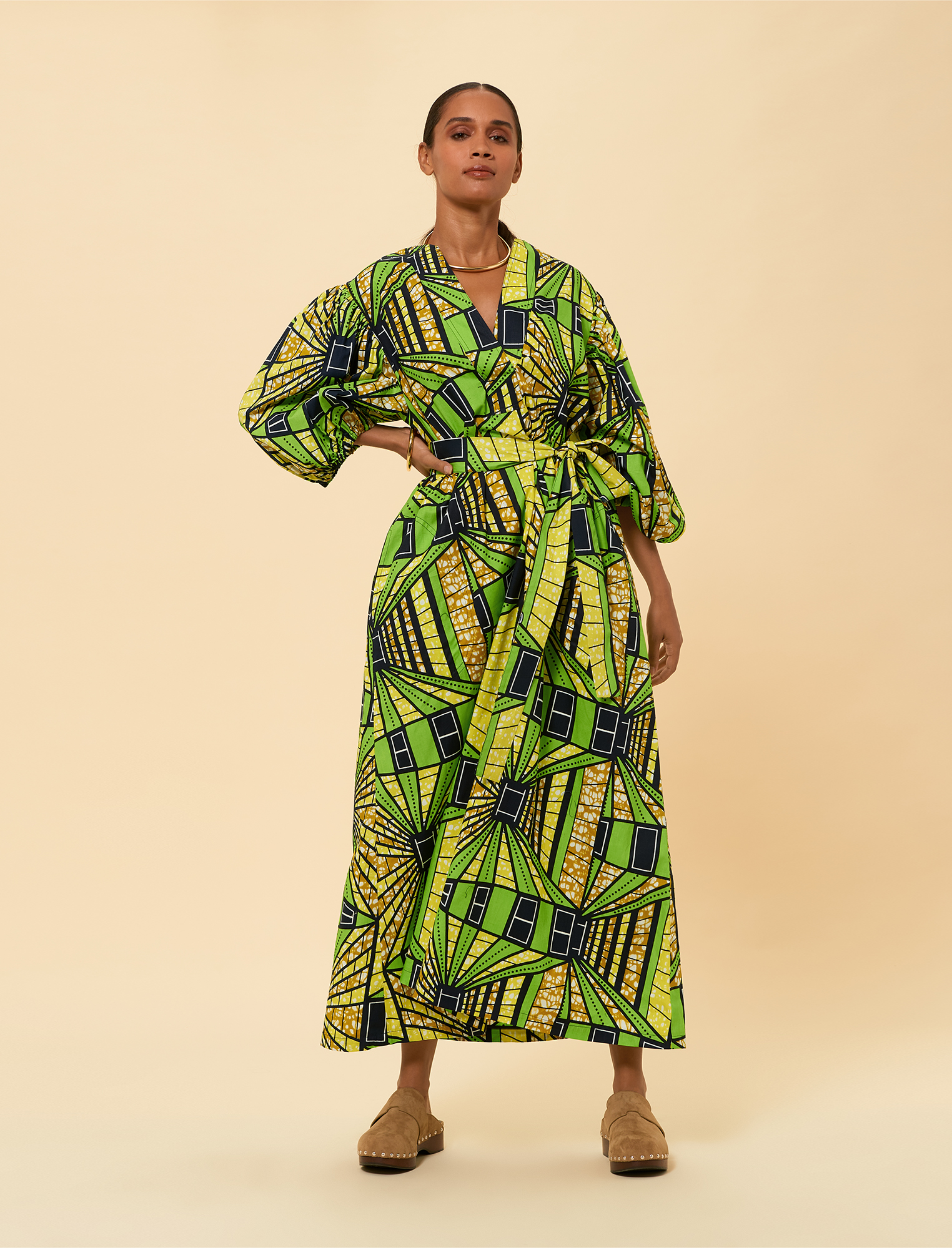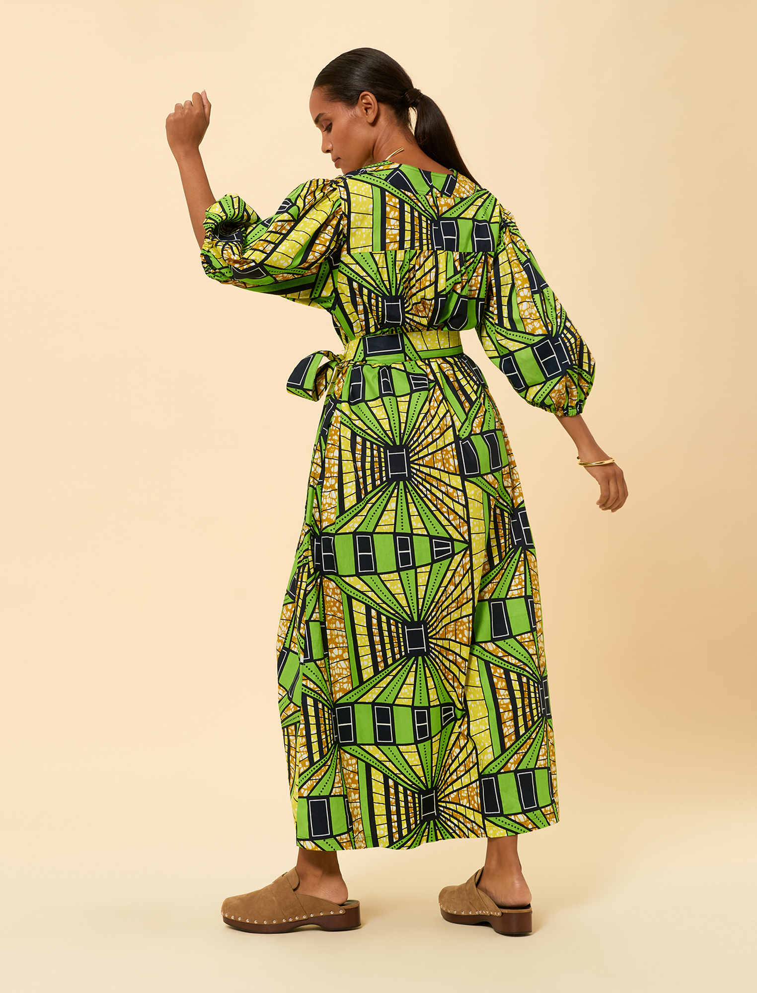 Highlighted by a vivid green background, this wax print fabric features a striking geometric pattern. The design incorporates bold black, yellow, and white elements with intricate details, creating a visually dynamic and modern aesthetic. The lightweight and breathable material ensures comfort while adding a touch of sophistication.