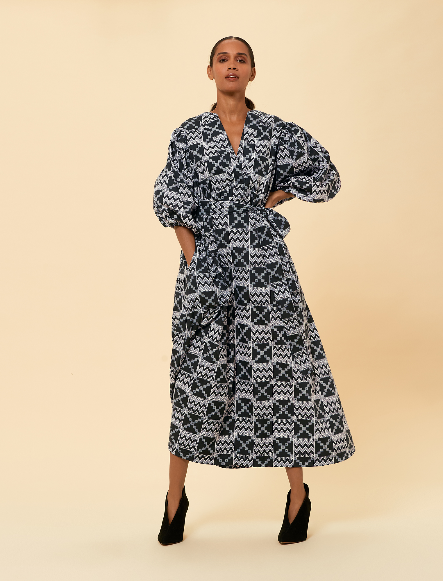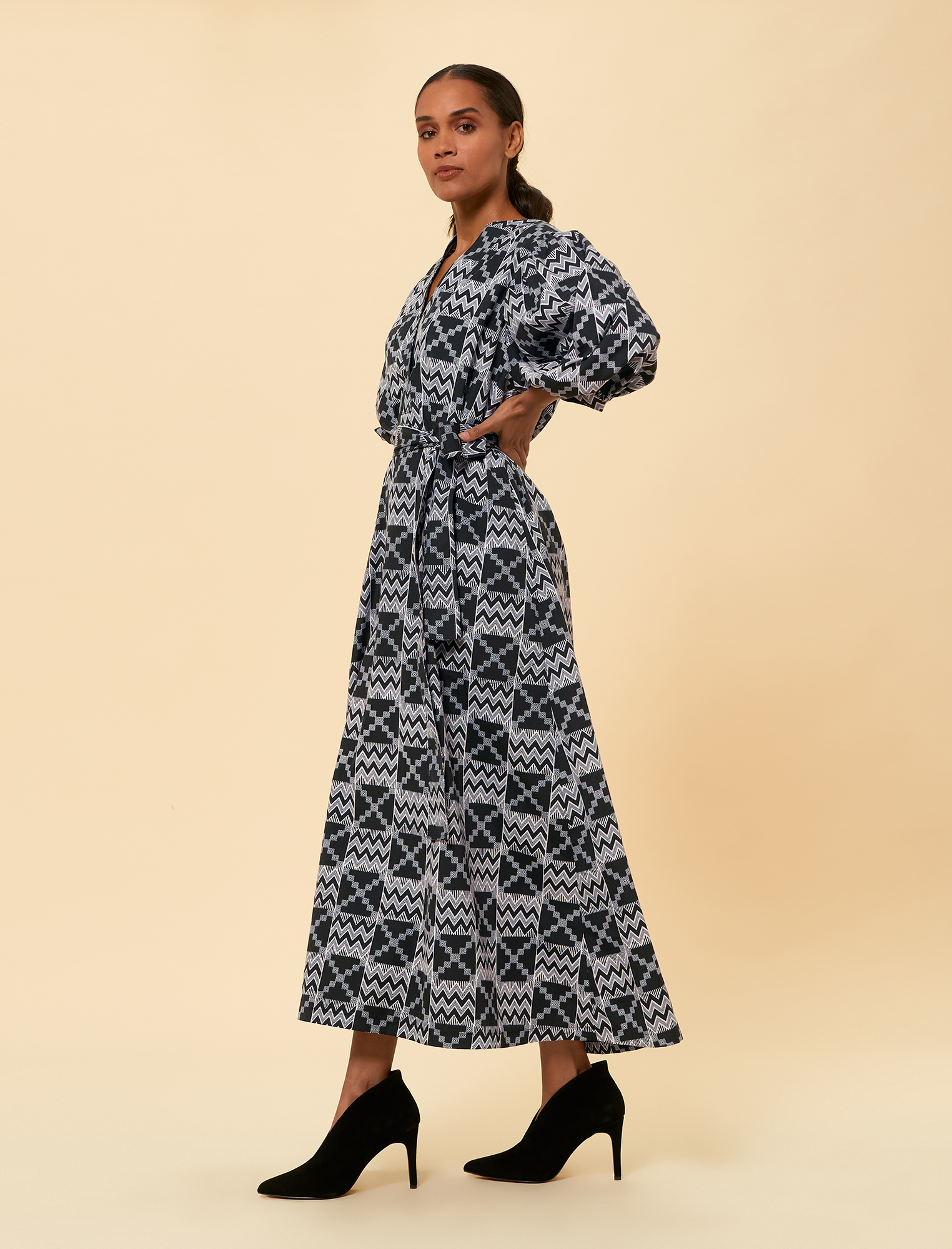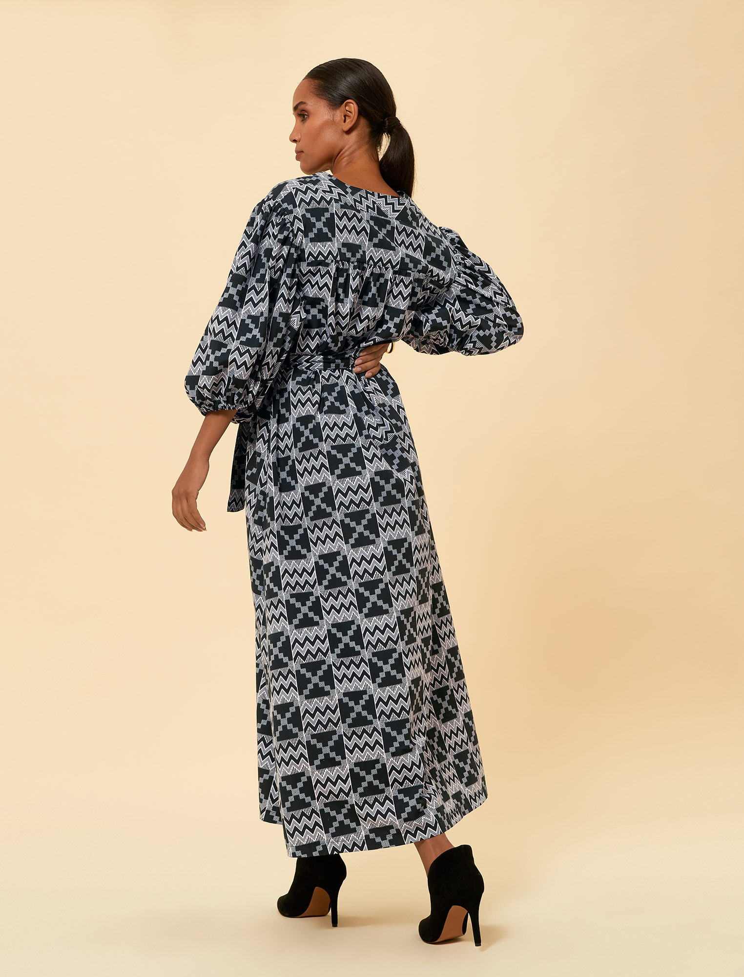The fabric is a wax print featuring a sophisticated black and white colour scheme. It showcases a complex geometric pattern with zigzag and cross motifs, adding depth and visual interest. The lightweight and breathable material ensures comfort, making it perfect for all-day wear.