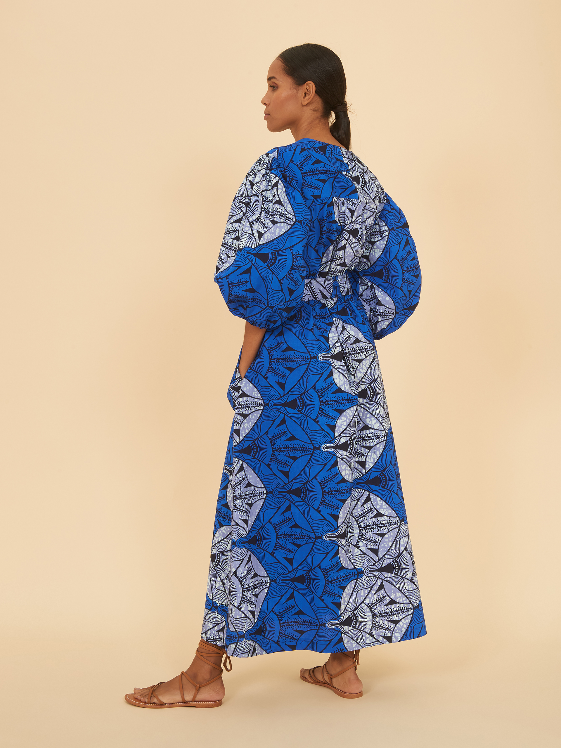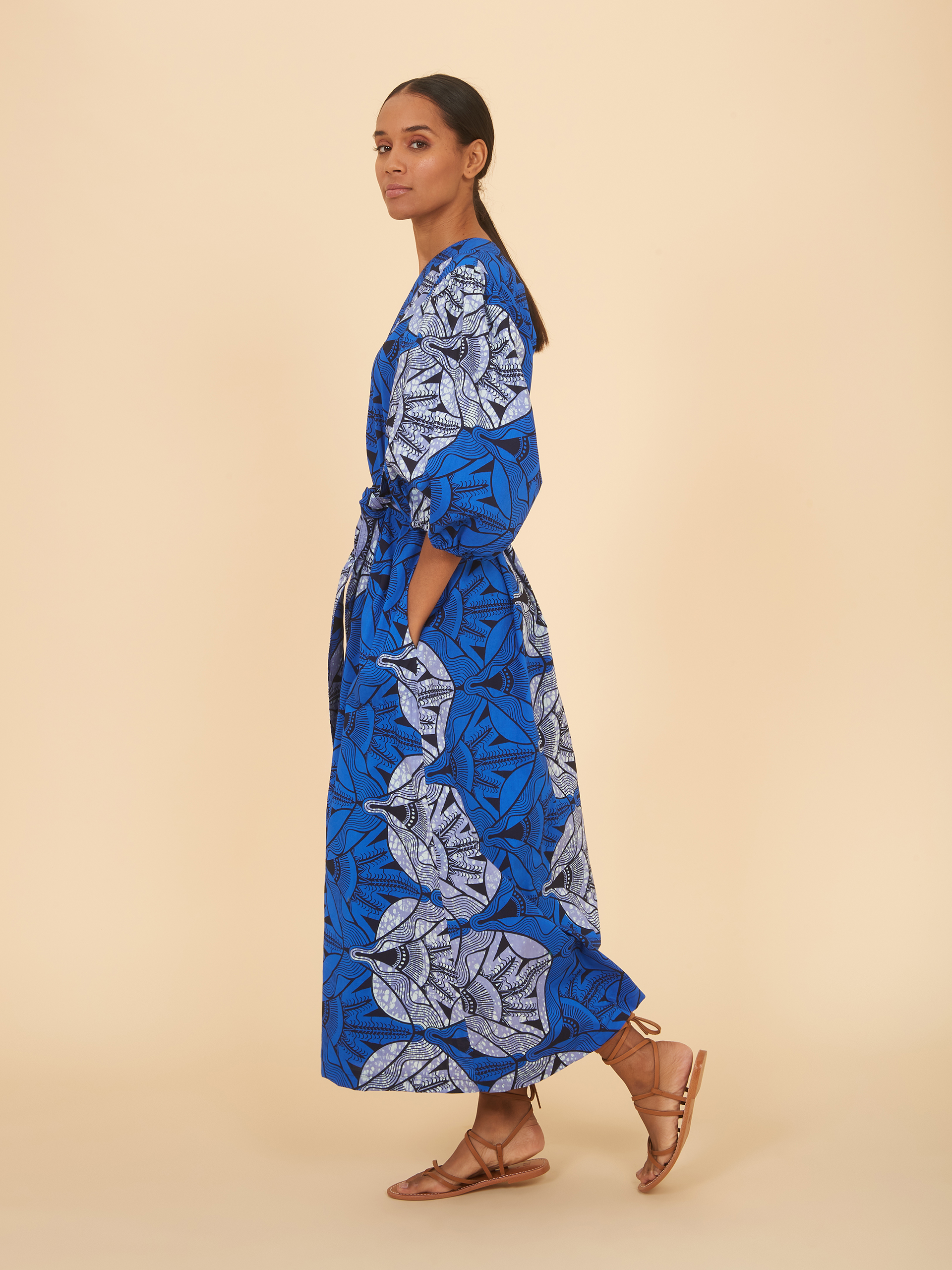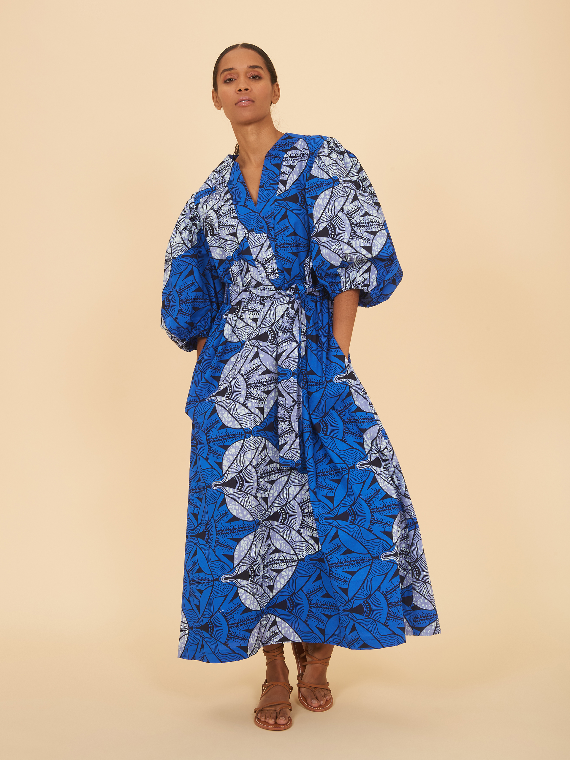 This dress features a deep v neckline and long skirt with pockets that flows down below the calf. The waist is belted and the bishop sleeves are shorter, stopping just past the elbow. Dyed with an understated traditional design in a solid and speckled series of blues, this refined pattern effortlessly elevates style.